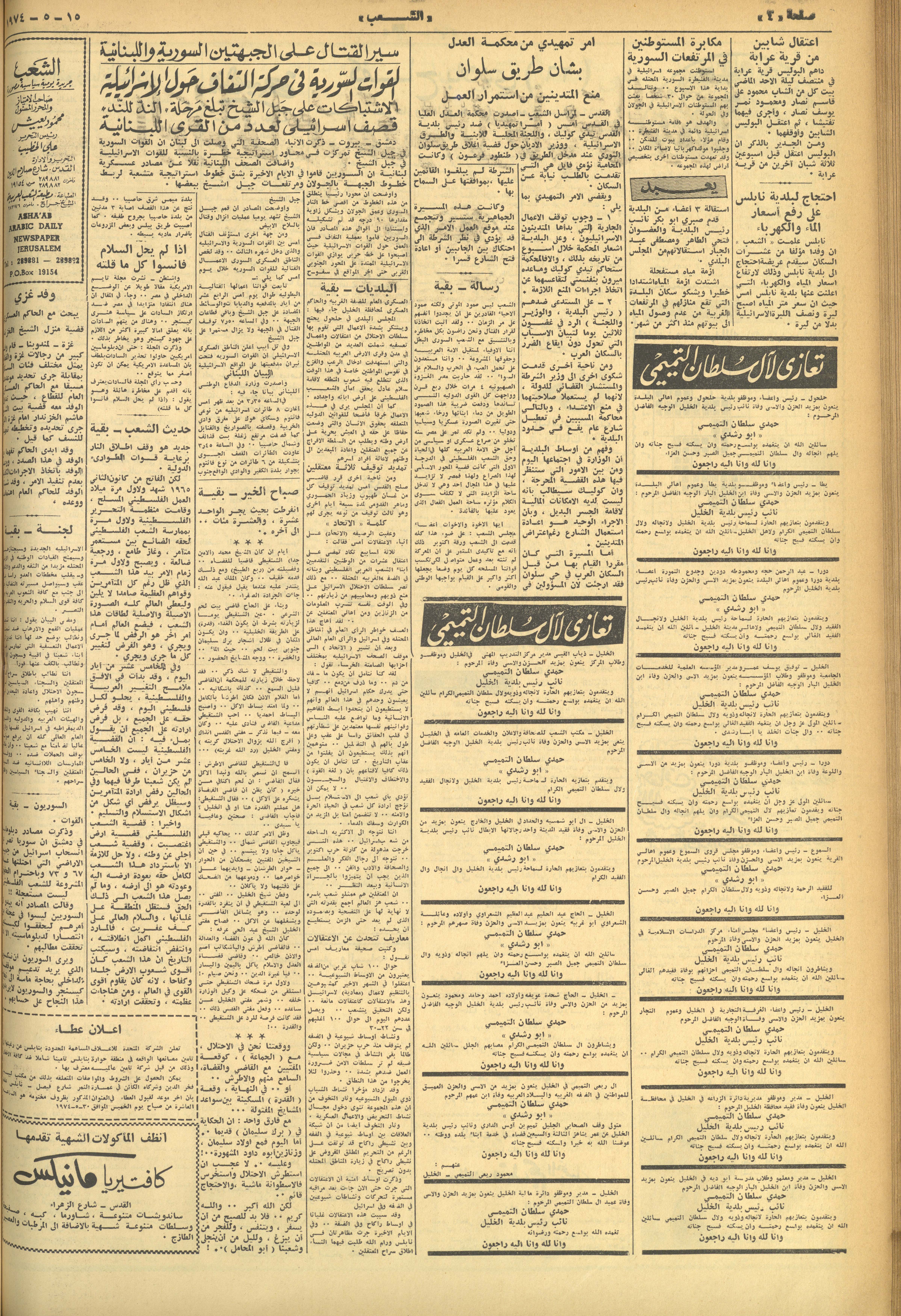 وثيقة مطبوعة باللغة العربية، مكونة من 4 صفحات، تتضمن العدد 537 من جريدة الشعب الصادر بتاريخ 15 أيار 1974، وهي جريدة يومية سياسية مصورة تصدر في القدس، بلغ ثمن العدد 40 أغورة واشتمل على مجموعة من البيانات والإعلانات والدعايات والأخبار السياسية والرياضية، منها: - لجنة وطنية في عمان للدفاع عن المعتقلين في الأراضي المحتلة. - انفجار عنيف قرب القنصلية الأمريكية بالقدس. - البلديات والنقابات والهيئات والمواطنين يواصلون حملة الاحتجاج على الاعتقالات. - نقلاً عن صحيفة معاريف الإسرائيلية، الأردن يسعى لفصل القوات. - إسرائيل تعطل جميع محاولات السلام. - "كفاح بلادي (26)، مسؤولية مصر فاروق التاريخية في ظل معركة 1948"، مقال بقلم أحمد الحبش. - أمر تمهيدي من محكمة الاحتلال العليا في القدس بشأن طريق سلوان. - سلطات الاحتلال الإسرائيلي تعتقل شابين من قرية عرابة قضاء جنين.