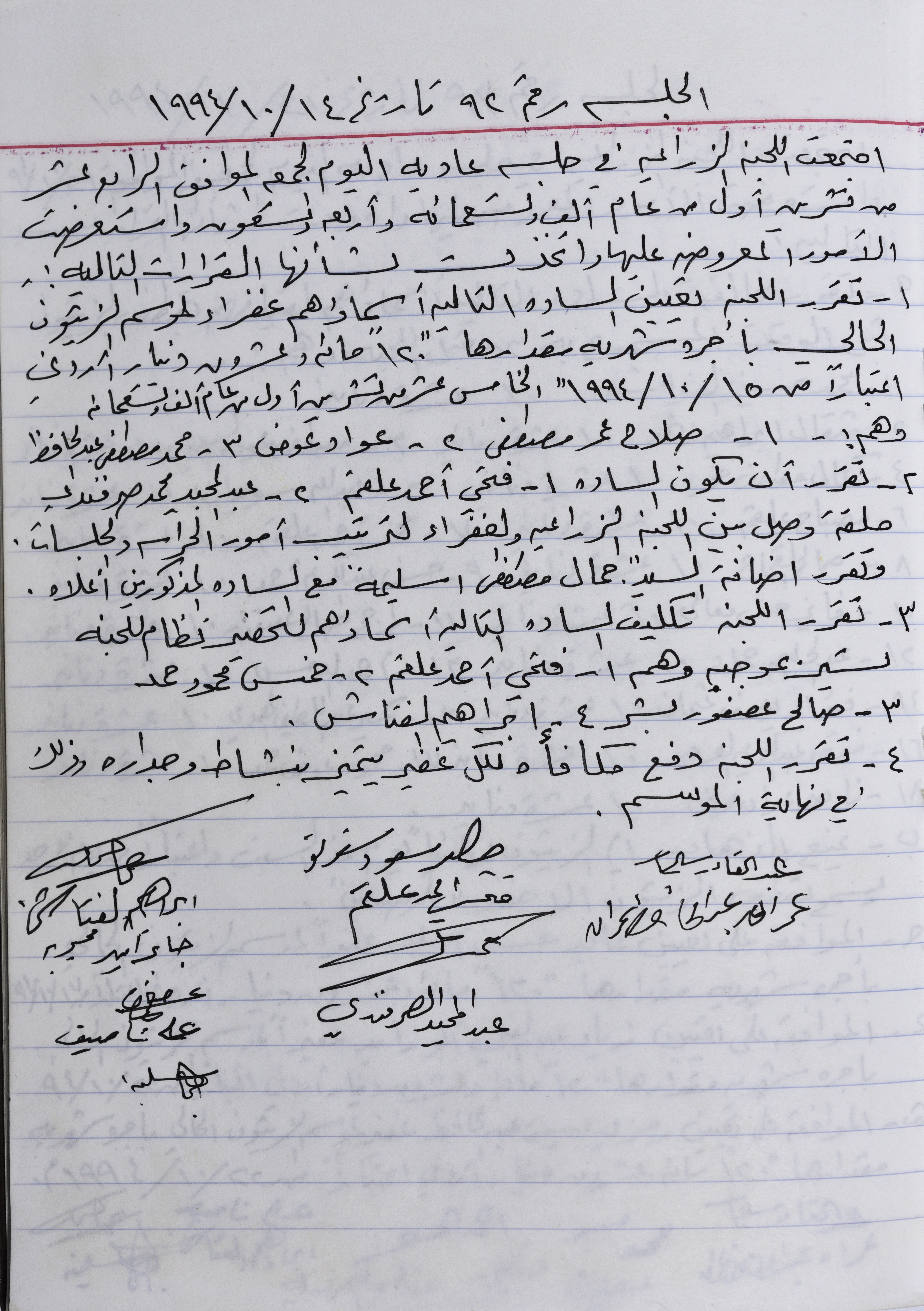 The minutes of session No. 92 of the Agricultural Committee in Salfit, held on 14 Oct 1994._x000D_ During this session, the committee decide to appoint three guard to guard the lands during the olive harvest season, and to award a financial reward at the end of the season for each and every one of them._x000D_ The committee also decide to appoint four experienced people to follow up on the work of the guardians and draft some instructions for the Agricultural Committee.