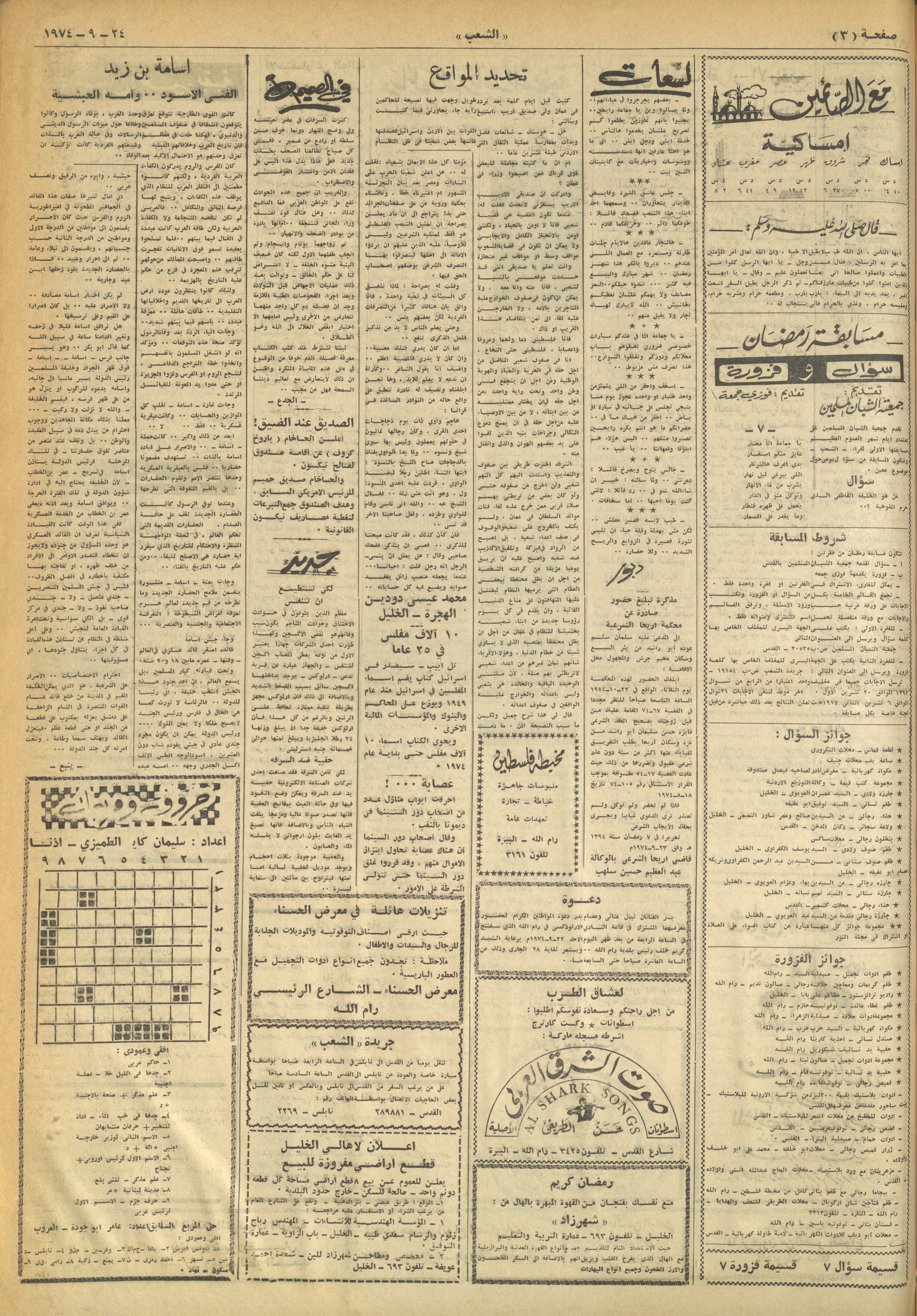 Printed in Arabic, this item shows issue number 650 of Asha'b Newspaper issued on 24 September 1974, which is a 4-paged daily, political and illustrated newspaper. The issue cost 40 agoras and included a collection of statements, announcements, advertisements and political and sports news including: - Bloody incidents in Lebanon between supporters of the Christian Phalanges and the Progressives. - The press and writers of Israel and the wrong positions on the Palestinian affiliation. - "Positioning", an article by Muhammad Dudin. - Osama bin Zaid, the black boy and his Habesha mother. - Letters of support for the Palestinian cause received by Yasser Arafat from various world leaders. - Jordanian arbitrary measures against several Palestinian detainees.