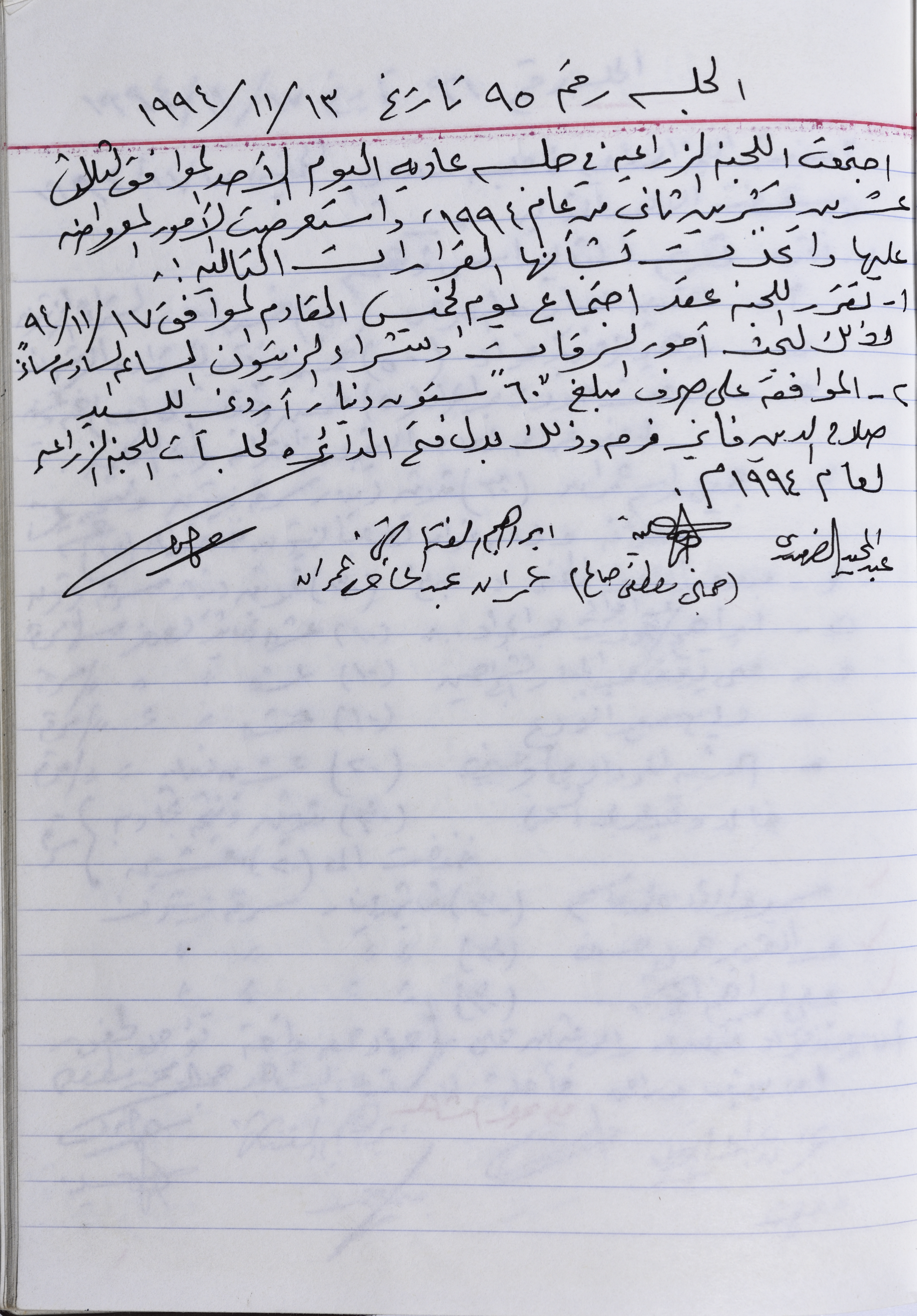 The minutes of session No. 95 of the Agricultural Committee in Salfit, held on 13 Nov 1994._x000D_ The Committee decide during this session to discuss olive theft and the olives' purchases in the next session, they also decide to spend 60 Jordanian dinars on the preparation for the Agricultural Committee's meetings. _x000D_