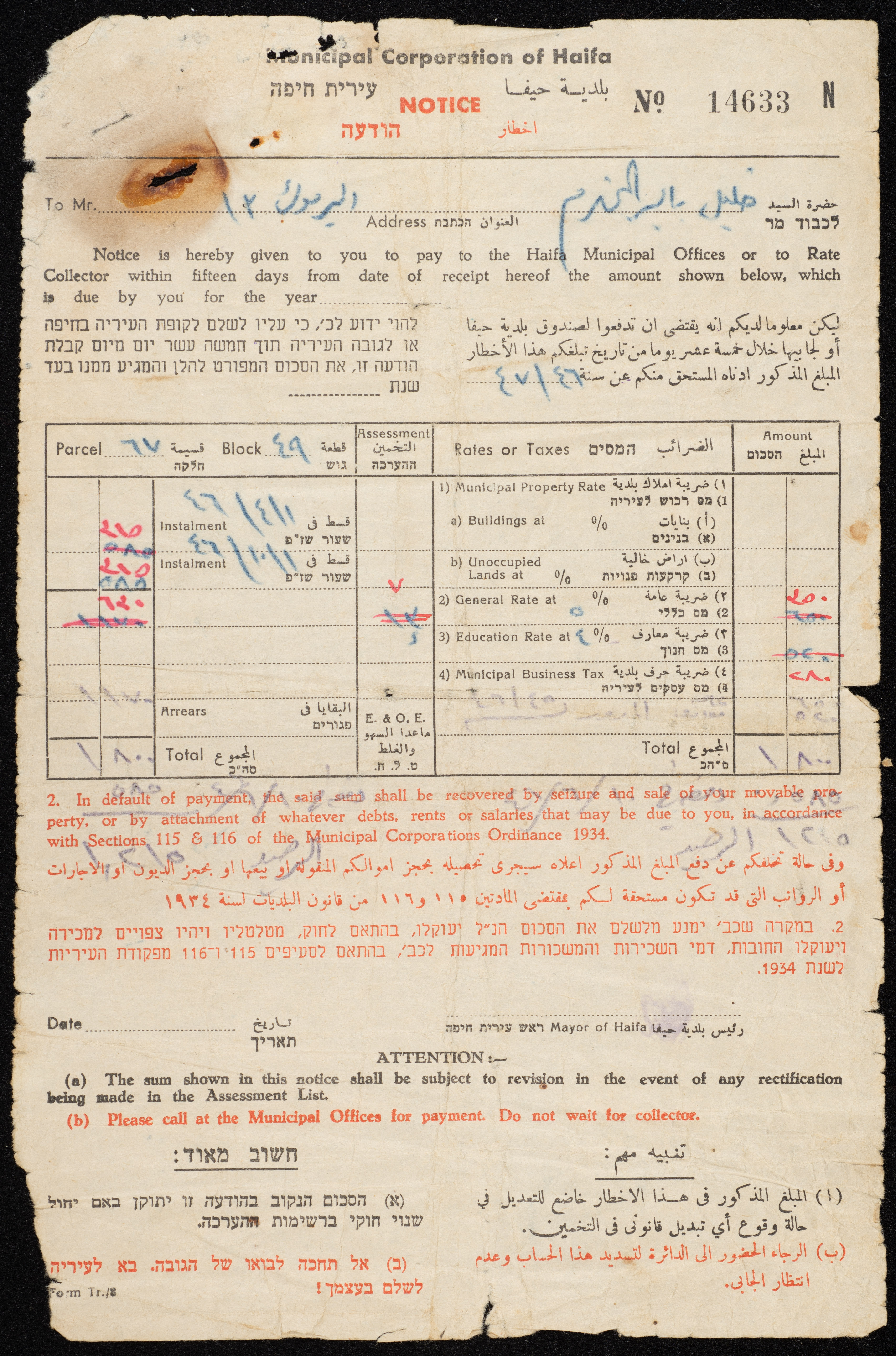 A Notice of a Tax Payment Issued by the Municipality of Haifa to Khalil Bayer, the 1940s