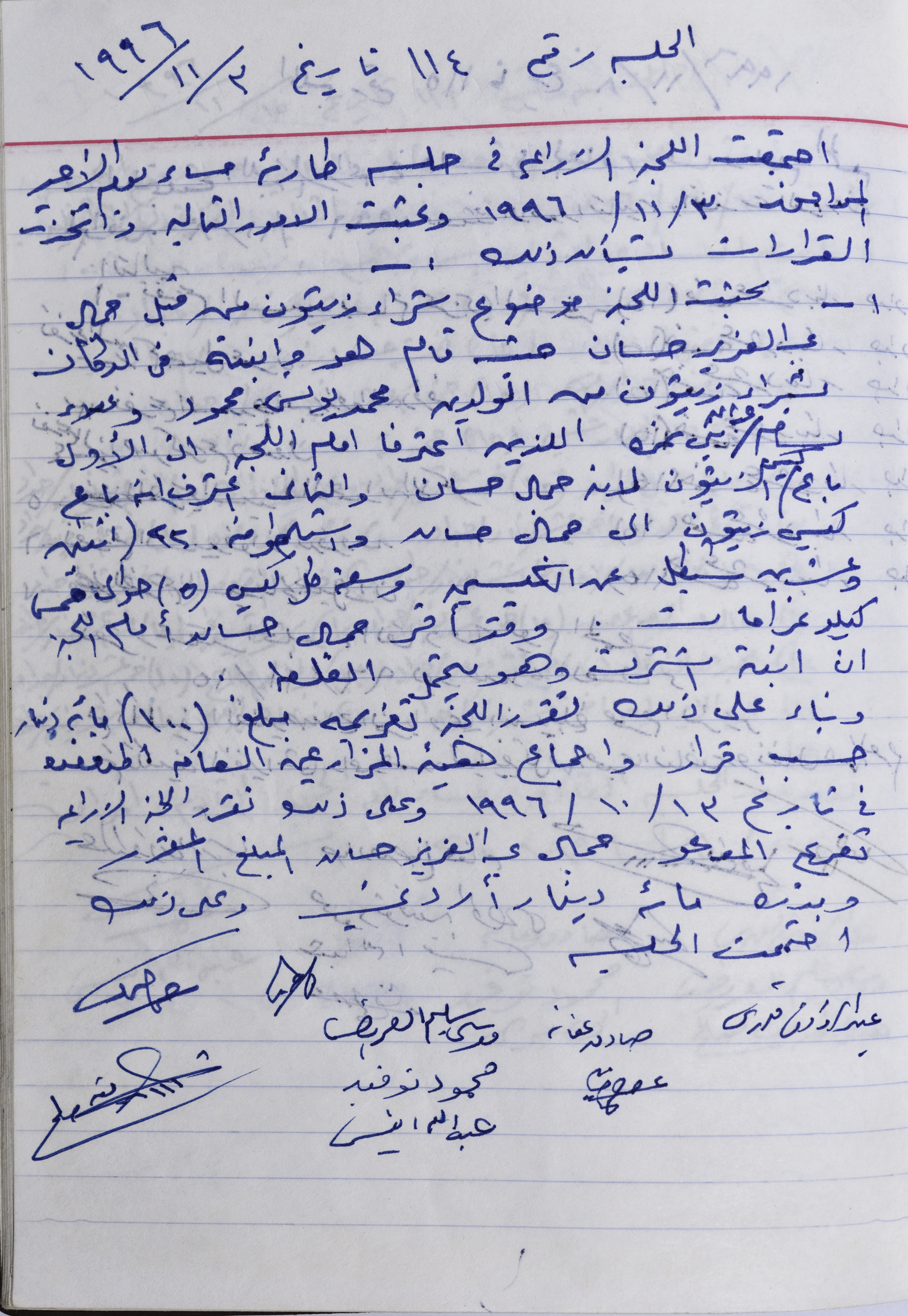 The minutes of session No.114 of the Agricultural Committee in Salfit, held on 3 Nov 1996._x000D_ The session discusses fining one of the traders who bought the olives from some young people from the town, the fine amounts of 100 JD.