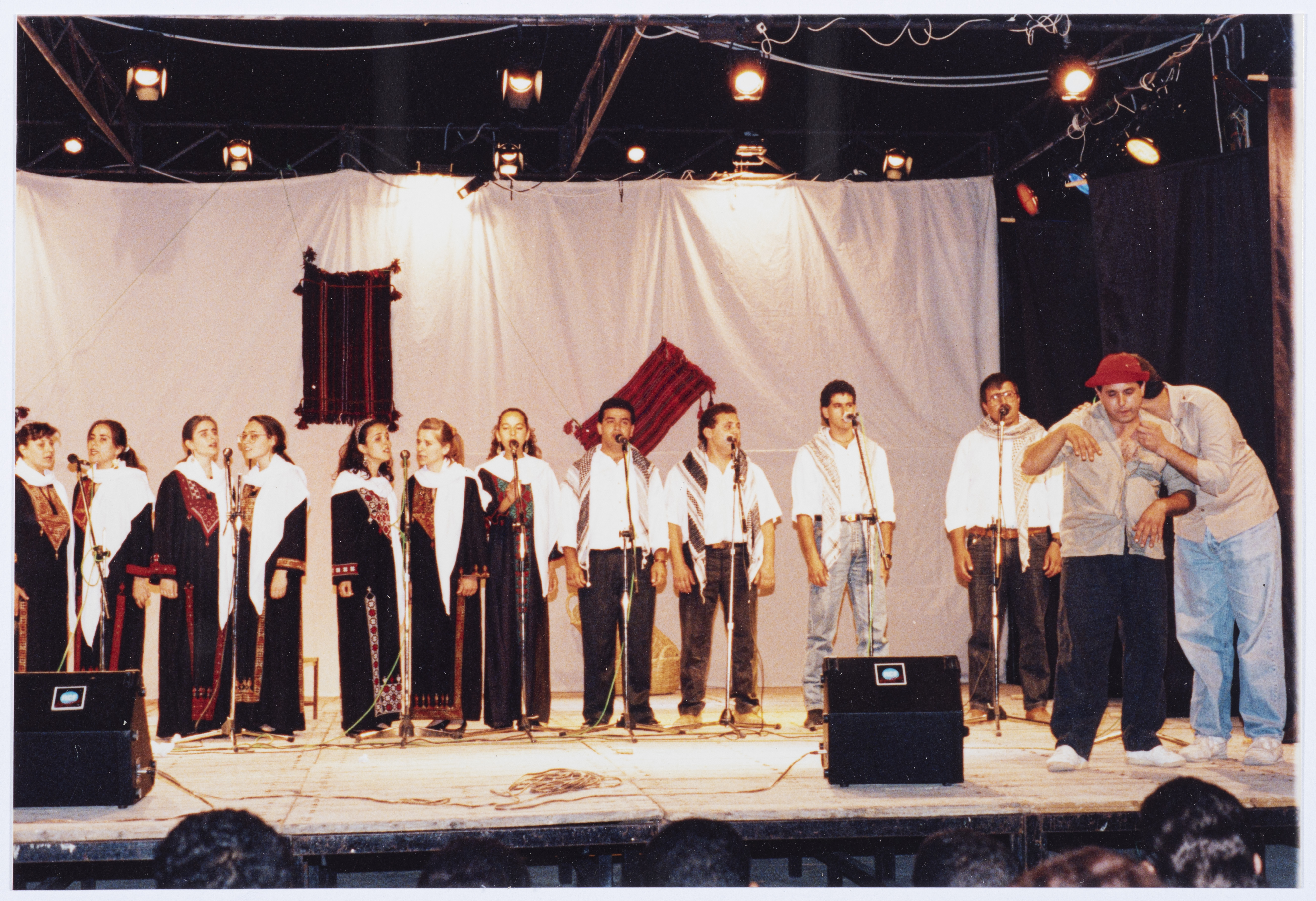 صورة غير مؤرخة لأعضاء فرقة سنابل، وهم يغنون في مهرجان التراث في جامعة بيرزيت.