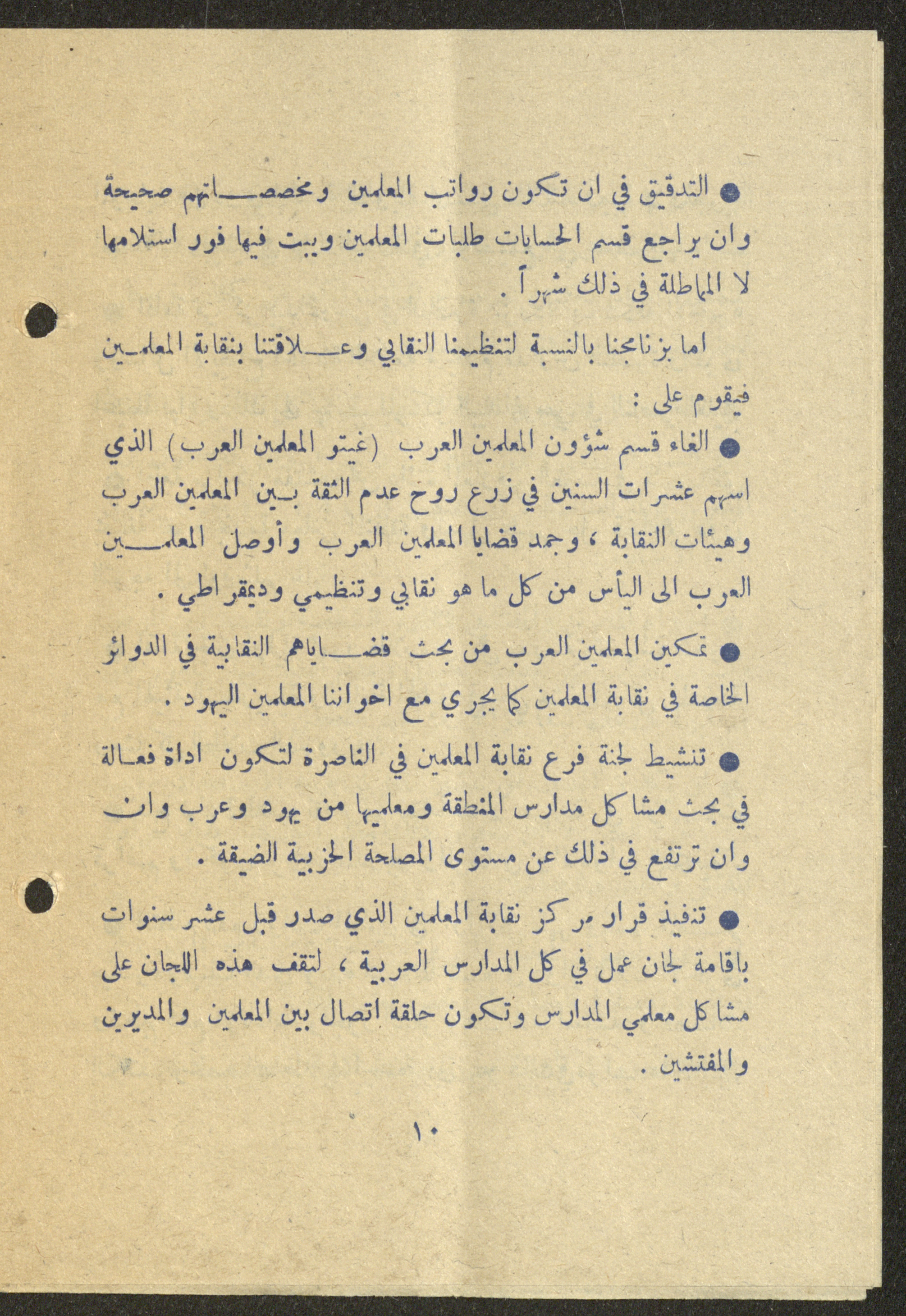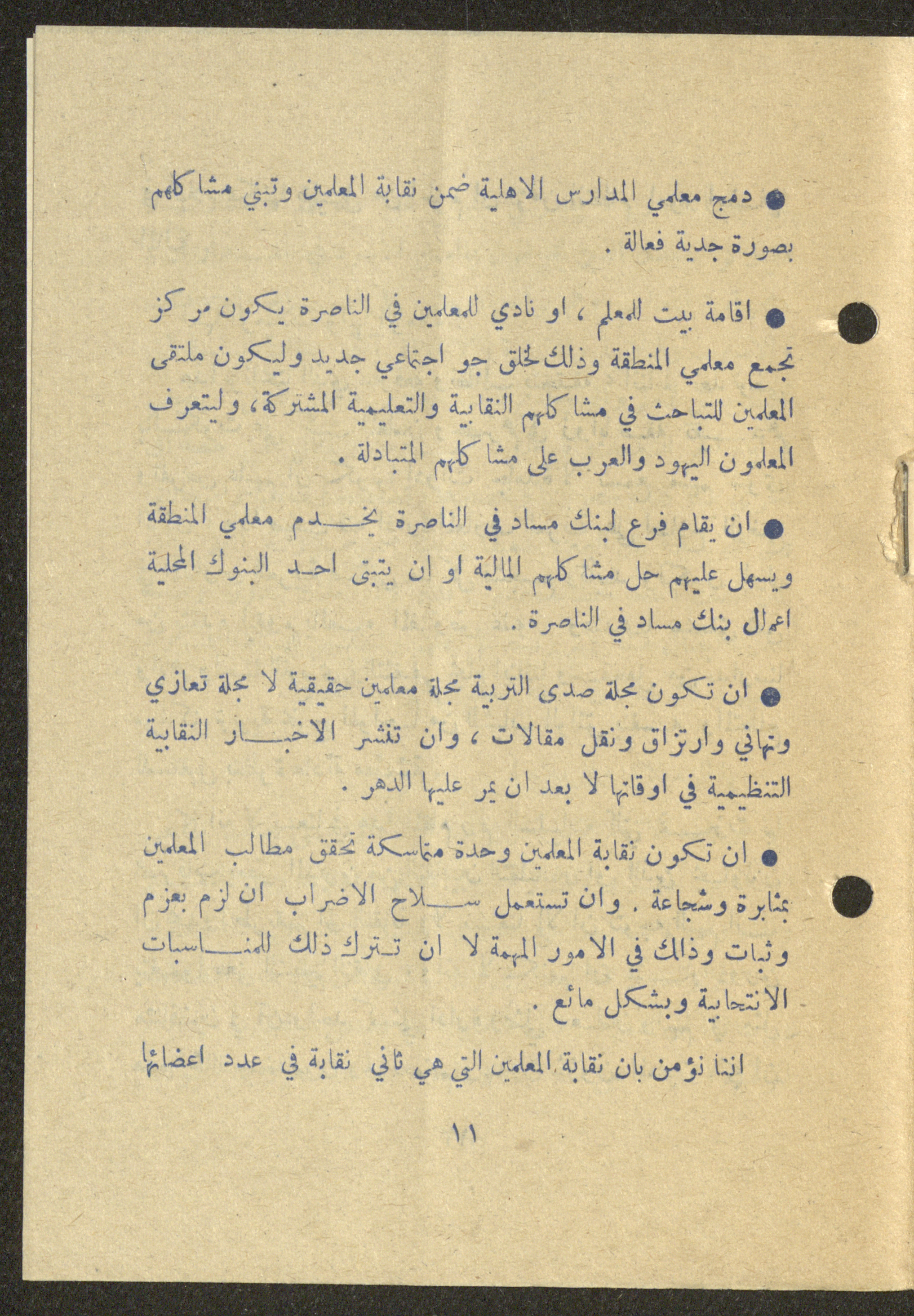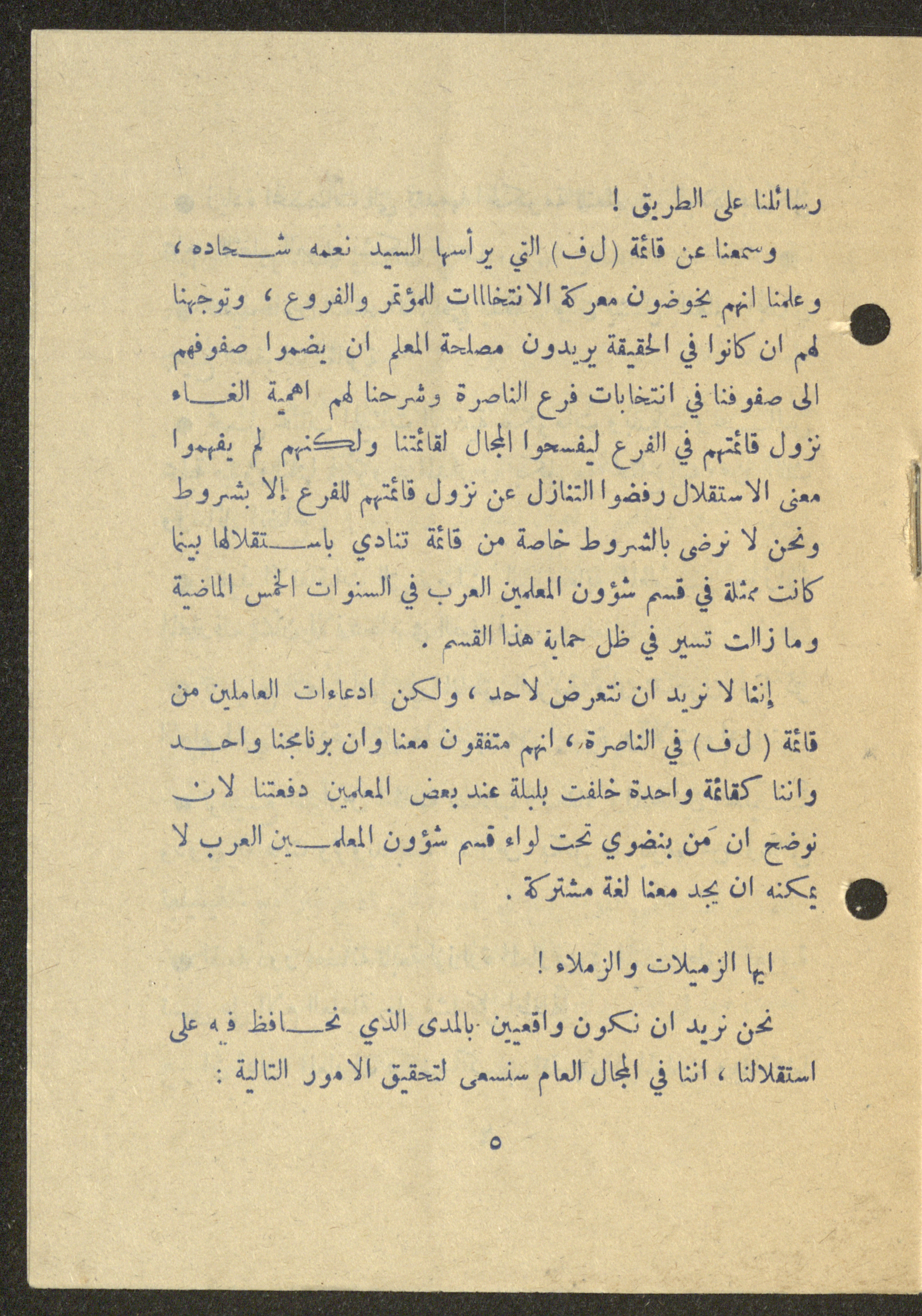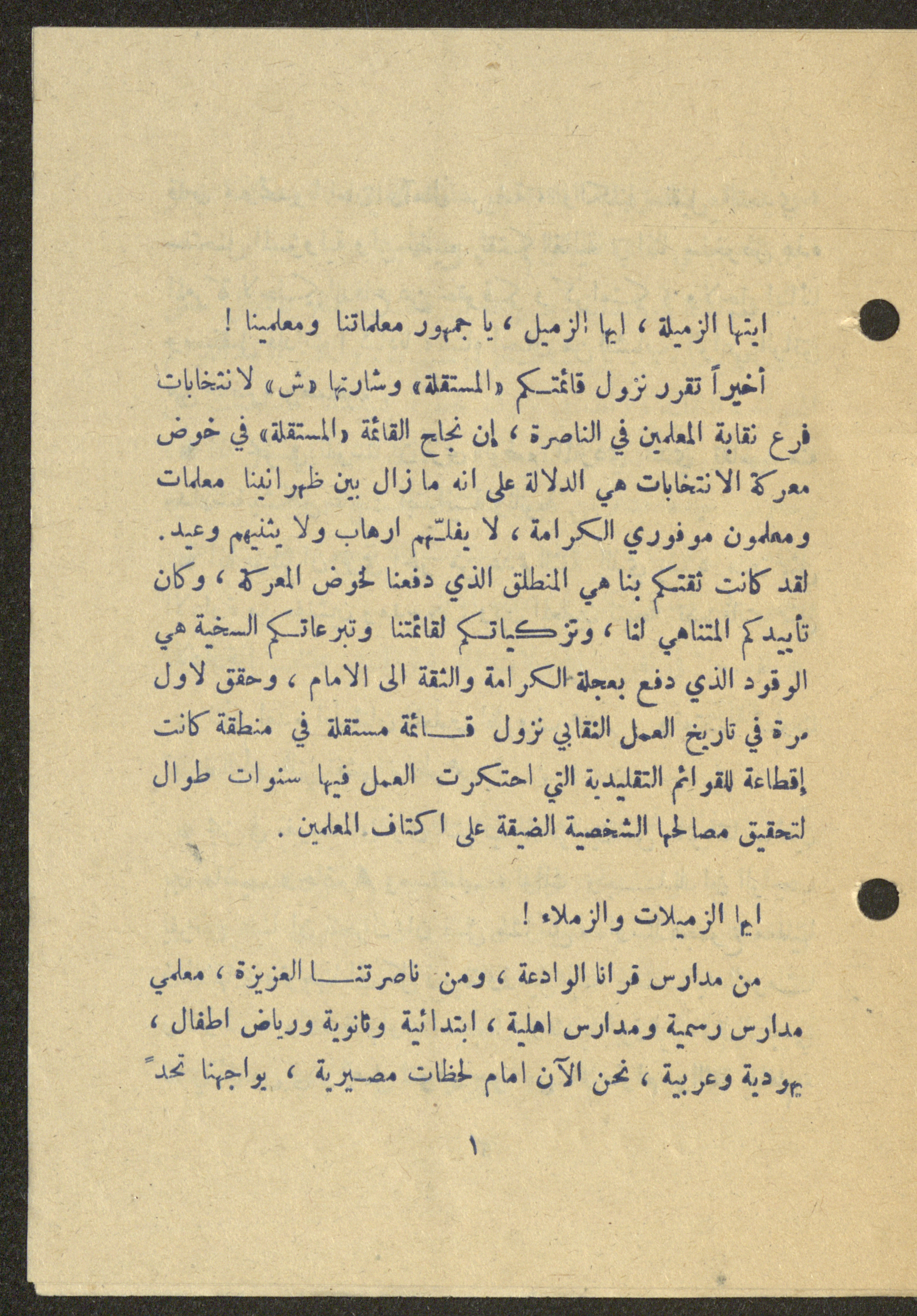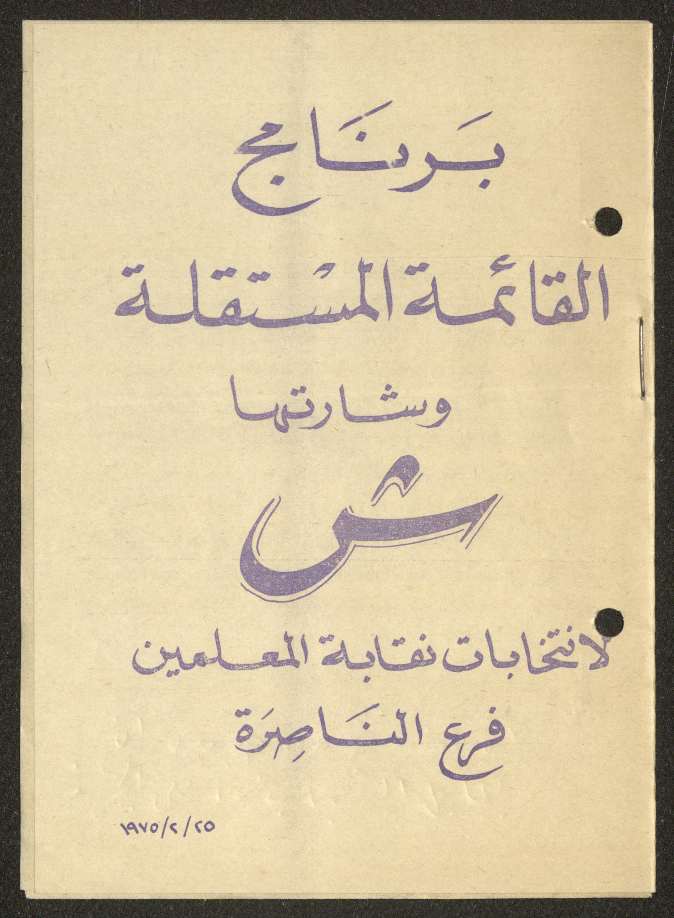 Dated 25 February 1975, this 16-page document shows the program of the independent list (Sh) for the elections of the teachers union in Nazareth.