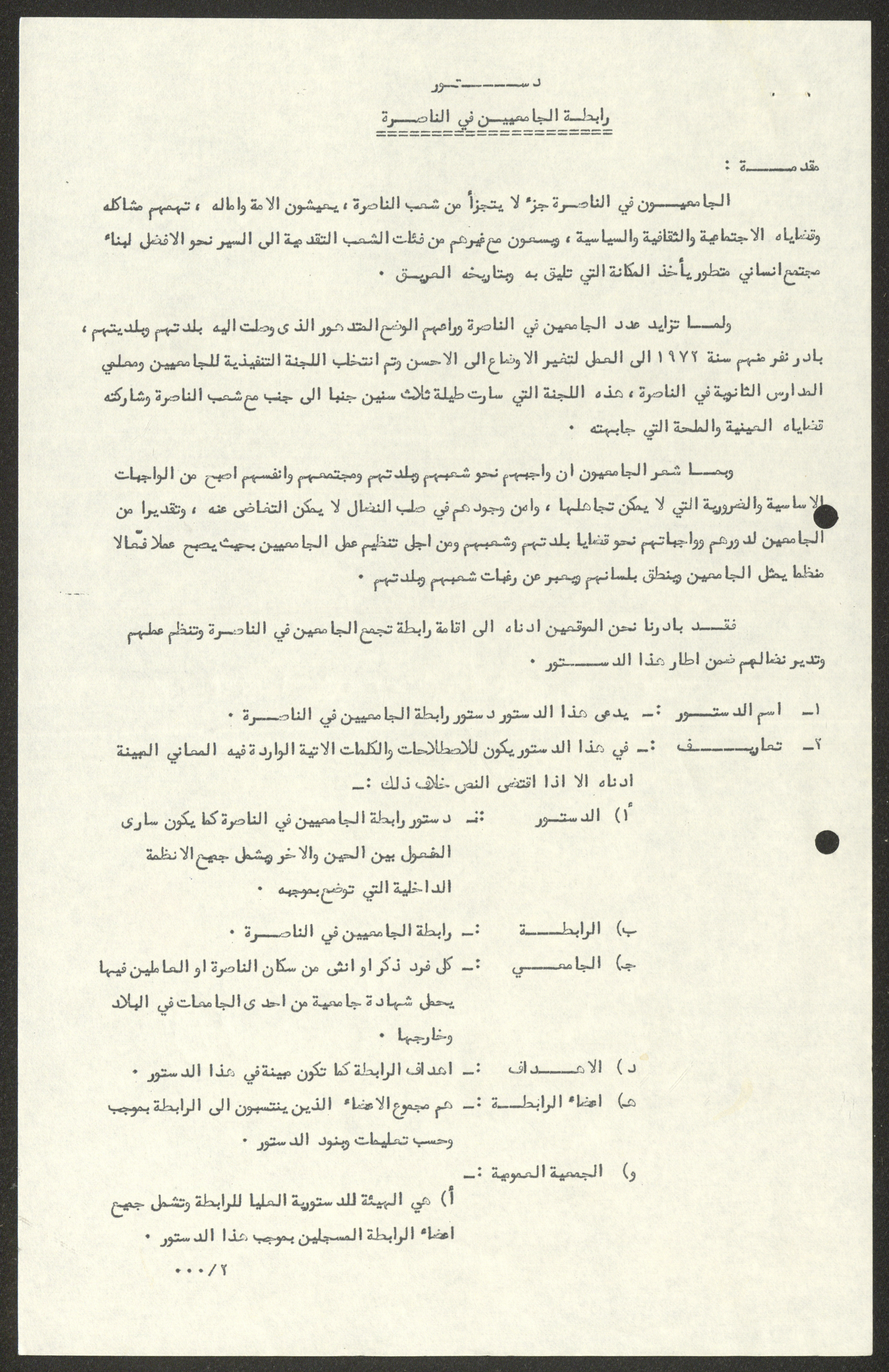 Found in the Walid Fahoum Collection, this document shows a copy of the constitution of the University Association in Nazareth, which contained the goals of the Association, its membership, its position, its executive committee, and other relevant information.