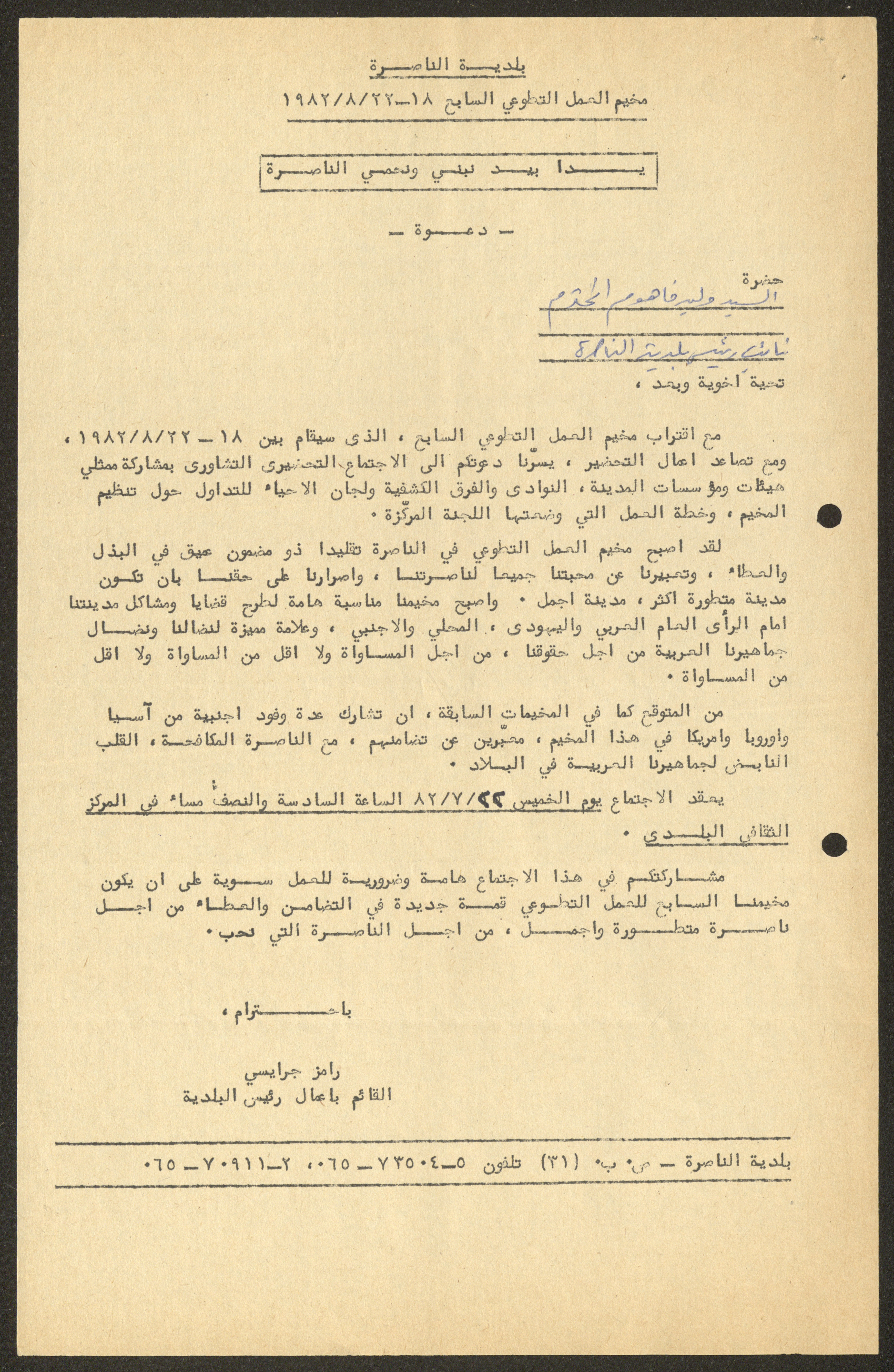 دعوة صادرة عن بلدية الناصرة لوليد الفاهوم، للمشاركة في الاجتماع التحضيري لمخيم العمل التطوعي السابع المقرر إقامته بين 18 و27 آب 1982.