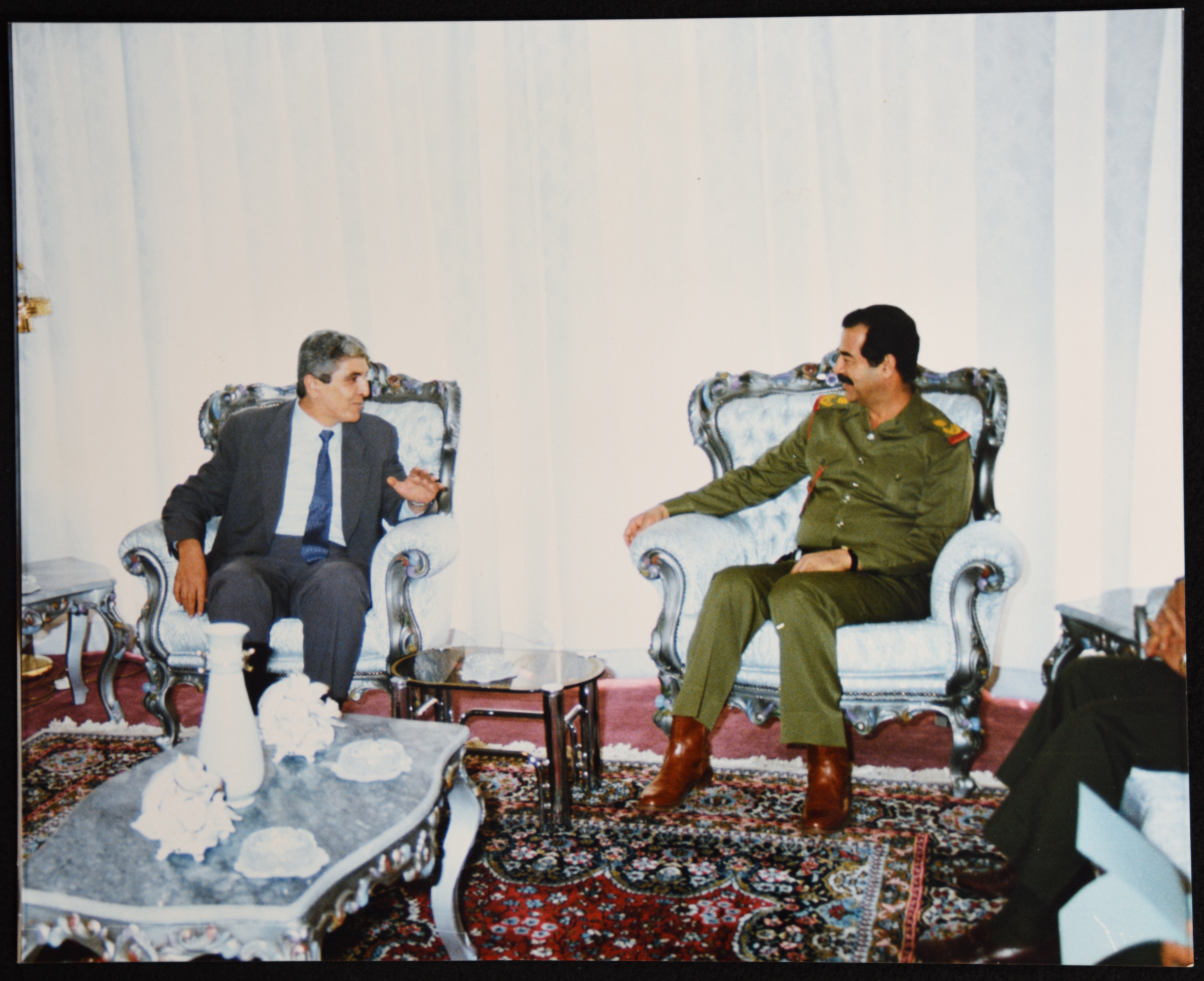 صور ملونة يظهر فيها الامين العام لجبهة النضال الشعبي الدكتور سمير غوشة في لقاء رسمي خاص مع الرئيس العراقي صدام حسين وذلك خلال زيارة نفذتها جبهة النضال الشعبي الفلسطيني بدعم من منظمة التحرير الفلسطينية ، للتضامن مع العراق في وجه التهديدات الأمريكية بعد غزو العراق للكويت