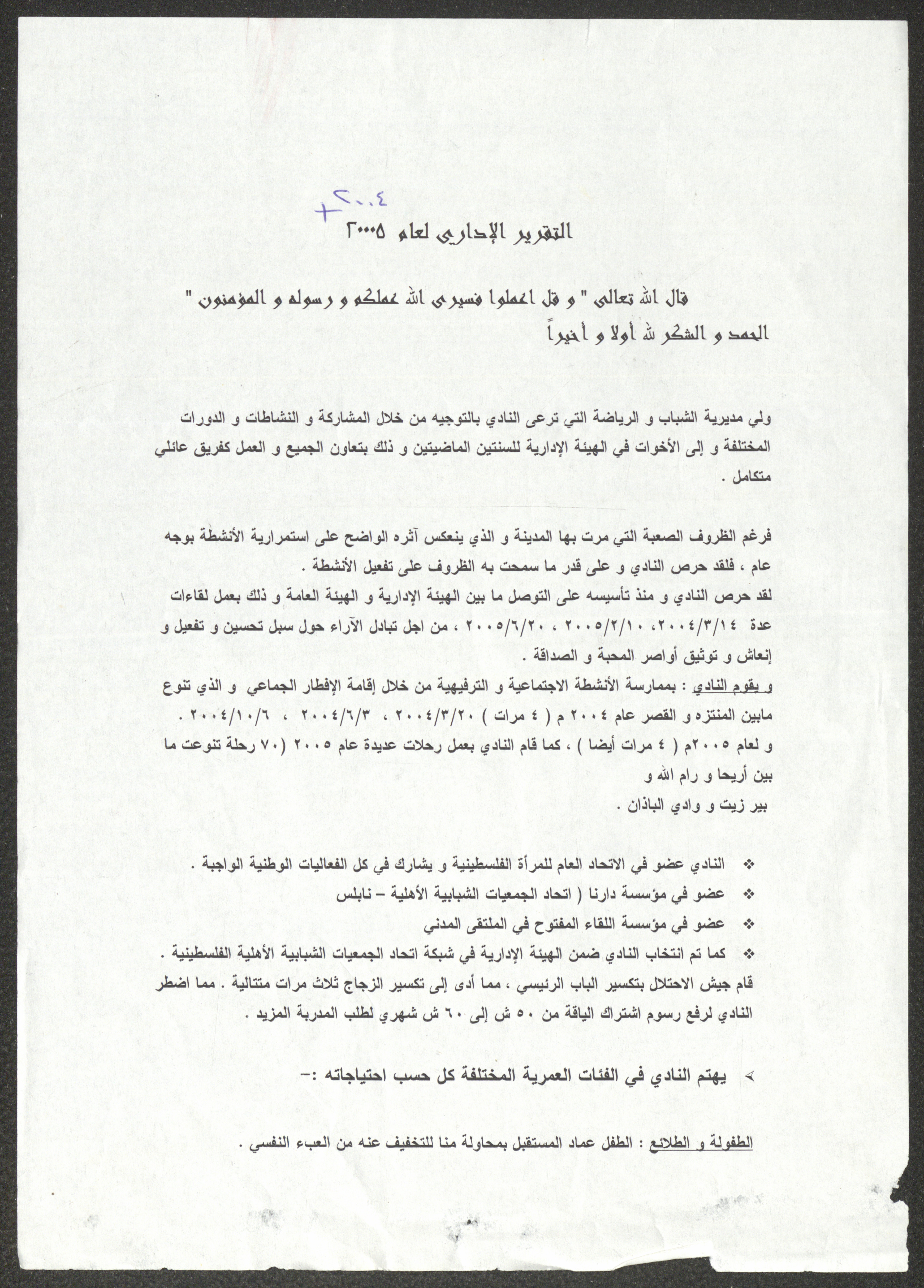تقرير إداري صادر عن نادي المرأة الفلسطينية، نابلس، 2004-2005