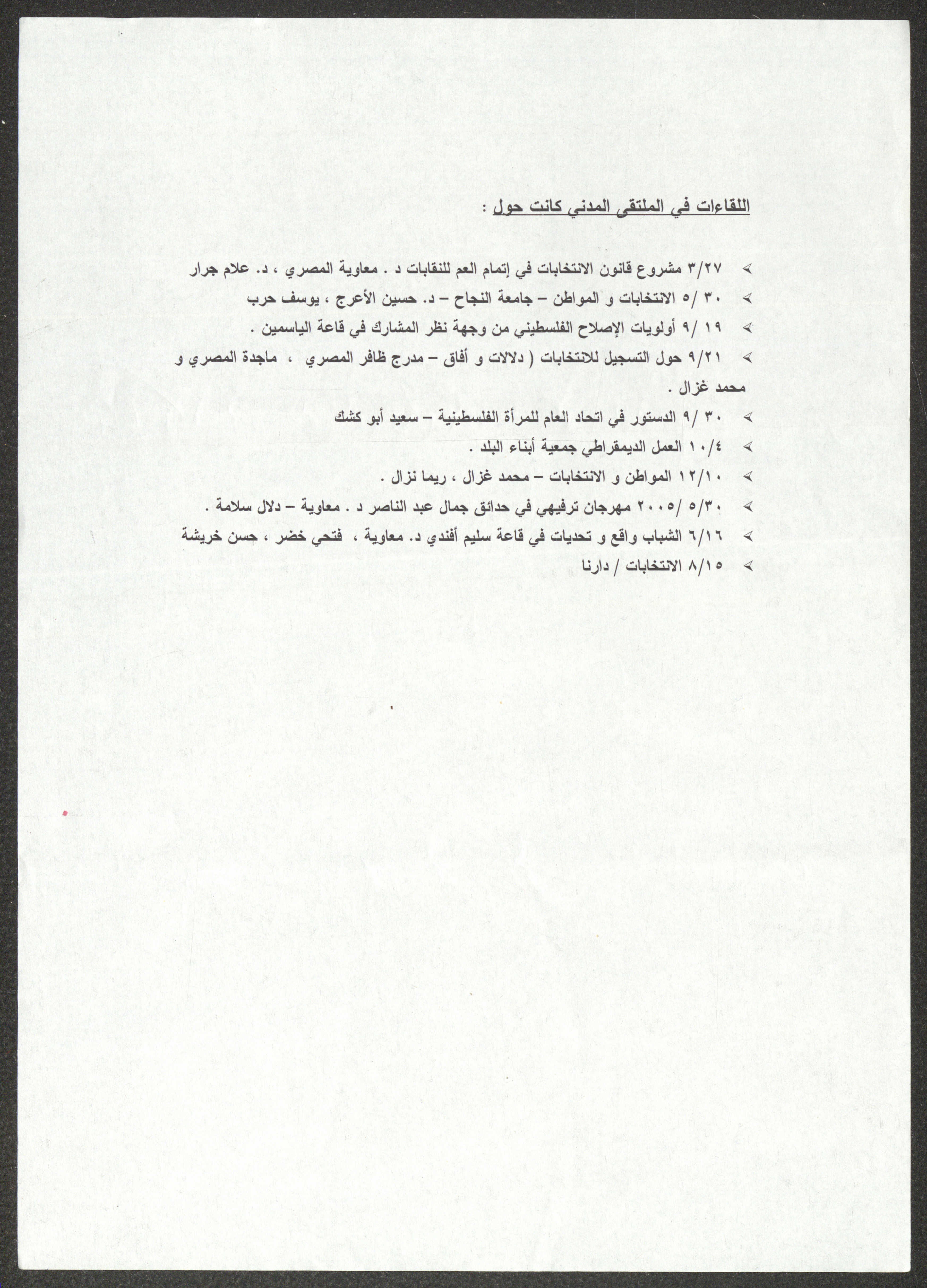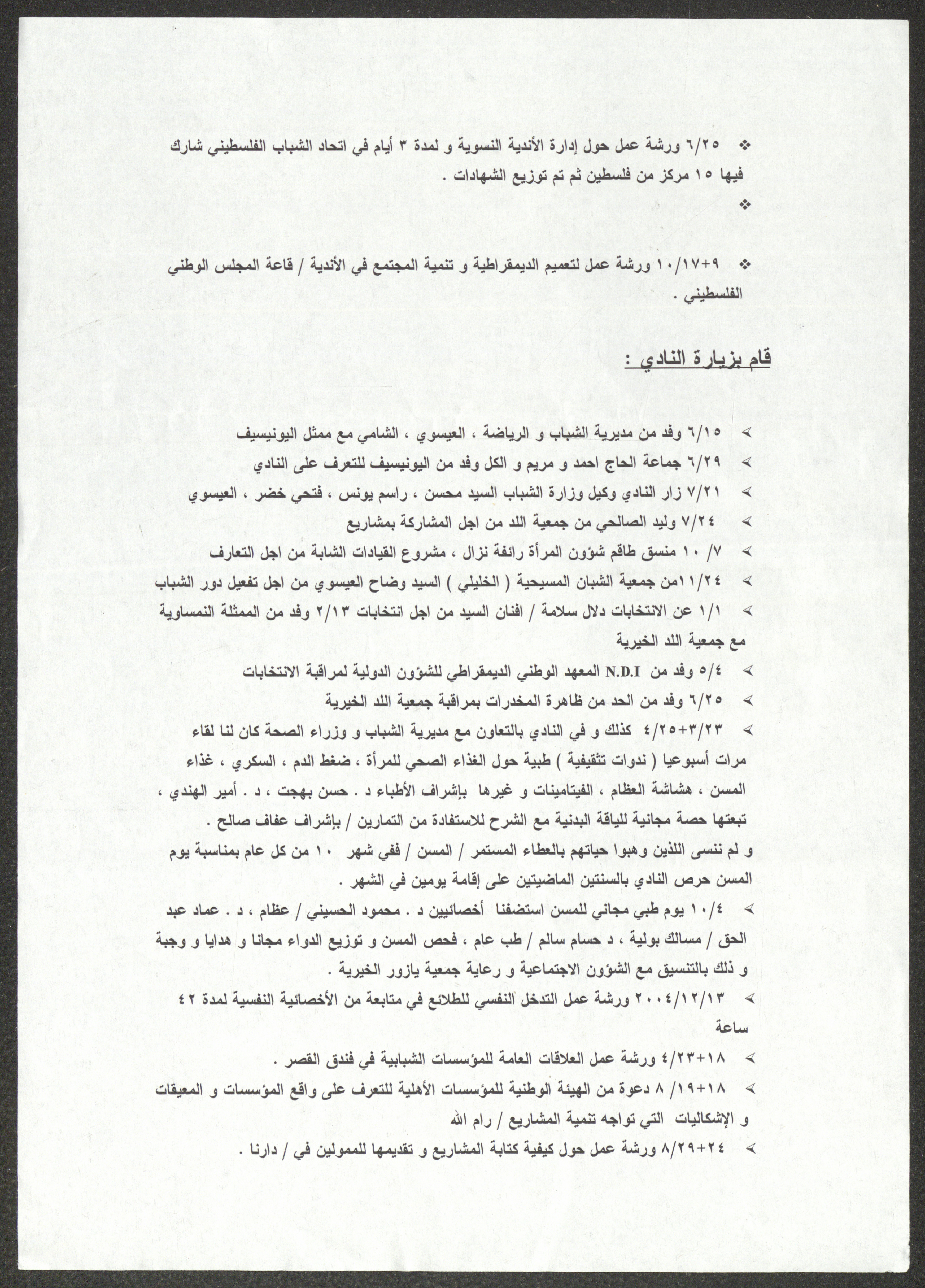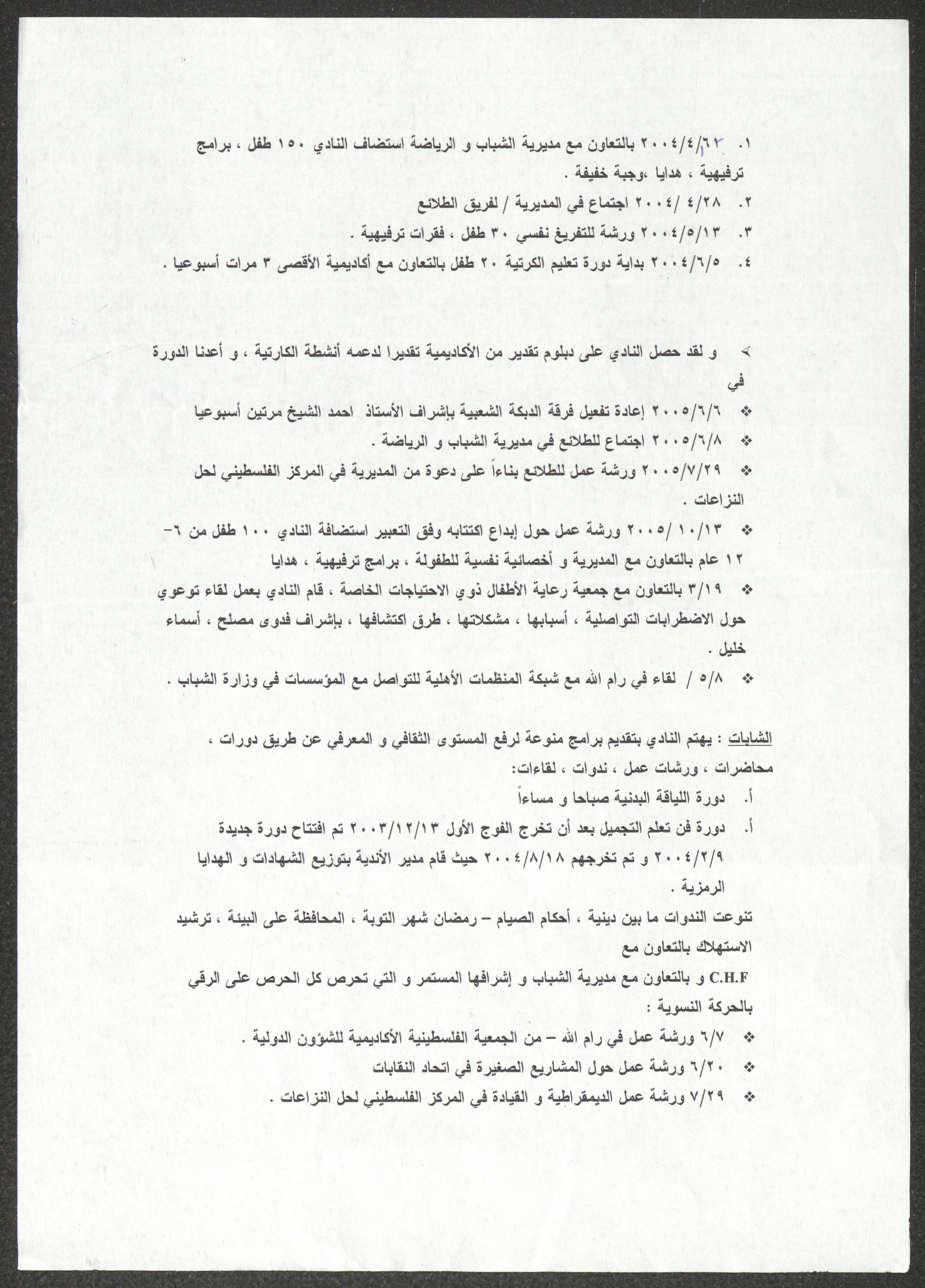 تقرير إداري صادر عن نادي المرأة الفلسطينية في نابلس، جاء فيه الأنشطة الاجتماعية والترفيهية وذكرٌ لأعضاء النادي والانتخابات والأضرار التي ألحقتها قوات الاحتلال الإسرائيلي خلال اقتحام المدينة، بالإضافة إلى الدورات والندوات وورش العمل التي قُدِّمت في العامين 2004 و2005، هذا وذكر التقرير زيارات النادي ولقاءاته في الملتقى المدني مع توضيحٍ للمواضيع التي نوقشت.