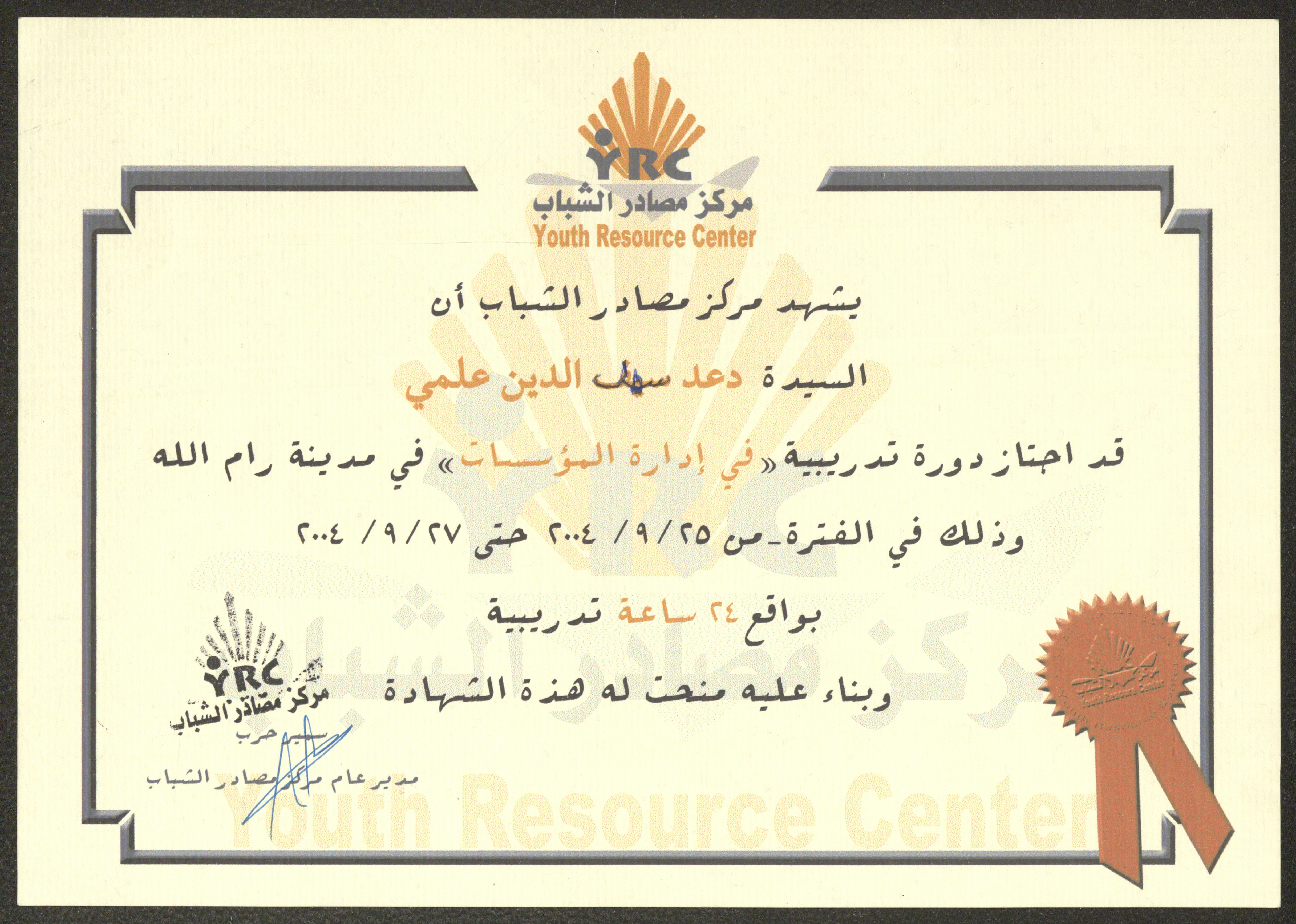شهادة صادرة عن مركز مصادر الشباب باسم دعد العلمي، رام الله، 25-27 أيلول 2004