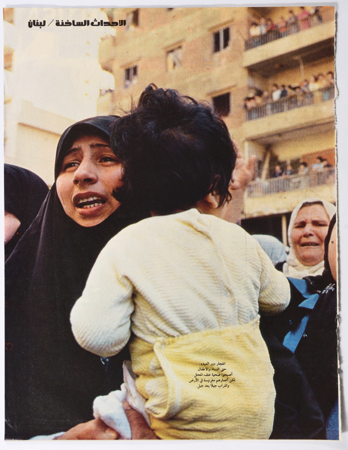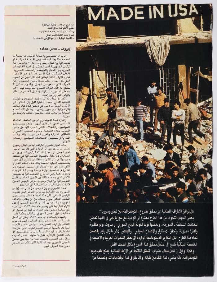 Issued in March 1985, this document shows a clipping from Kul al-Arab Magazine, containing two photographs of the Bir al-Abed Massacre in the southern suburb of Beirut, which was committed during the attempt to assassinate Sayyed Mohammad Hussein Fadlallah, an affiliate of Hizbullah Movement, in addition to an article on the creation of a confederation between Lebanon and Syria.