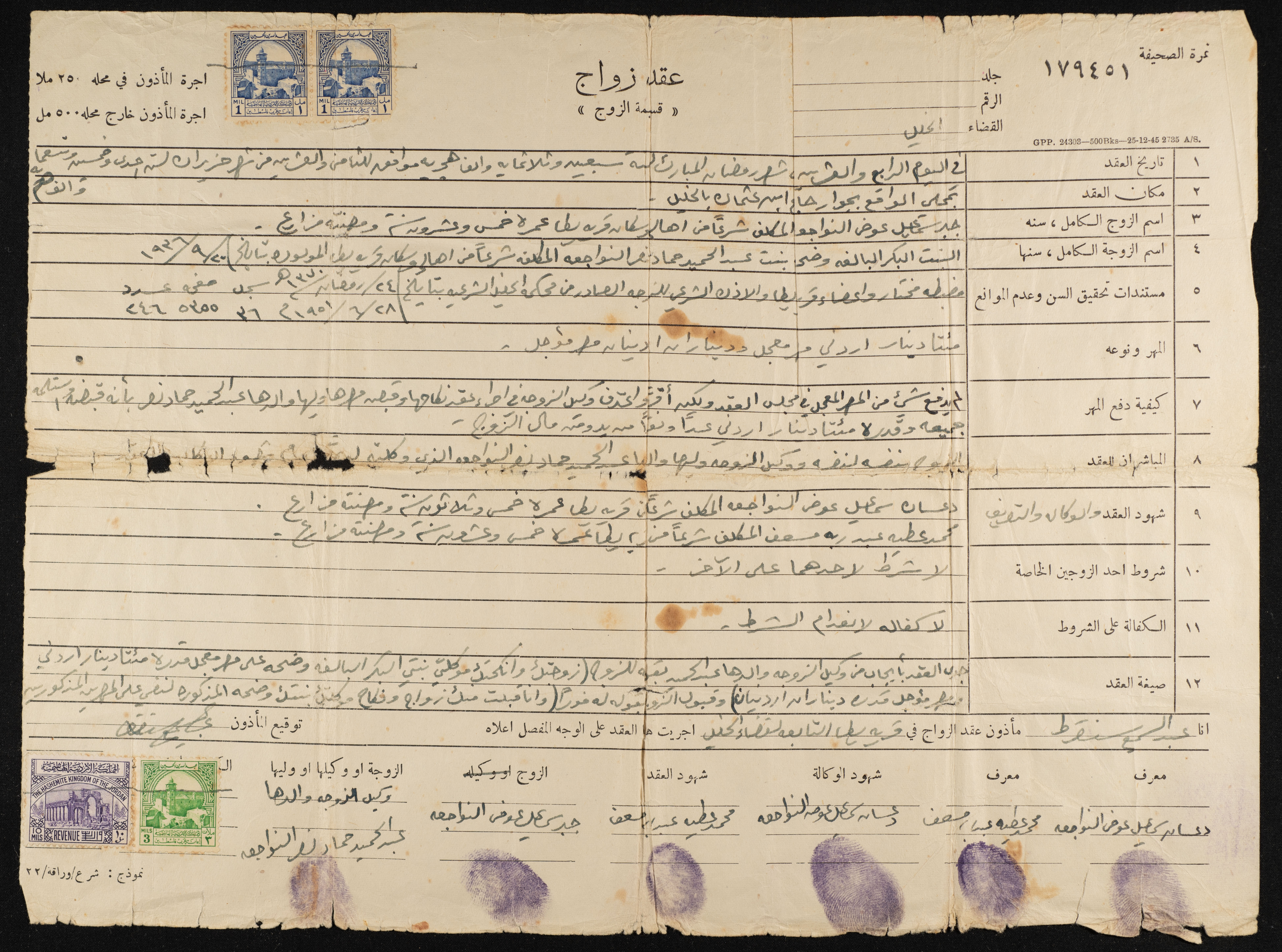 Issued on 24 Ramadan 1370 AH, corresponding to 29 July 1951 AD, this document shows the marriage contract of Jaber Ismail Nawaj'a and Wadha Abdel-Hamid Nawaj'a from Yatta in the south of Hebron, as the marriage was held by the marriage officiant Abdessami' Sunnuqrot and signed by him, the witnesses, the bride's guardian and the groom.