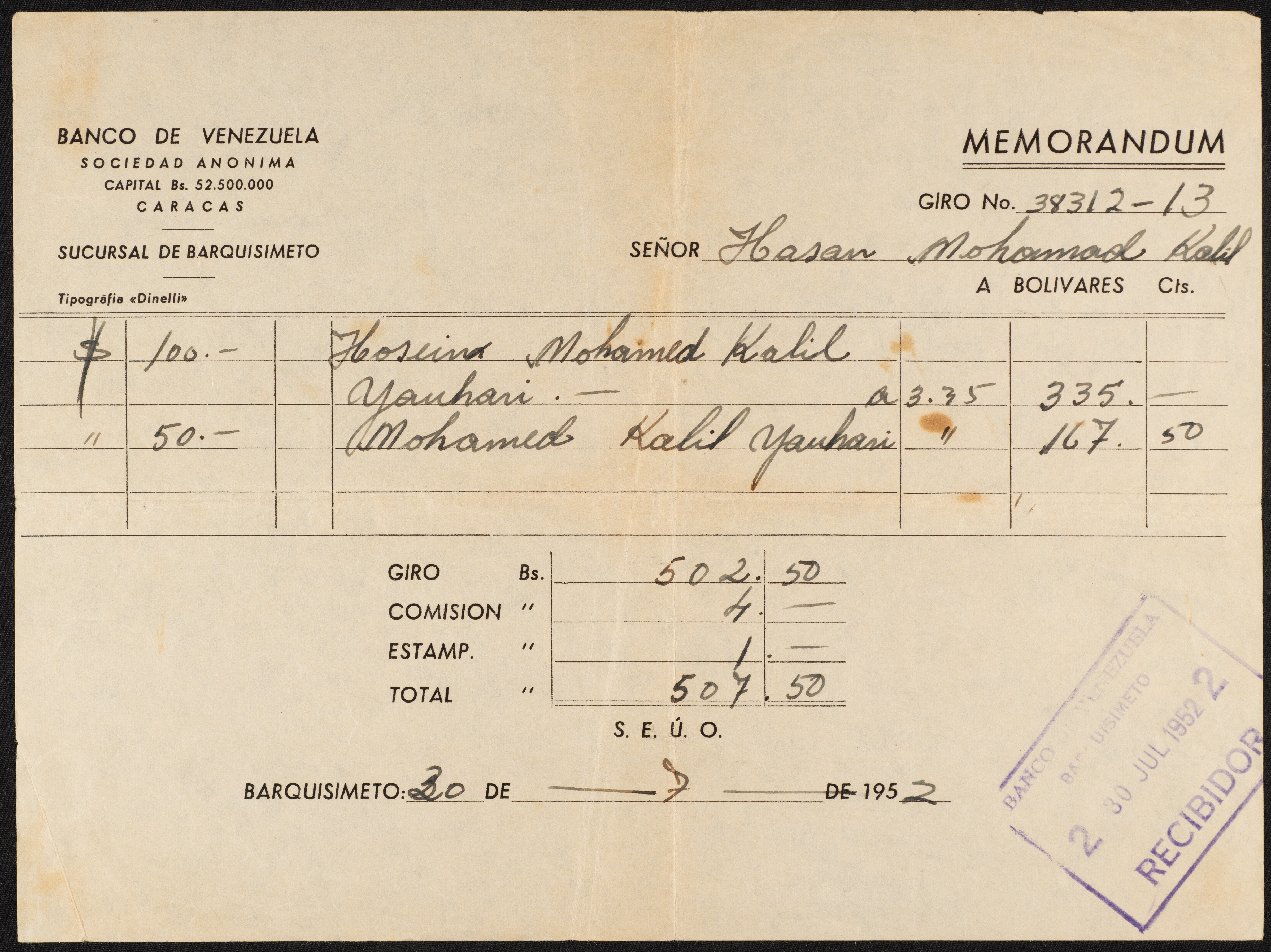 Issued by a bank in Venezuela on 30 July 1952, this document shows a receipt in the name of Mohammad Khalil.
