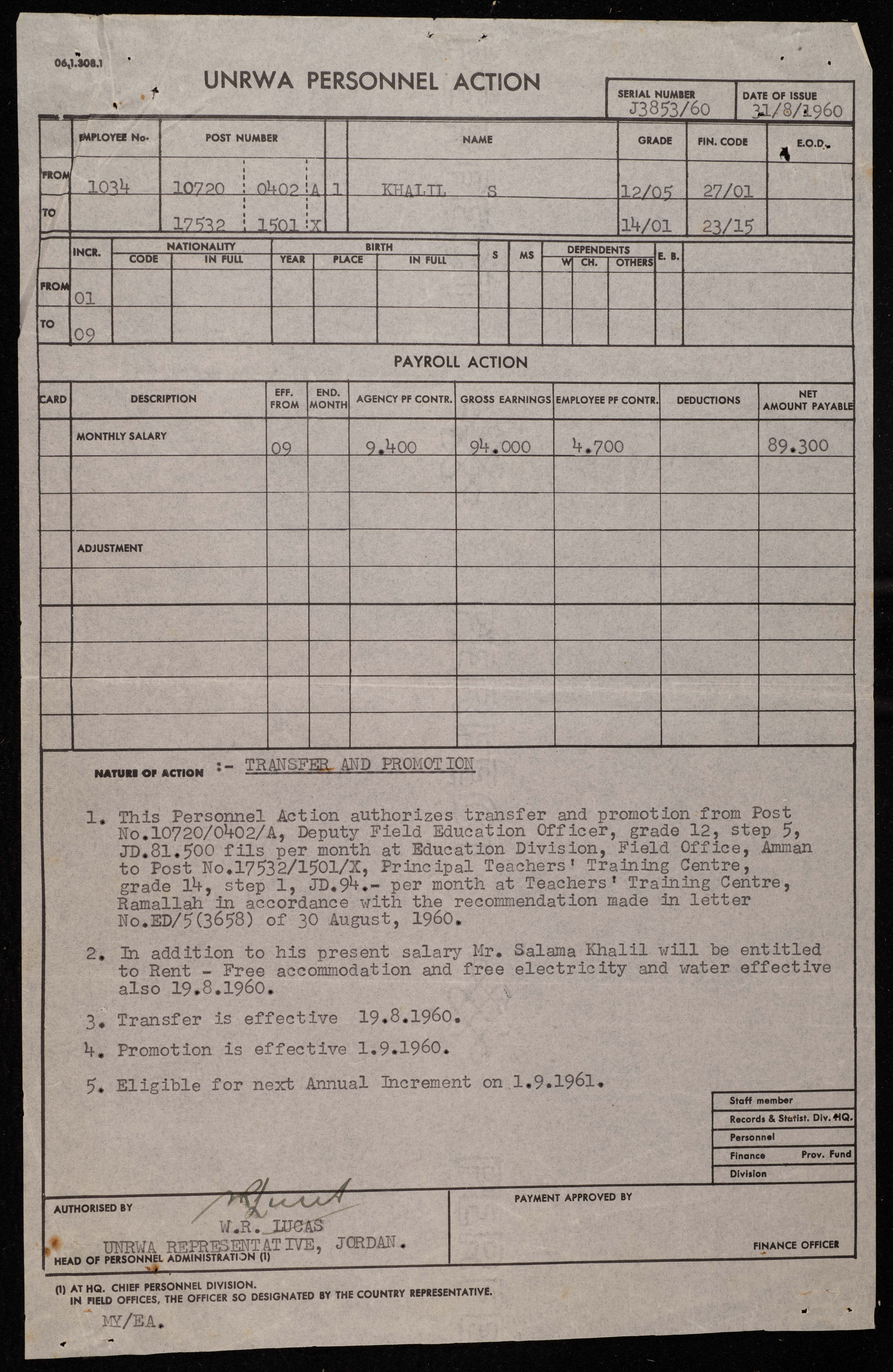 Dated 31 August 1960, this document shows a letter from the Director of the United Nations Relief and Works Agency for Palestine Refugees in the Near East (UNRWA) in Jordan to Salameh Khalil including the decision to appoint him as the director of the Teachers' Training Centre in Ramallah, in addition to his step, salary and other work-related details.
