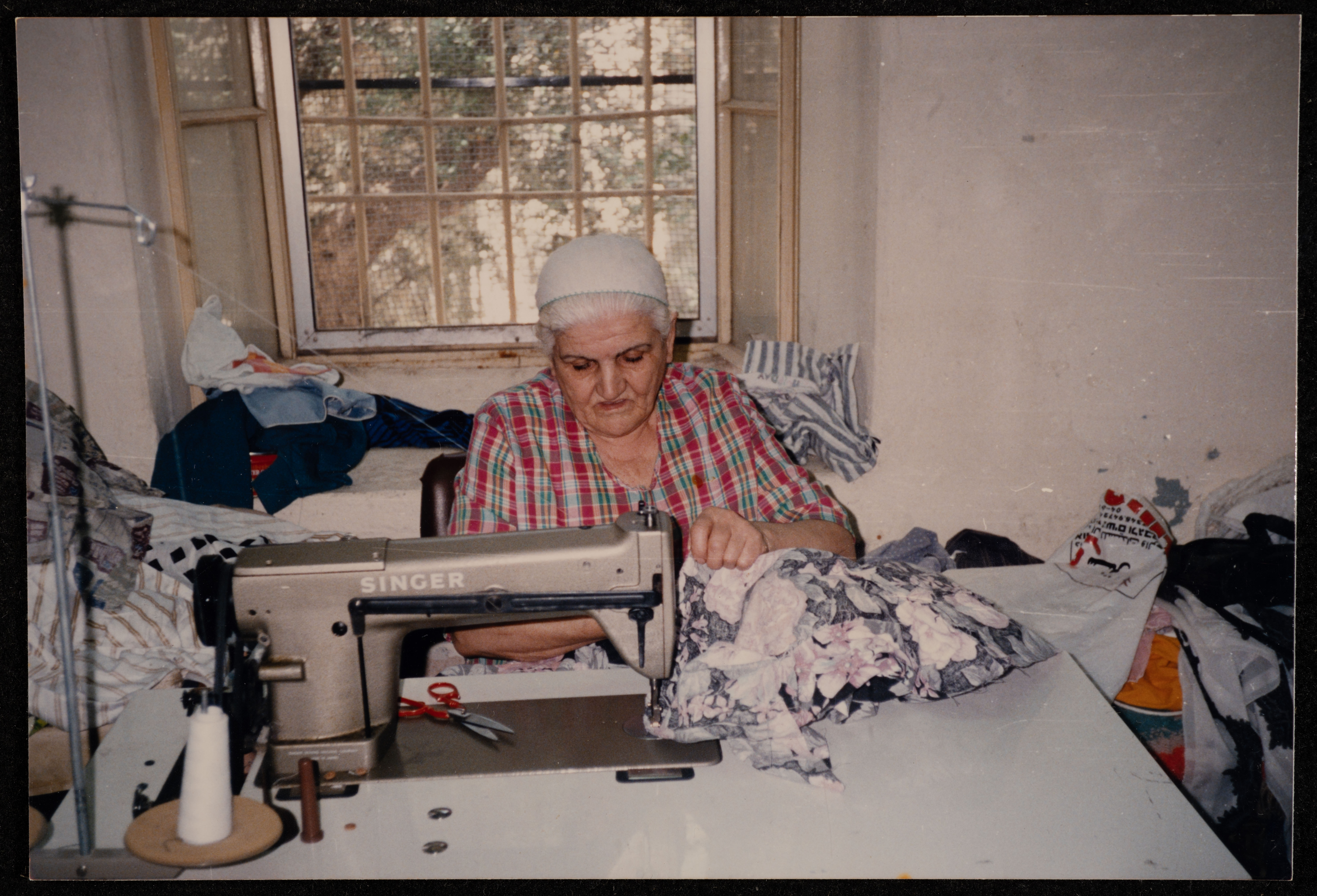 Taken in the 1990s, this photograph shows an elderly employee sewing clothes using a sewing machine at the workshop of the House of Hope Association for the Blind and Special Needs in Bethlehem.