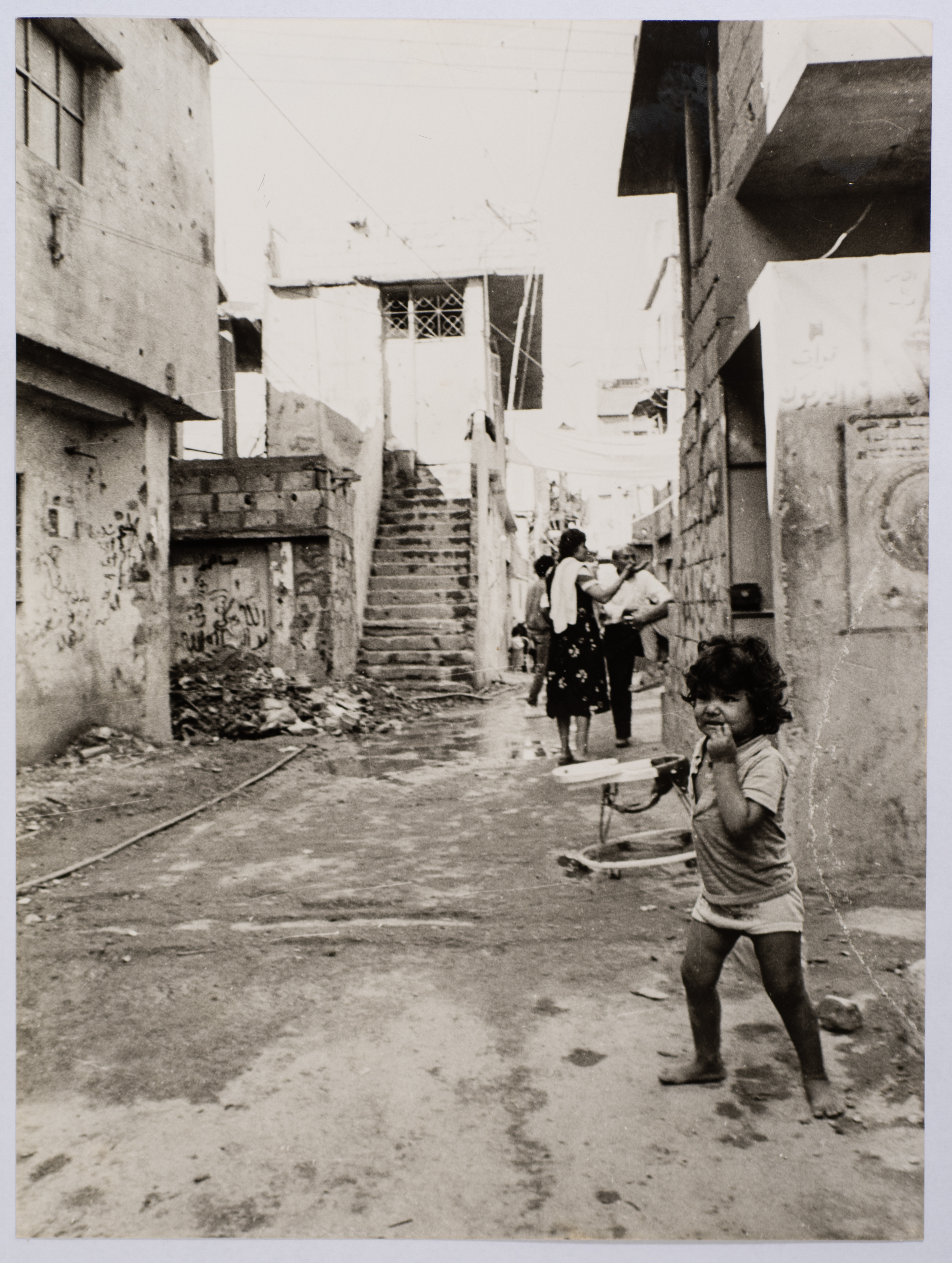 A black-and-white photograph showing the nature of the place and the streets and the houses, and the detailed life of the citizens of Sabra and Shatila refugee camps during the eighties of the past century.