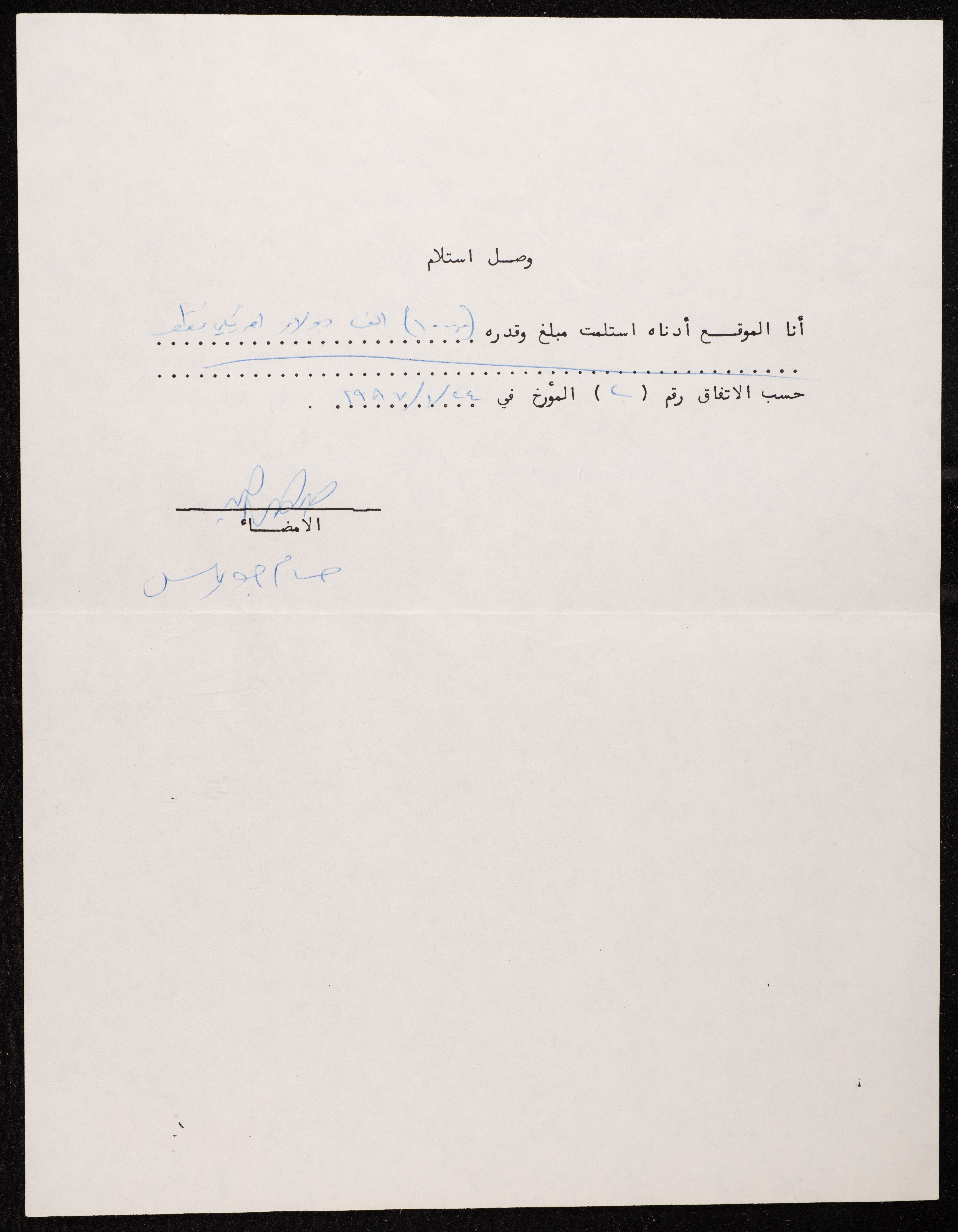 This document shows a receipt for a sum of money bearing the signature of Husam Jweiles, in which he acknowledges that he has received an amount of 1000 US dollars, according to an agreement concluded between him and Emil Ashrawi at the el-Hakawati Theater in Jerusalem on 24 January 1987.