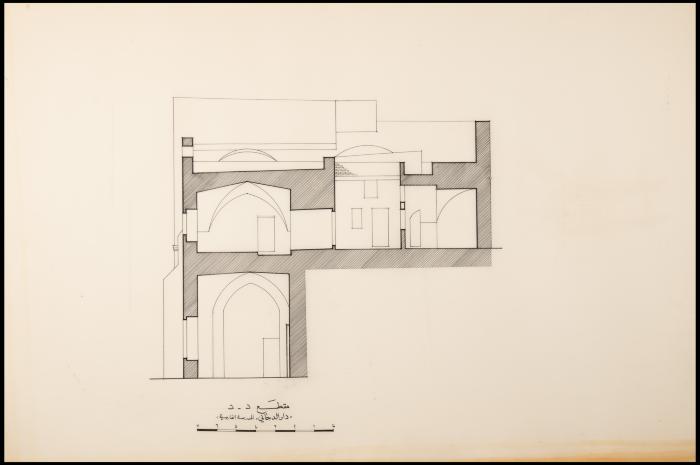 Drawn by Sameh Aboushi in the 1990s, this document shows the "D-D Section" plan of the al-Dajani Family house- al-Fareseyyah School in the Old City of Jerusalem.