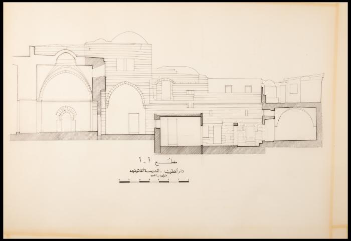 Drawn by Sameh Aboushi in the 1990s, this document shows the "A-A Section" plan of the al-Khatib Family house- al-Khatuneyya School in the Old City of Jerusalem.