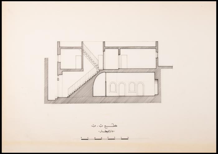 Drawn by Sameh Aboushi in the 1990s, this document shows the "B-B Section" plan of the al-Bitar Family house in the Old City of Jerusalem.
