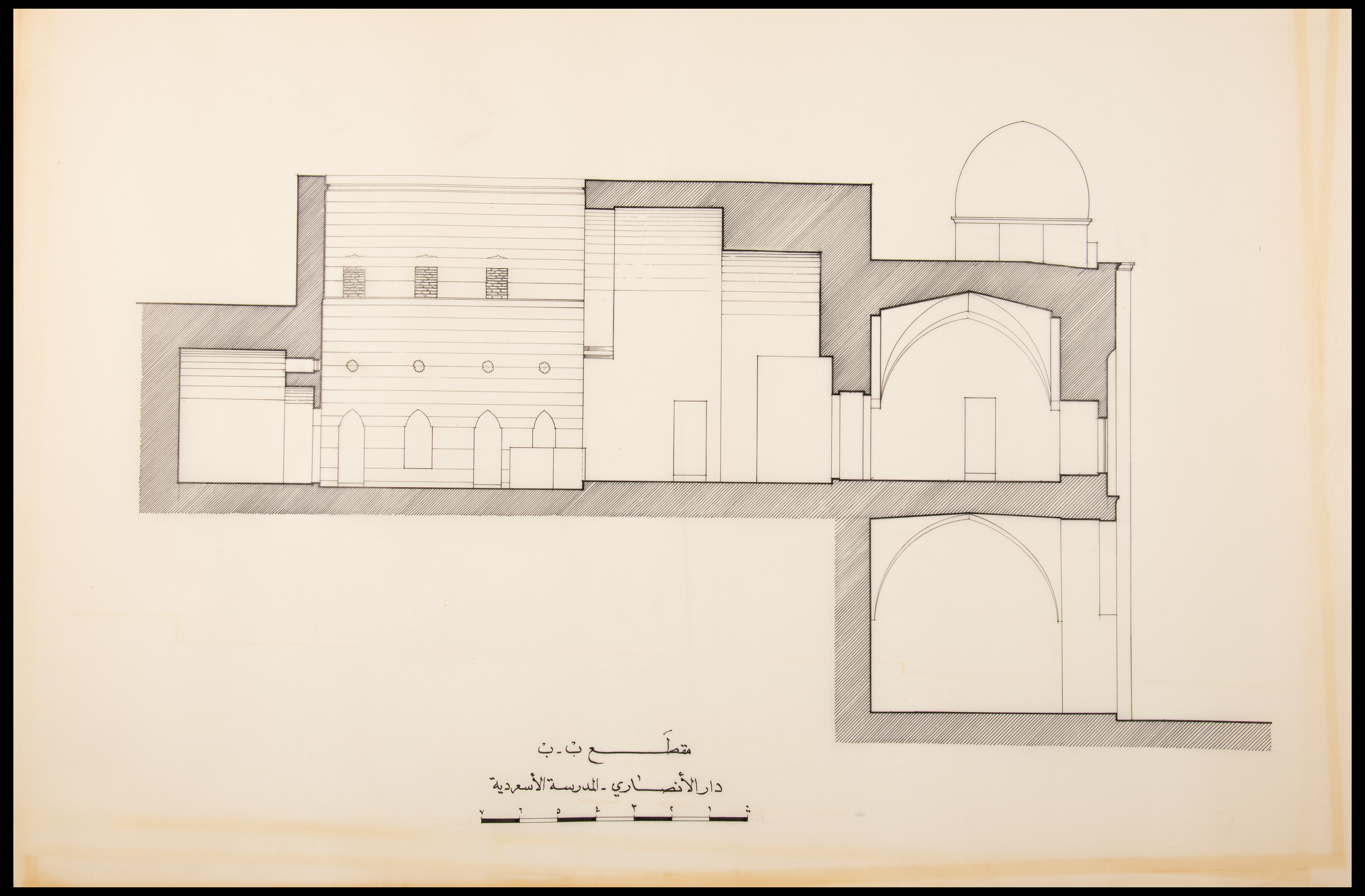 Drawn by Sameh Aboushi in the 1990s, this document shows the "B-B Section" plan of the al-Ansari Family house- al-As'ardeyyah School in the Old City of Jerusalem.