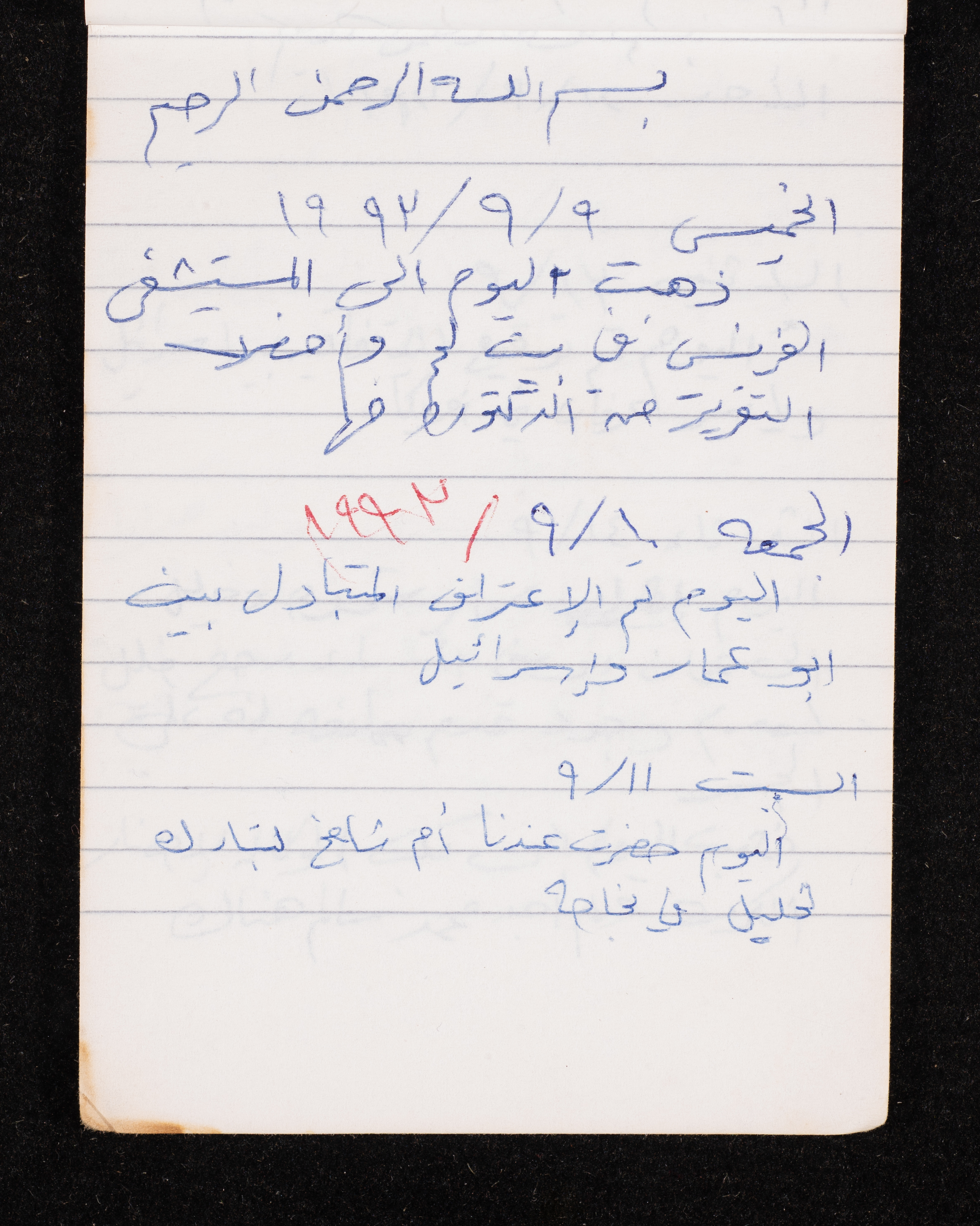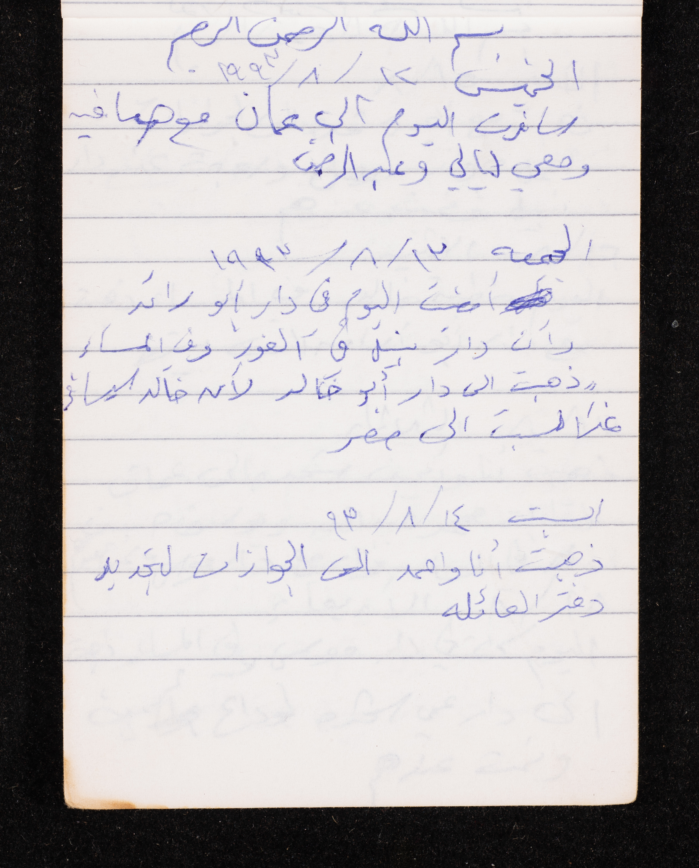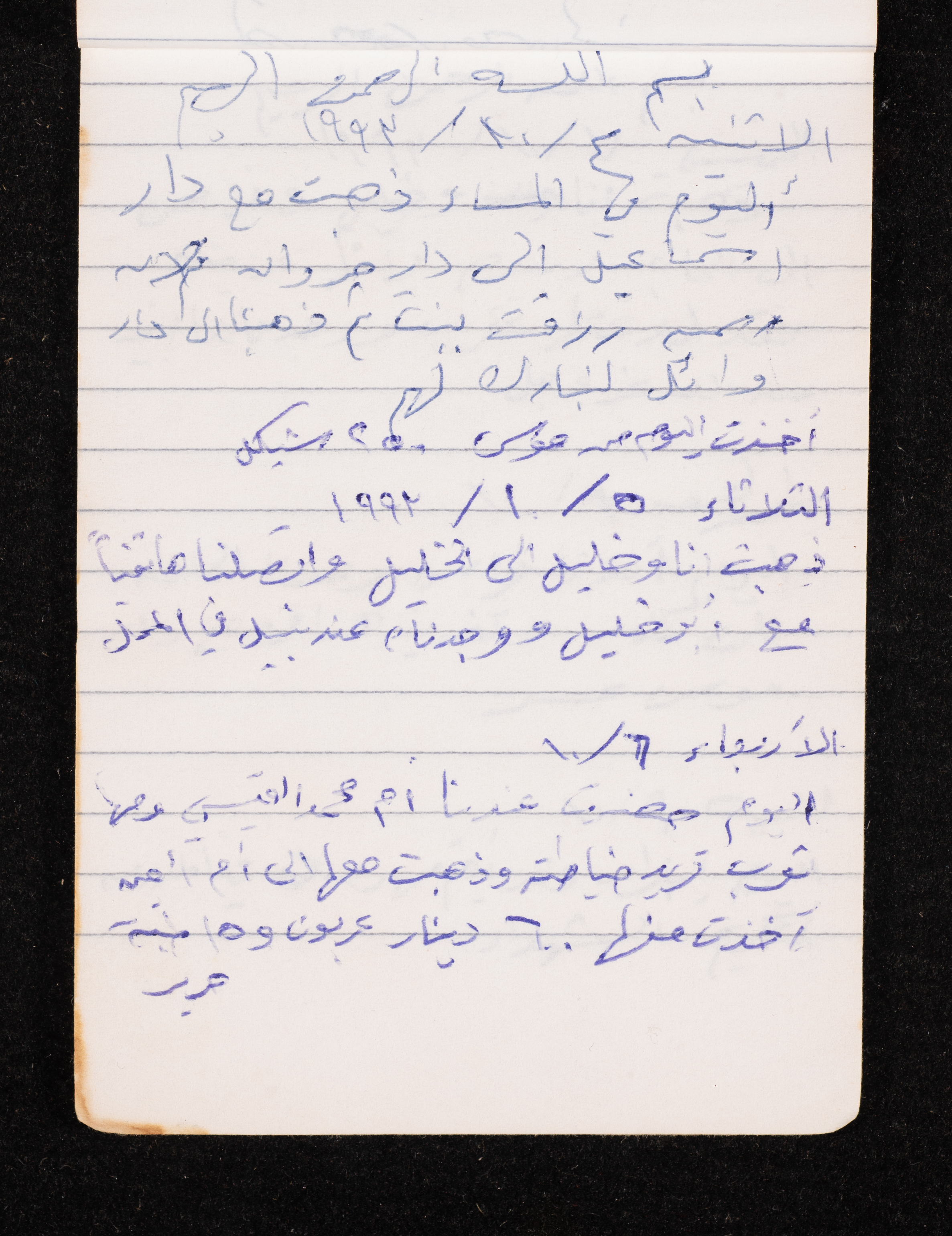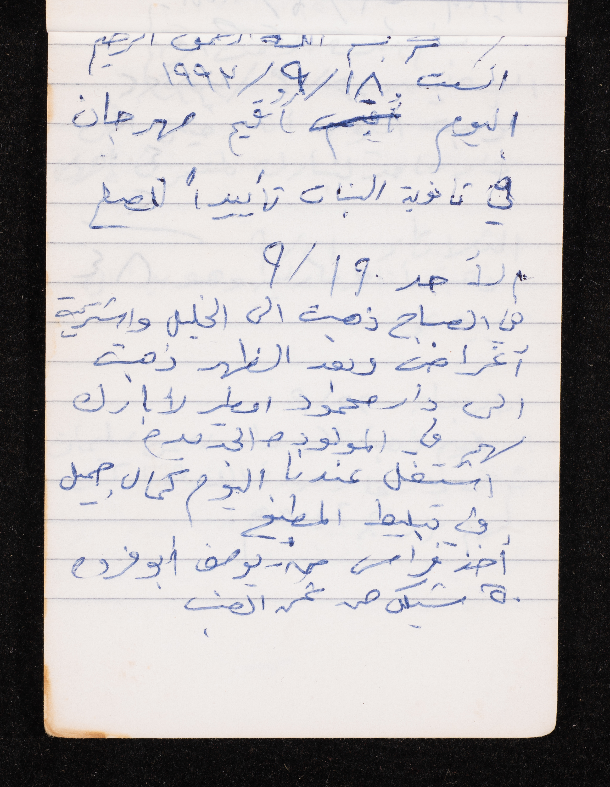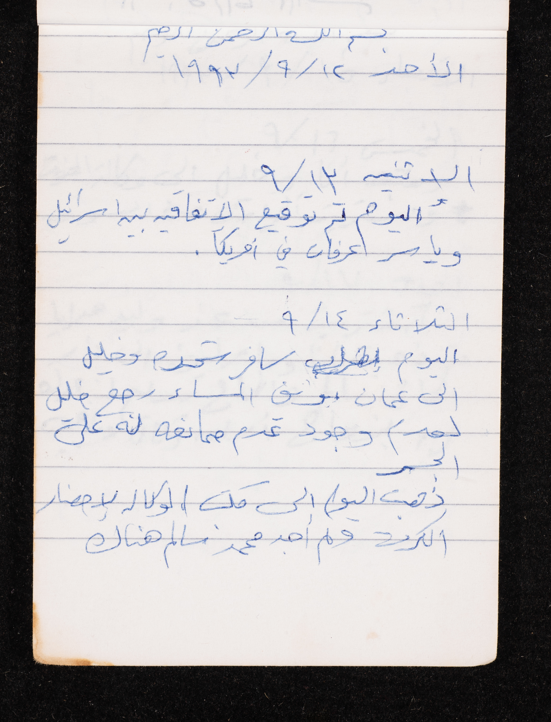 Written in 1993, this 40-page document shows the diaries of Fadeyyeh Darabe, in which she described the time she spent with her family in Dura-Hebron, her social relations, travelling to Jordan, trying to secure a scholarship for her son Khalil and on 13 September 1993, she wrote that an agreement between the Israeli Occupation and Yasser Arafat (Abu Ammar) was signed in the United States of America (USA).