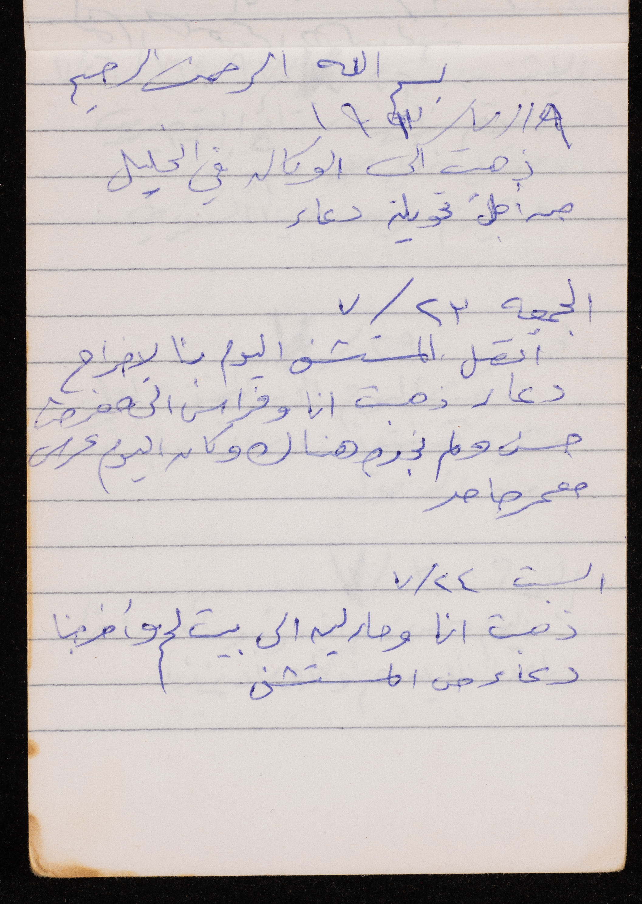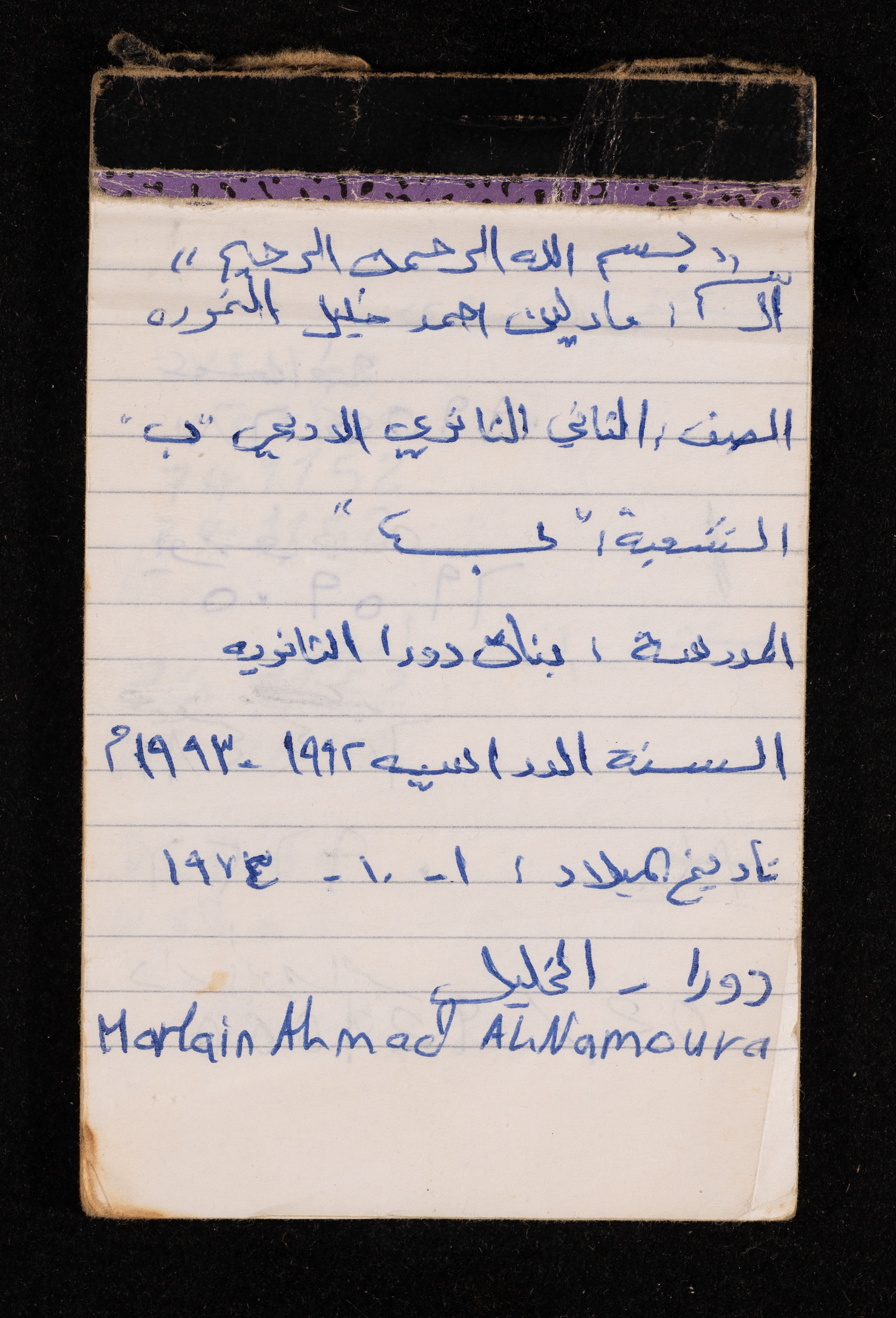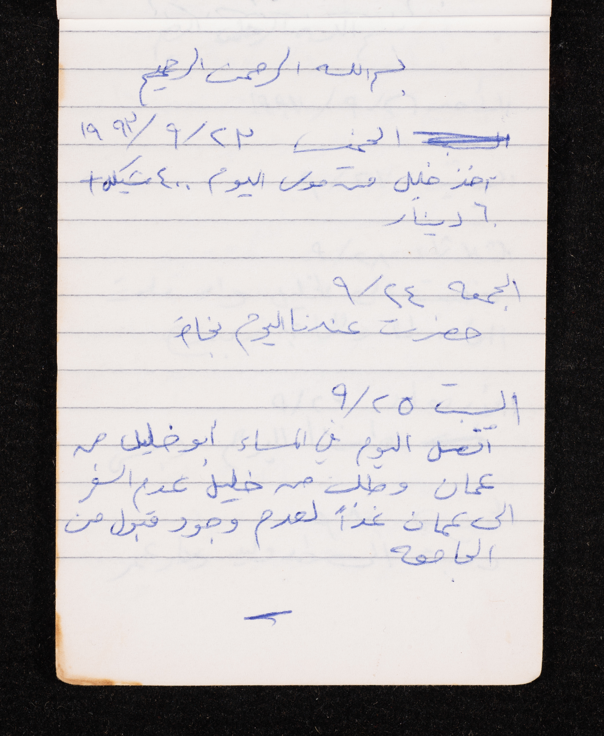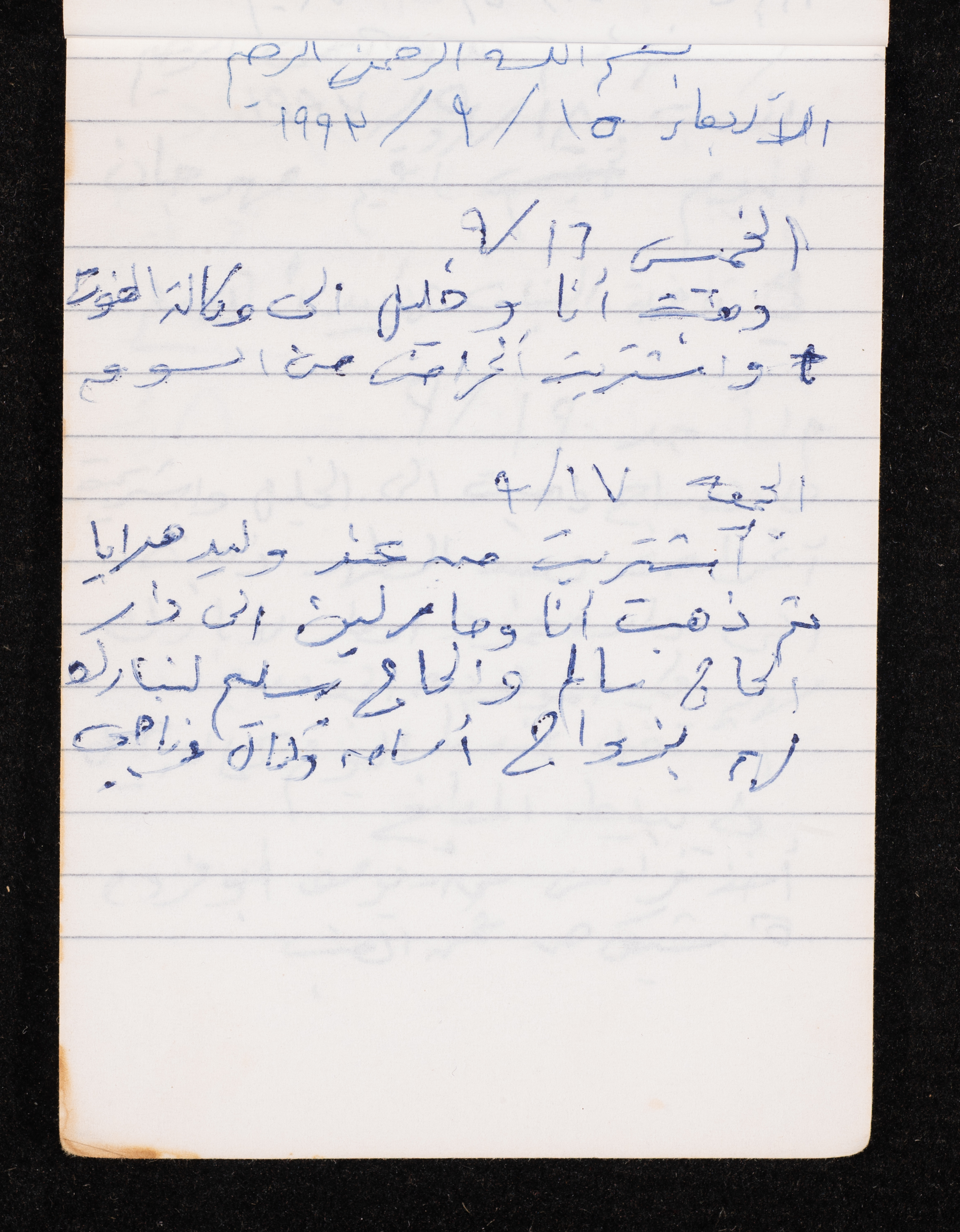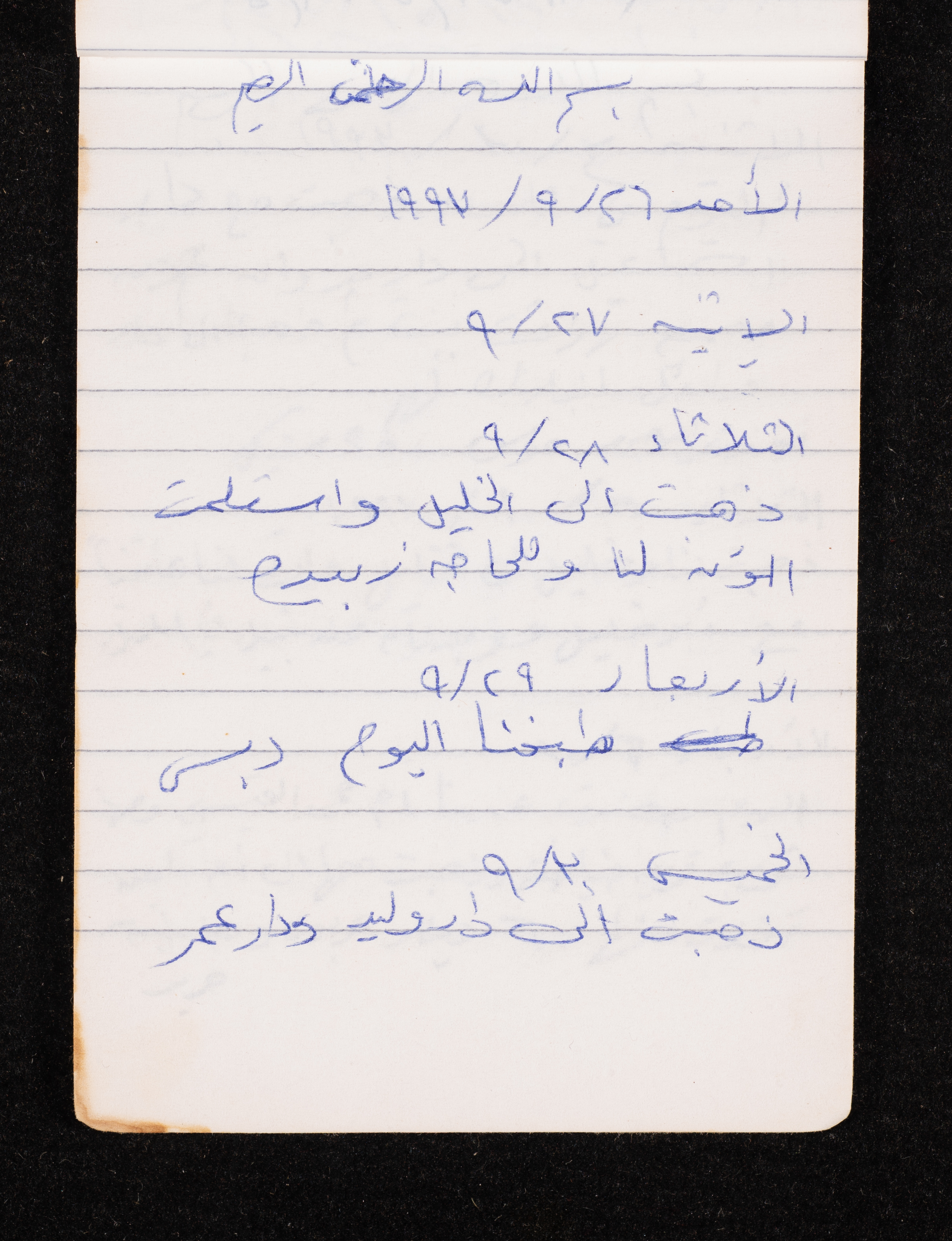 Written in 1993, this 40-page document shows the diaries of Fadeyyeh Darabe, in which she described the time she spent with her family in Dura-Hebron, her social relations, travelling to Jordan, trying to secure a scholarship for her son Khalil and on 13 September 1993, she wrote that an agreement between the Israeli Occupation and Yasser Arafat (Abu Ammar) was signed in the United States of America (USA).