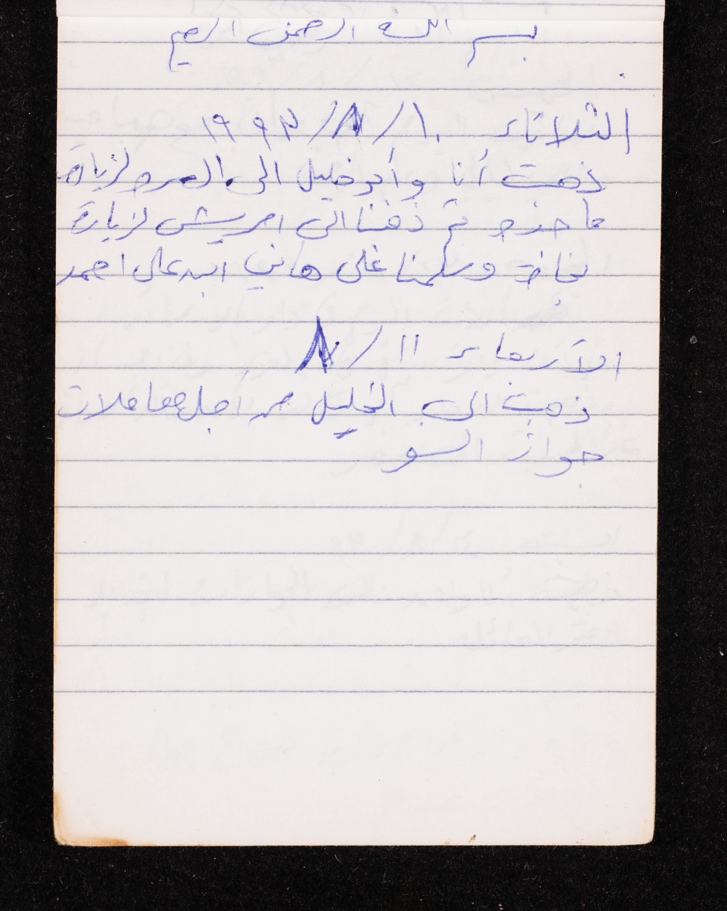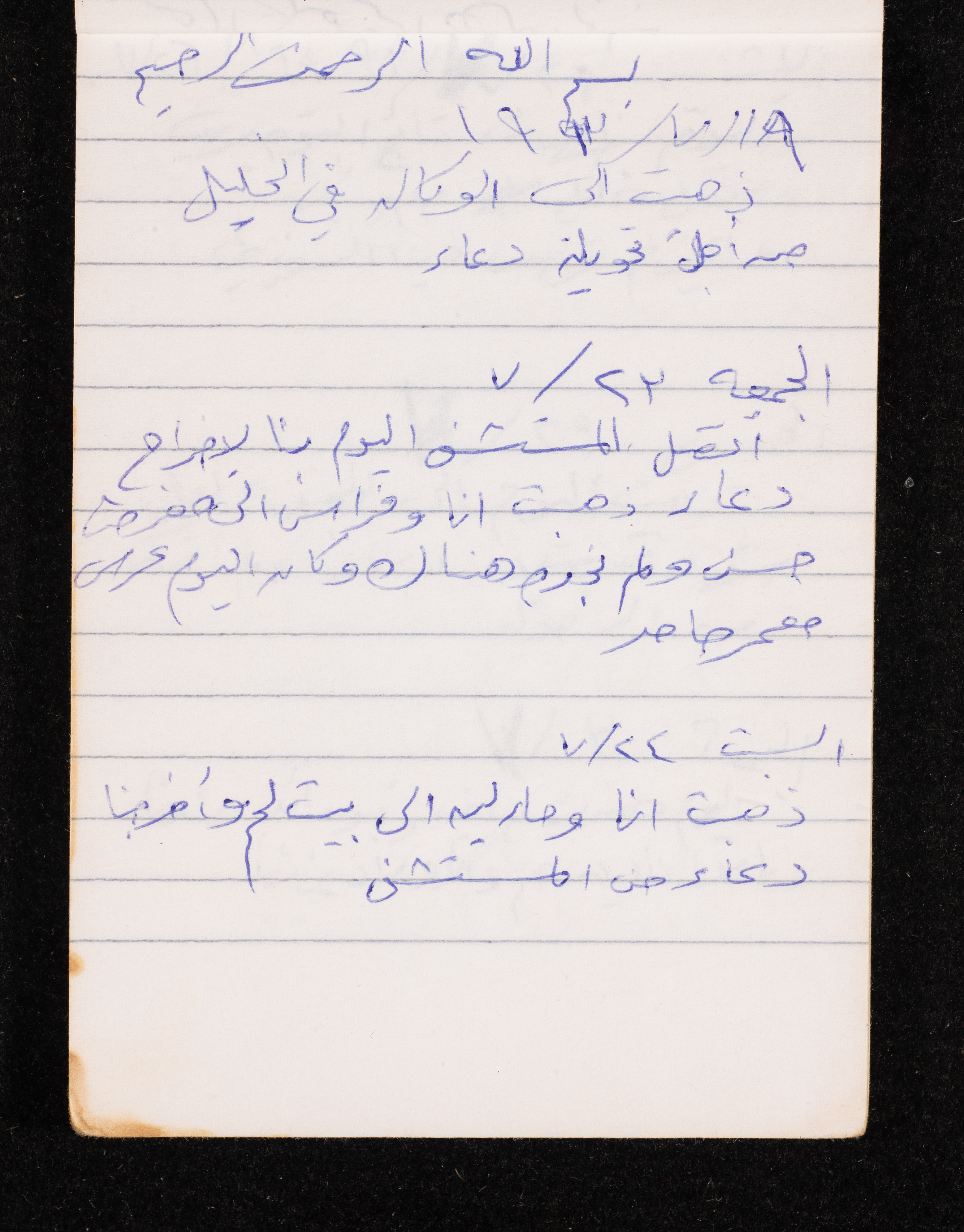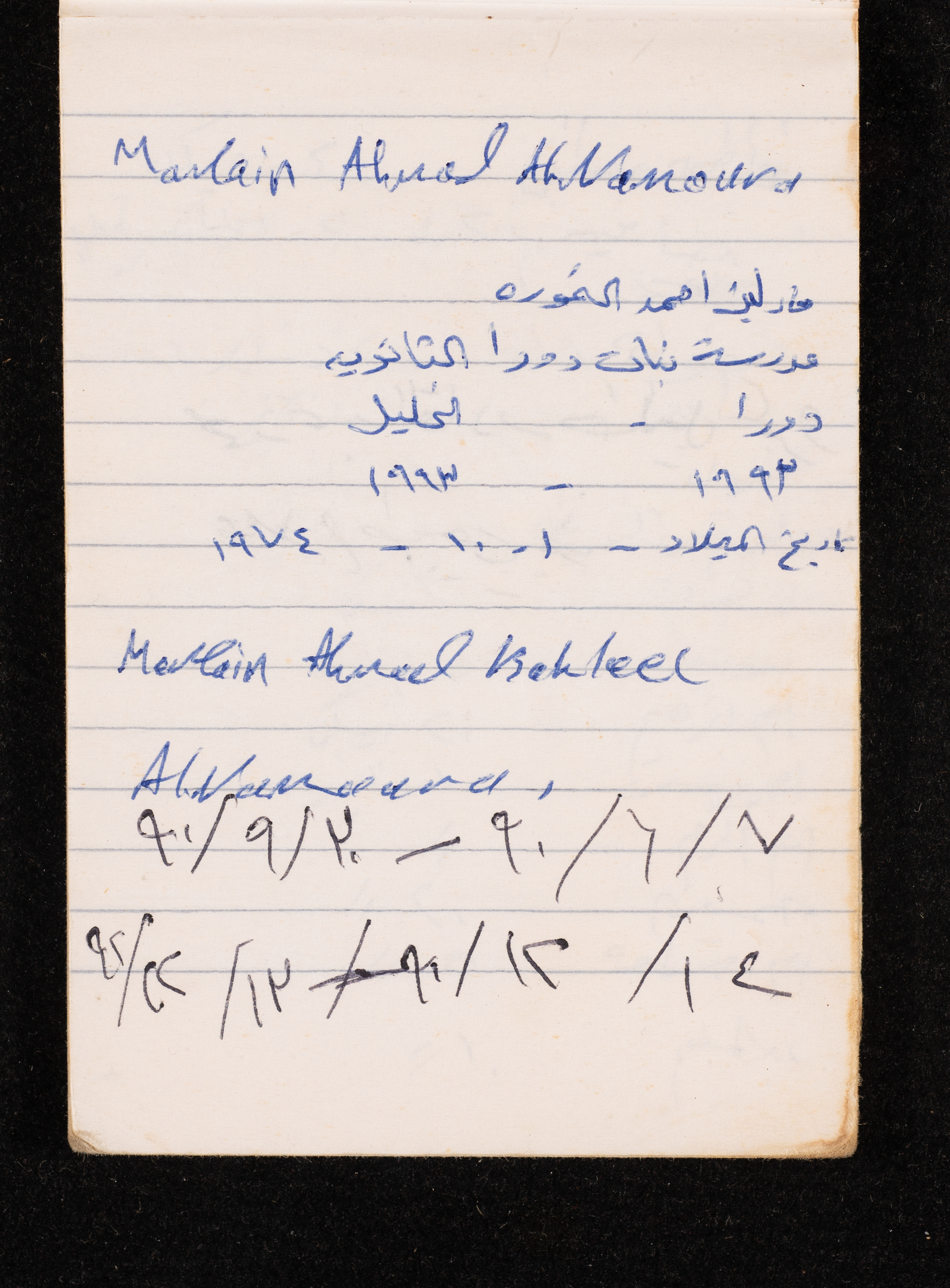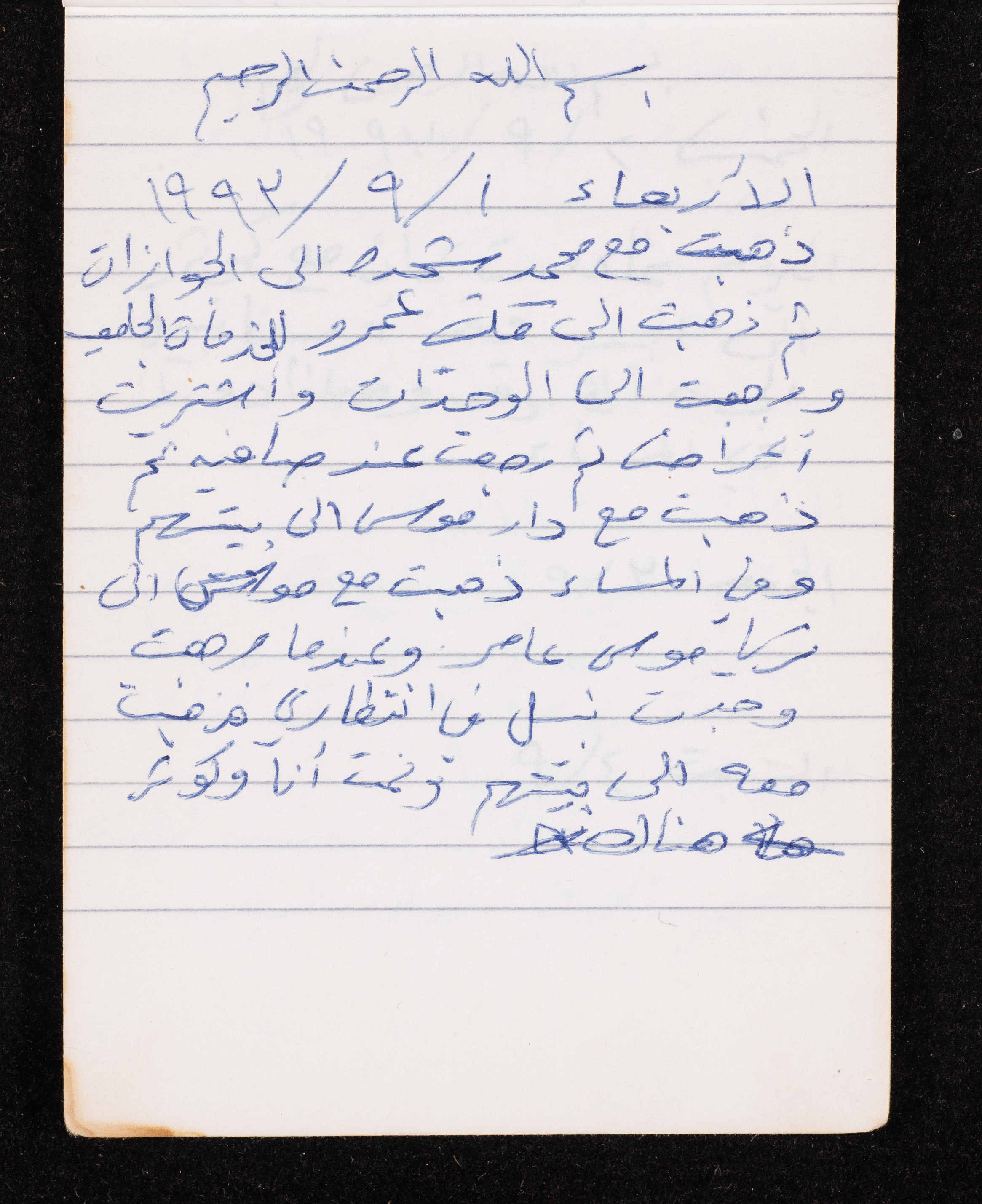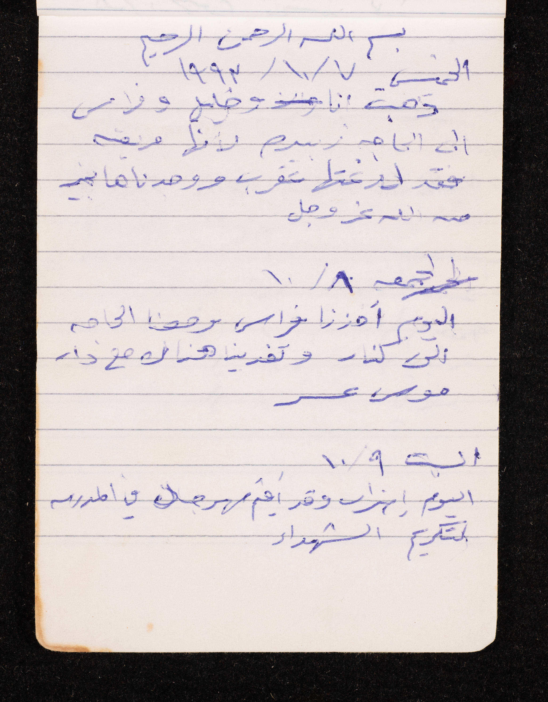 Written in 1993, this 40-page document shows the diaries of Fadeyyeh Darabe, in which she described the time she spent with her family in Dura-Hebron, her social relations, travelling to Jordan, trying to secure a scholarship for her son Khalil and on 13 September 1993, she wrote that an agreement between the Israeli Occupation and Yasser Arafat (Abu Ammar) was signed in the United States of America (USA).