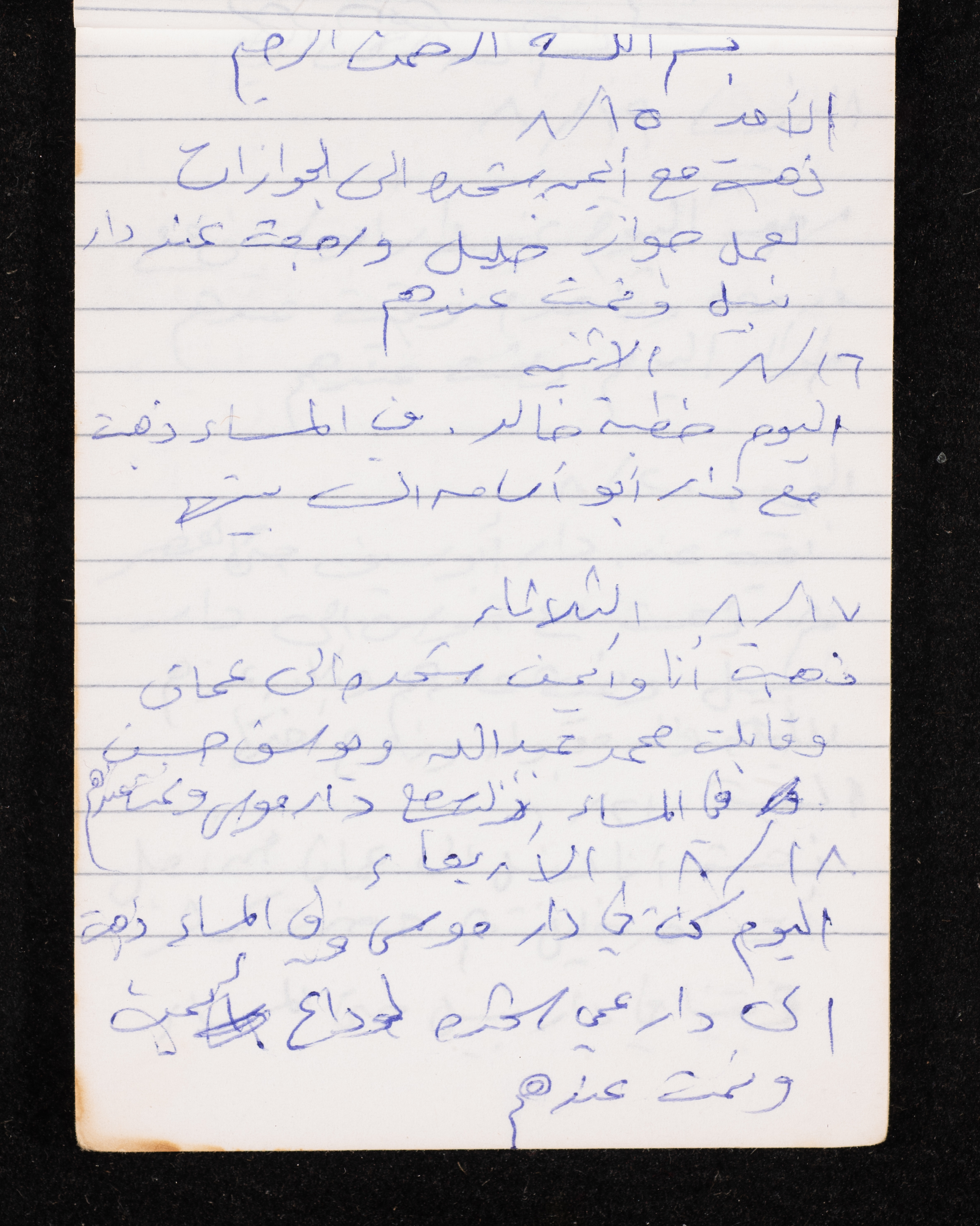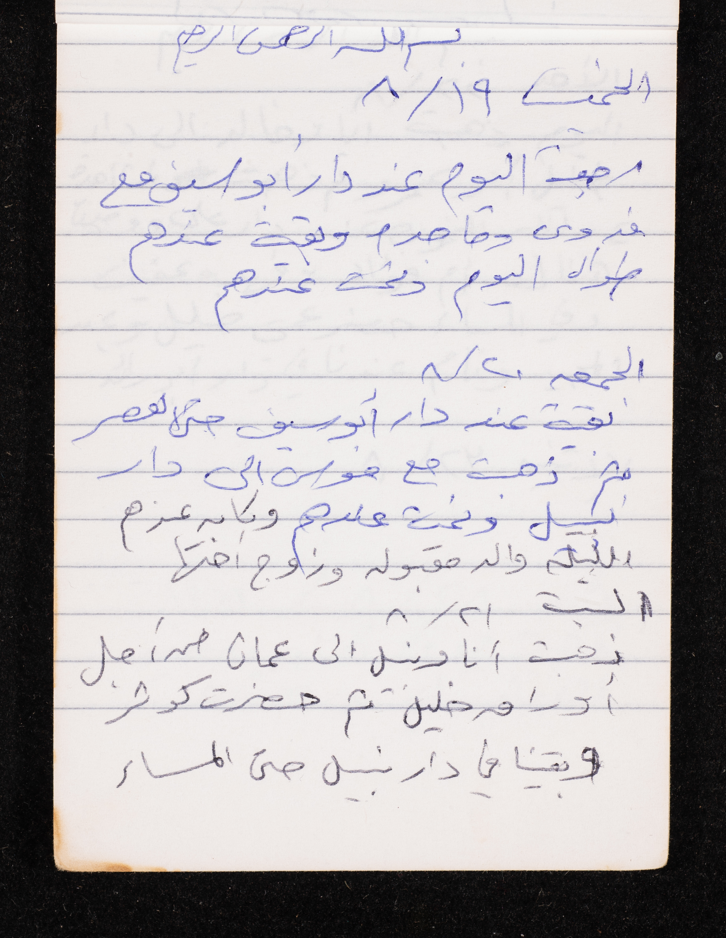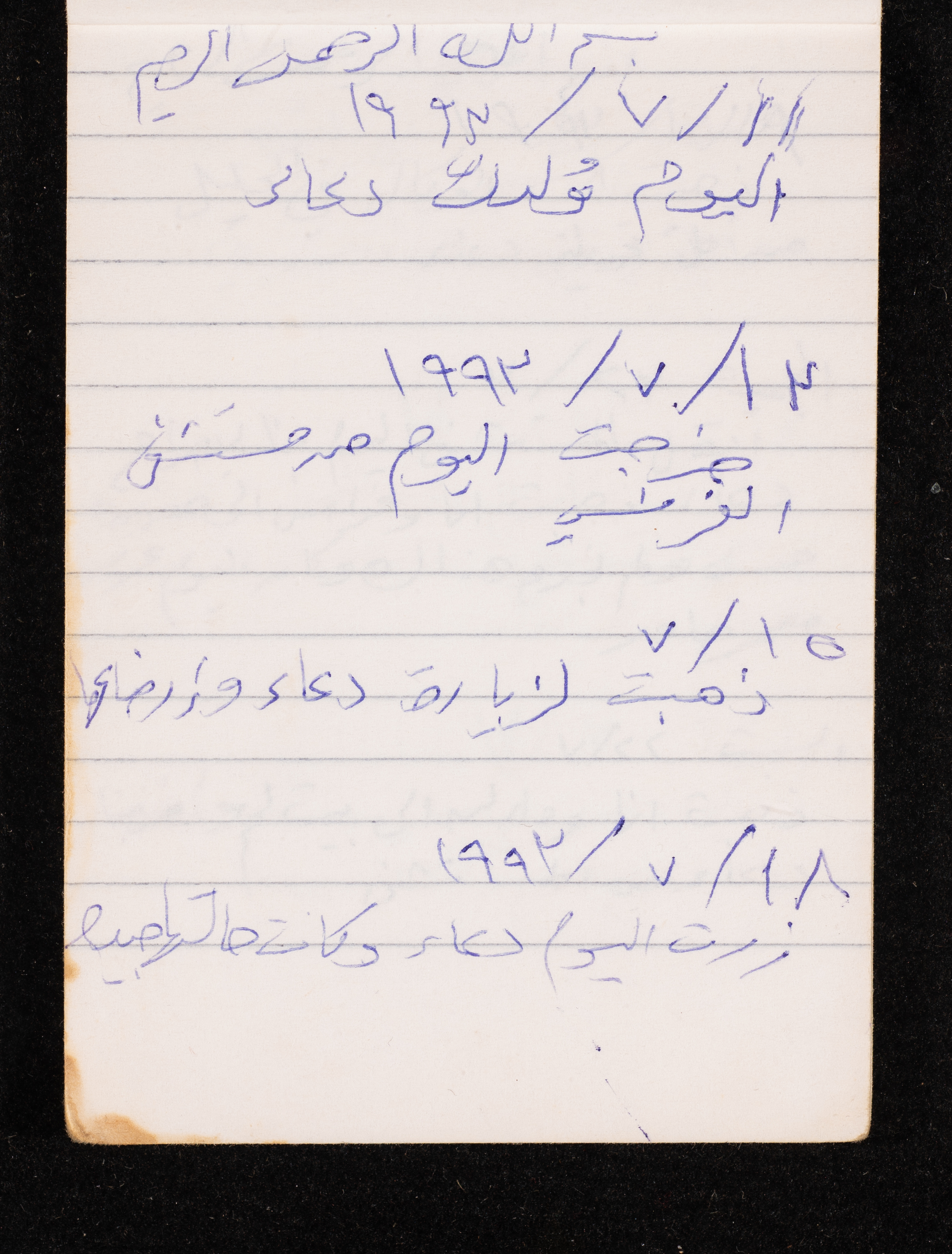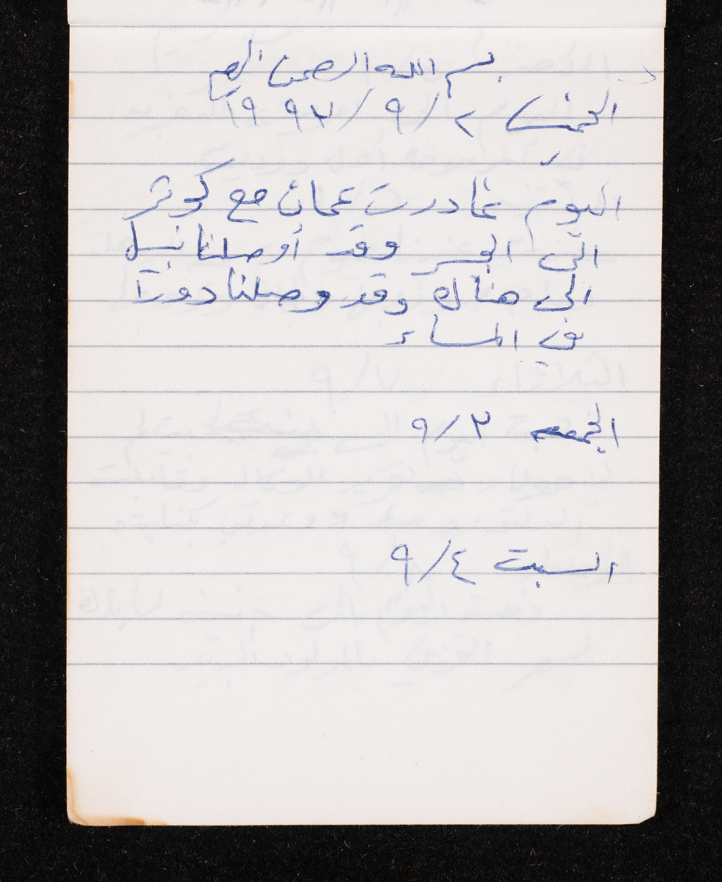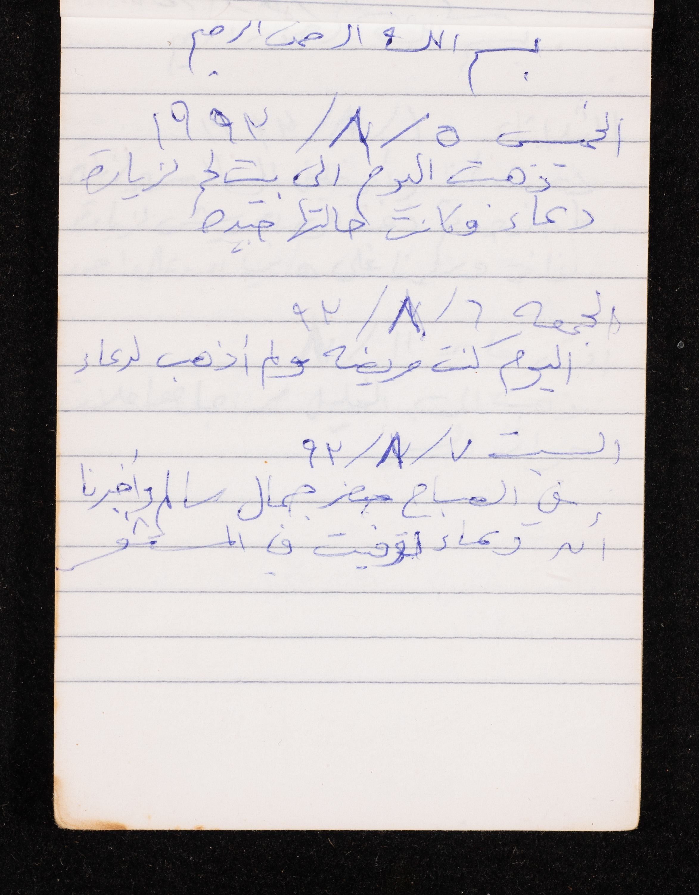 Written in 1993, this 40-page document shows the diaries of Fadeyyeh Darabe, in which she described the time she spent with her family in Dura-Hebron, her social relations, travelling to Jordan, trying to secure a scholarship for her son Khalil and on 13 September 1993, she wrote that an agreement between the Israeli Occupation and Yasser Arafat (Abu Ammar) was signed in the United States of America (USA).