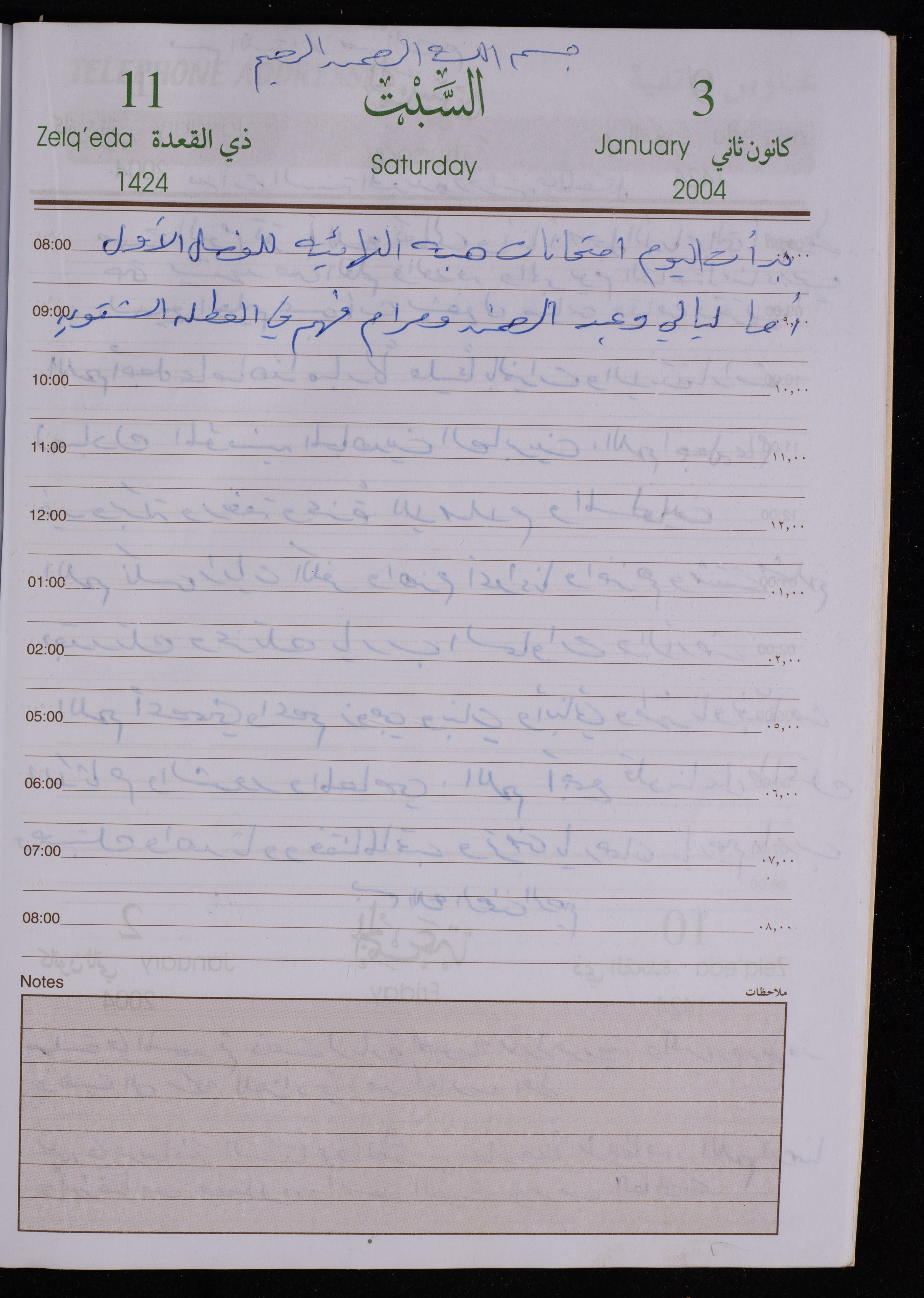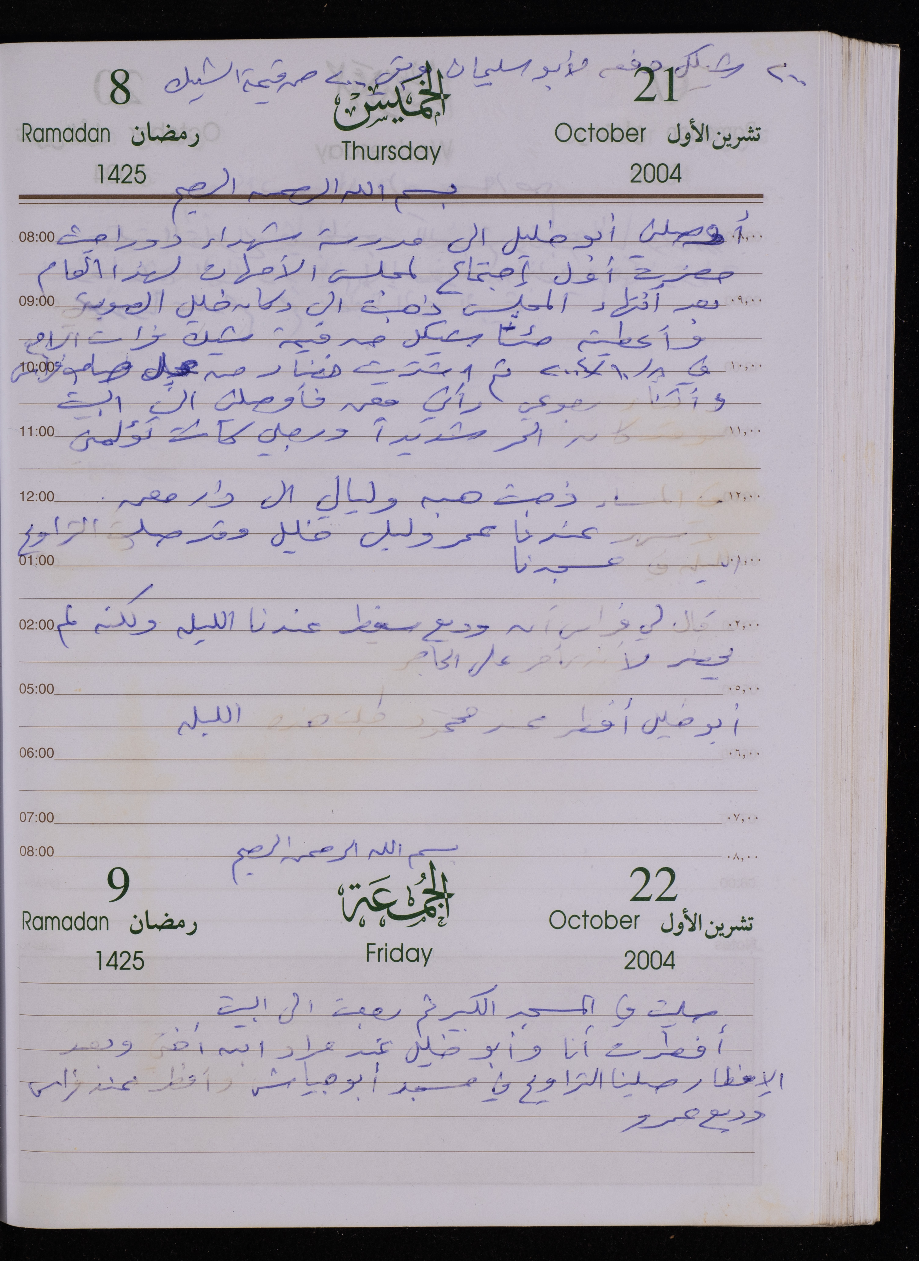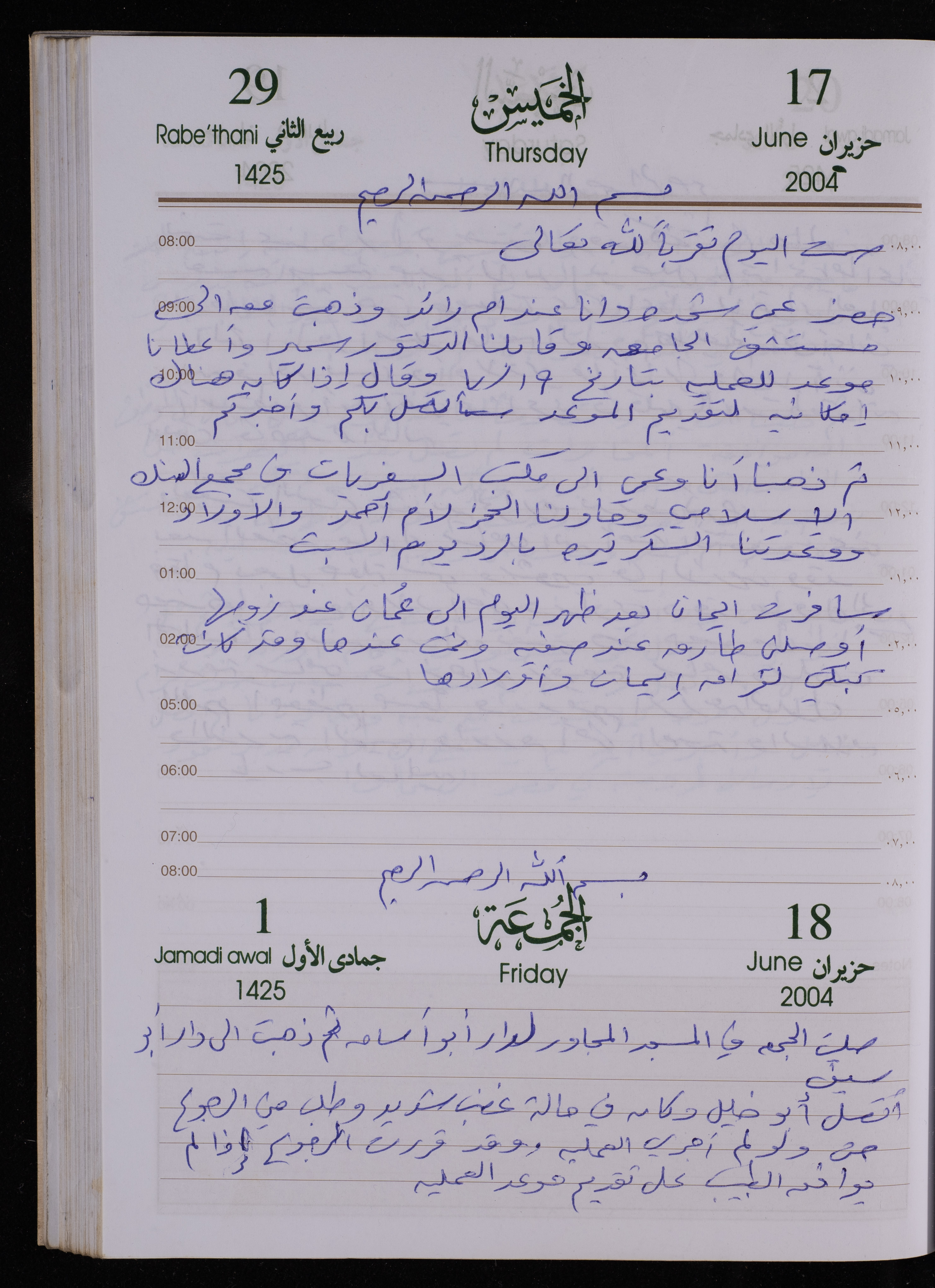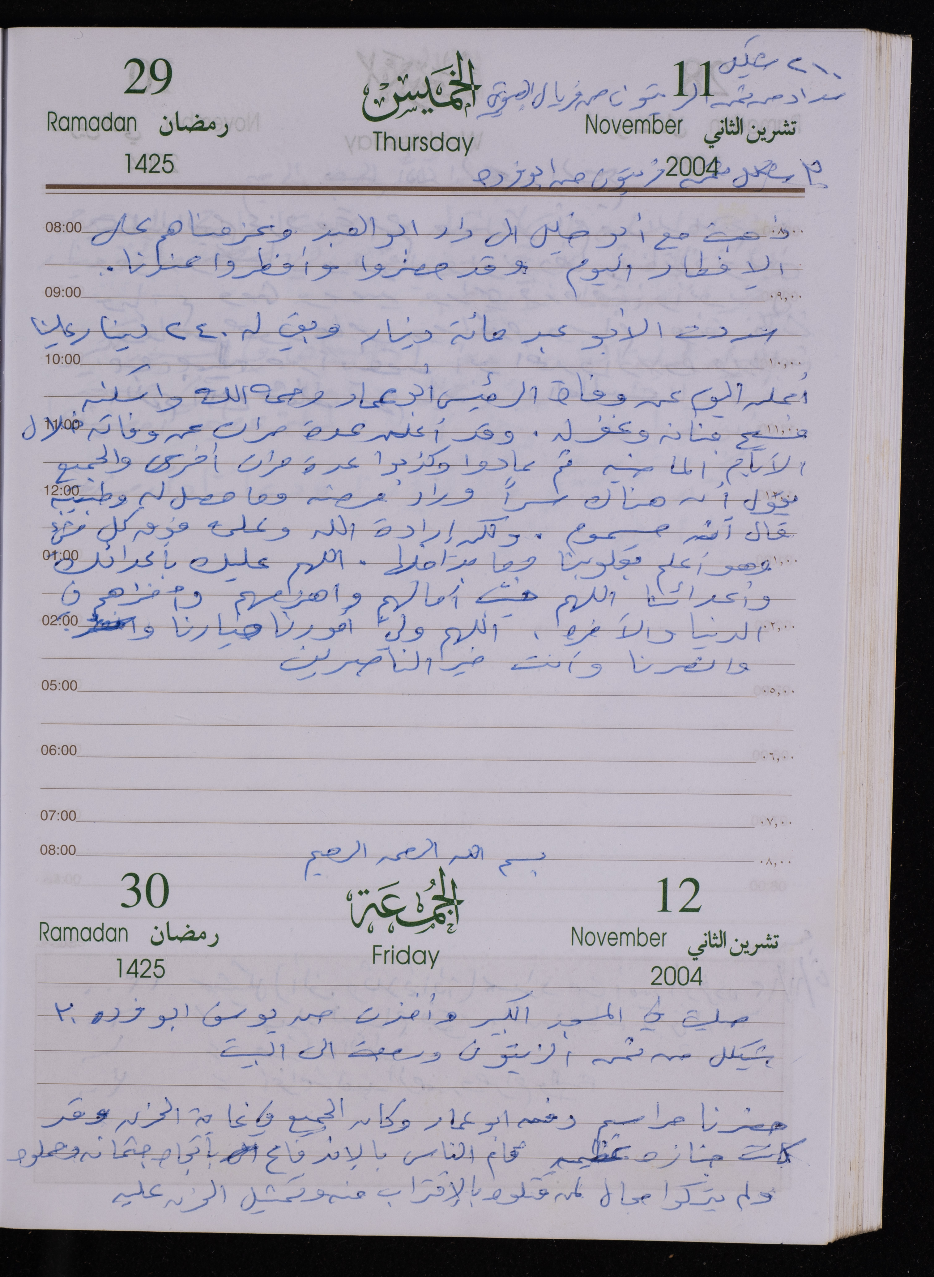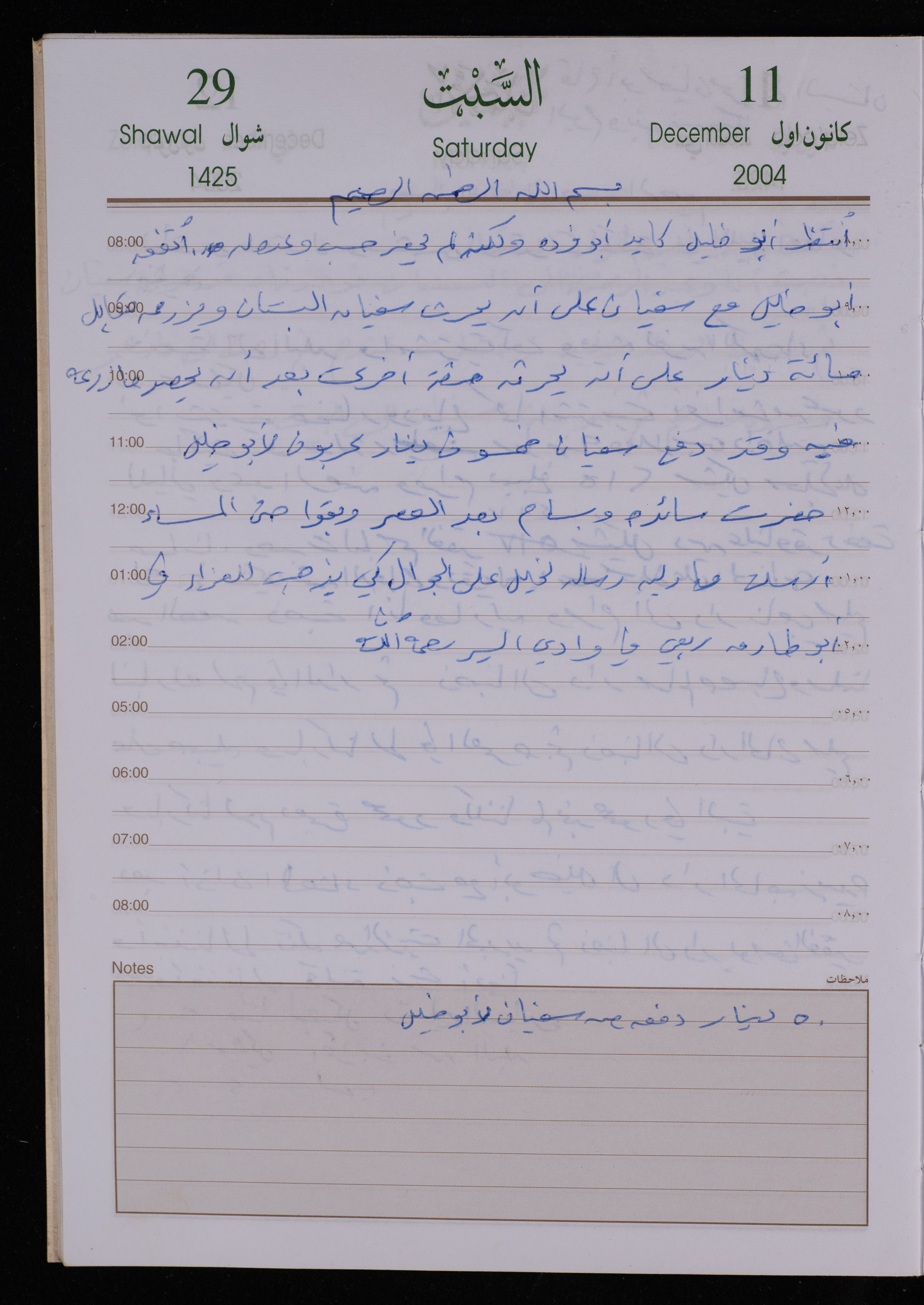 Written in 2004, this 239-page document shows the diaries of Fadeyyeh Darabe, where she described her and her family's life in Dura-Hebron including her son Khalil opening his clinic, registering financial accounts, her social relations, travelling to Jordan, striving to find health insurance for herself, a familial dispute regarding the land of Lunqur and some political events in Palestine including the death of Yasser Arafat (Abu Ammar), the attacks of the Israeli Occupation Forces (IOF) against Palestinians and arresting her son Firas, the prisoners in the Occupation's prisons striking and providing curriculum literacy books for prisoners inside Israeli prisons.