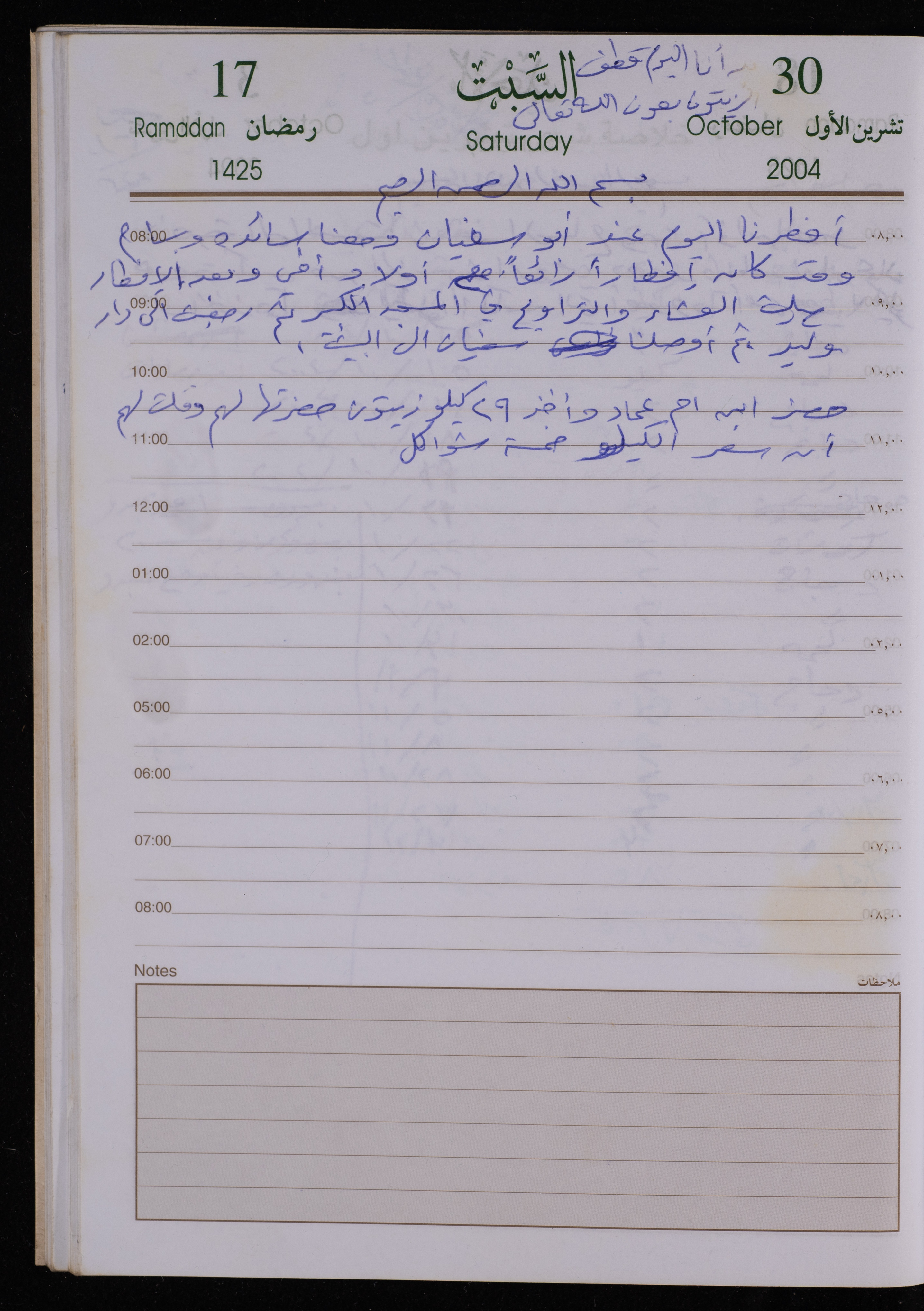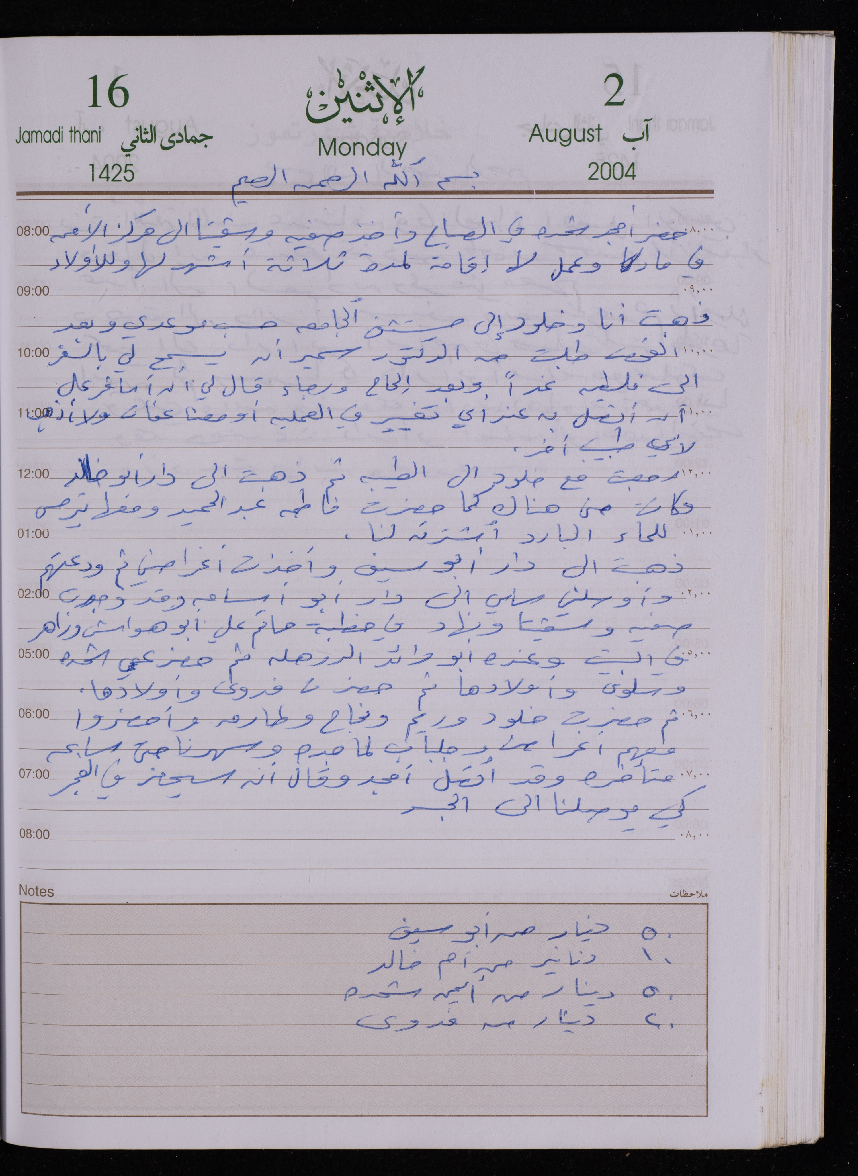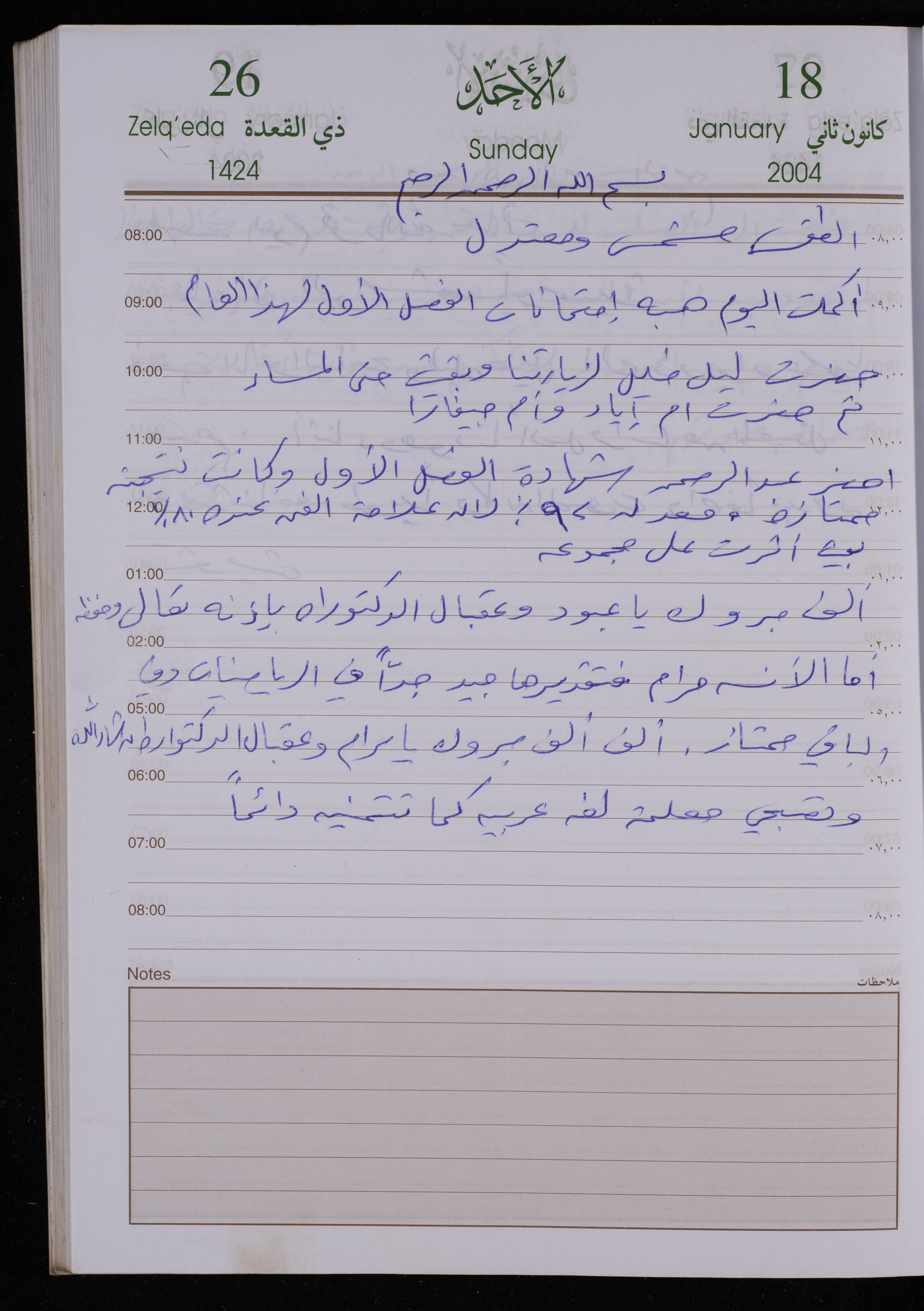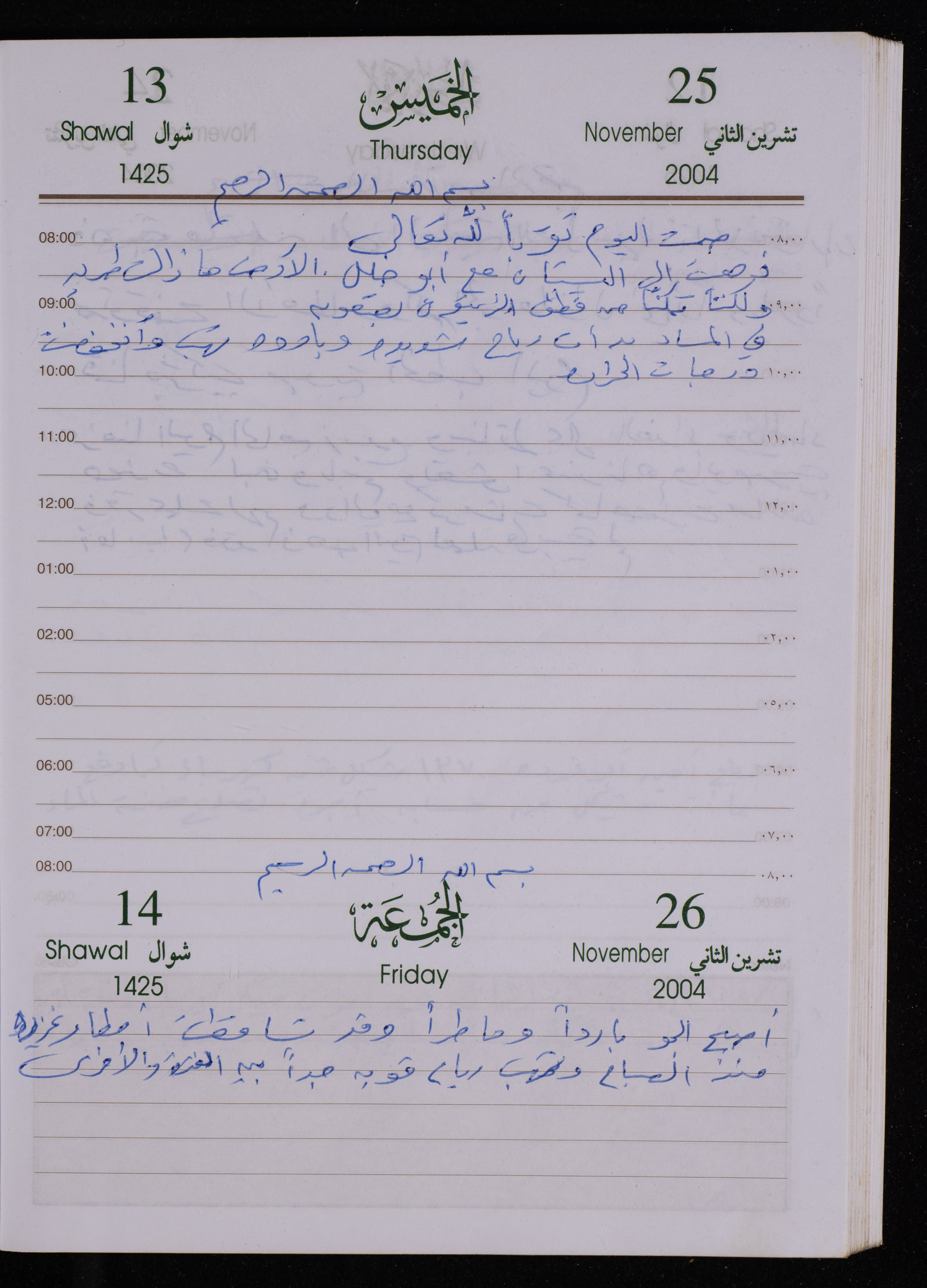 Written in 2004, this 239-page document shows the diaries of Fadeyyeh Darabe, where she described her and her family's life in Dura-Hebron including her son Khalil opening his clinic, registering financial accounts, her social relations, travelling to Jordan, striving to find health insurance for herself, a familial dispute regarding the land of Lunqur and some political events in Palestine including the death of Yasser Arafat (Abu Ammar), the attacks of the Israeli Occupation Forces (IOF) against Palestinians and arresting her son Firas, the prisoners in the Occupation's prisons striking and providing curriculum literacy books for prisoners inside Israeli prisons.