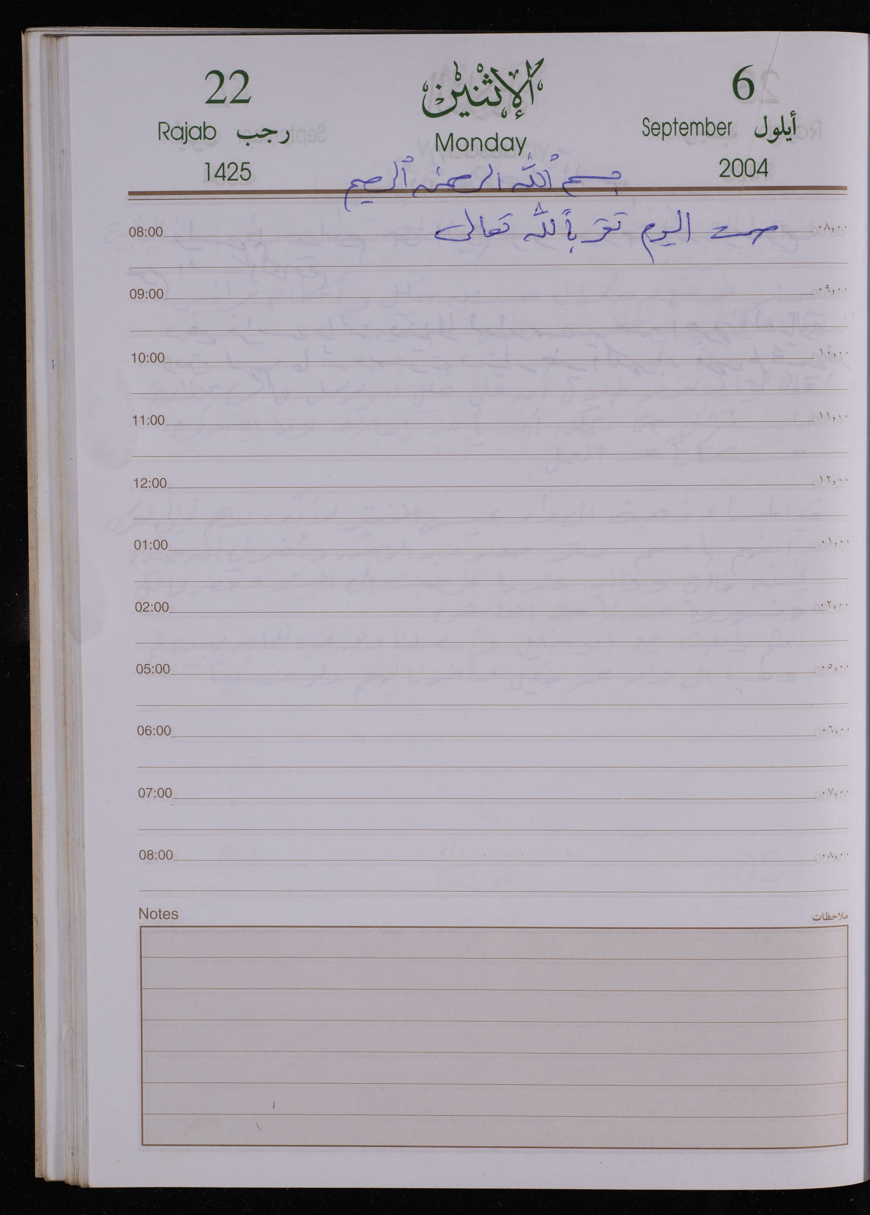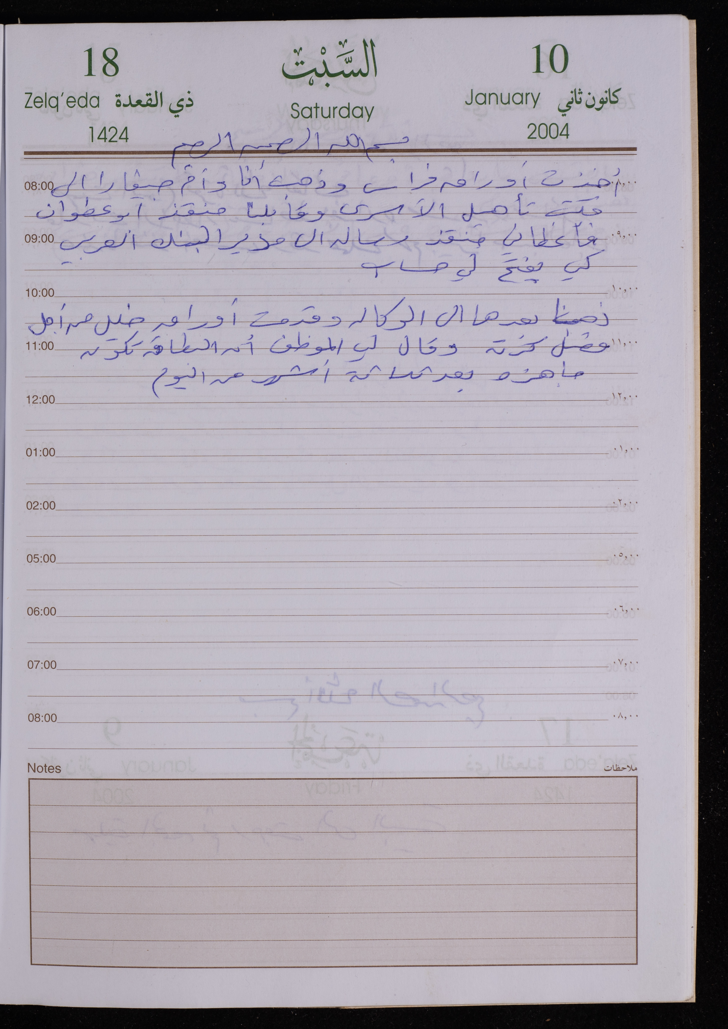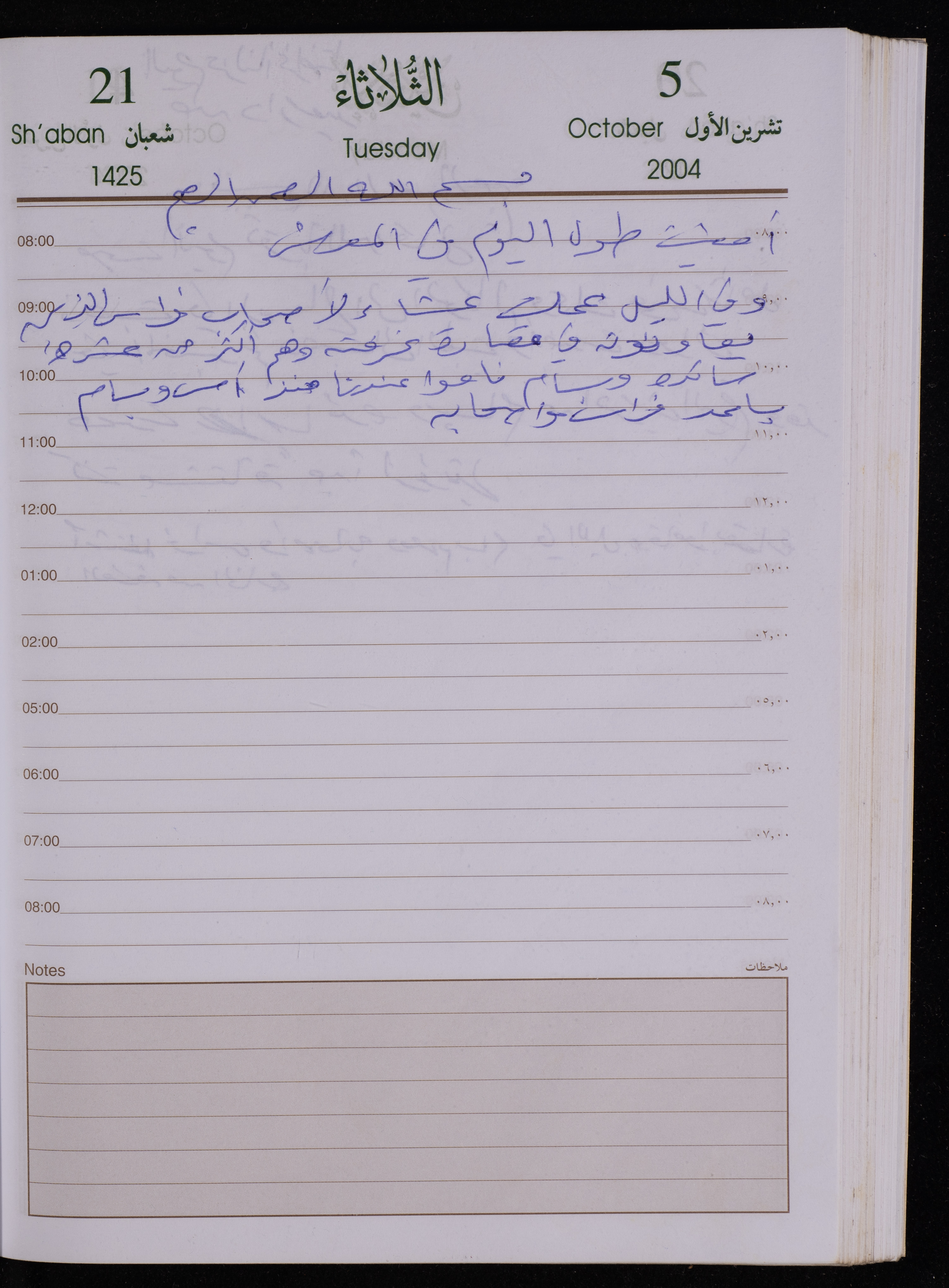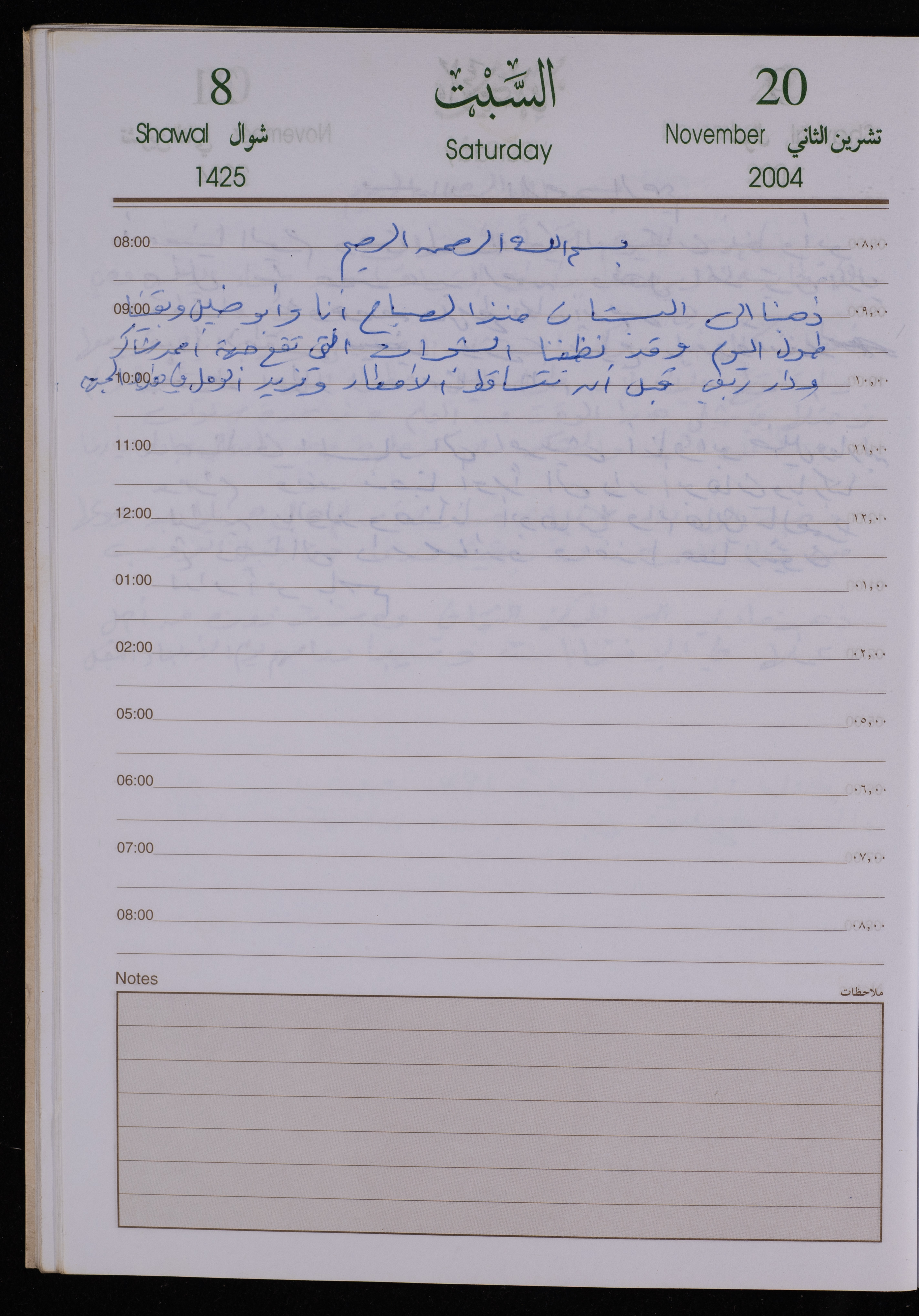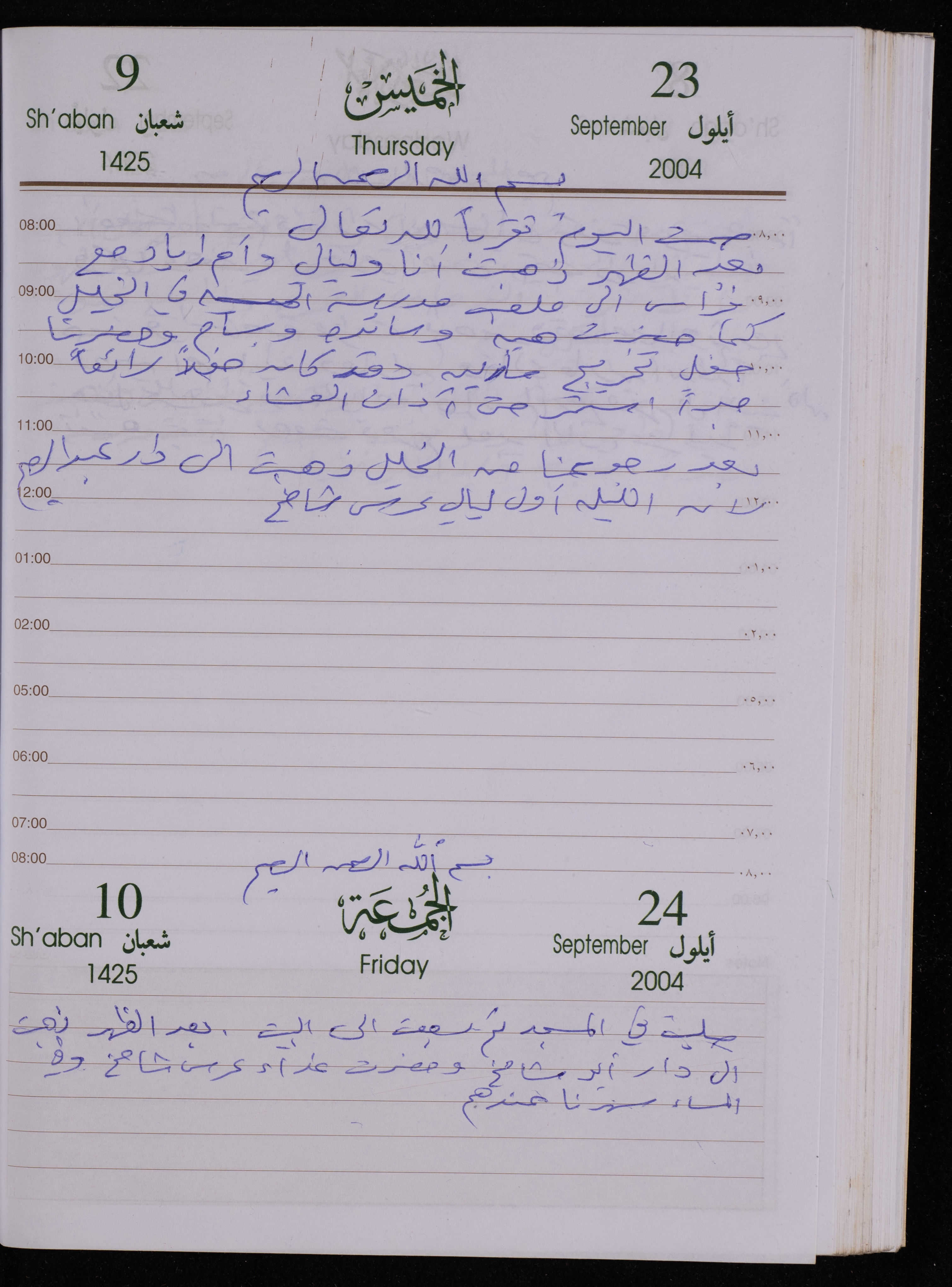 Written in 2004, this 239-page document shows the diaries of Fadeyyeh Darabe, where she described her and her family's life in Dura-Hebron including her son Khalil opening his clinic, registering financial accounts, her social relations, travelling to Jordan, striving to find health insurance for herself, a familial dispute regarding the land of Lunqur and some political events in Palestine including the death of Yasser Arafat (Abu Ammar), the attacks of the Israeli Occupation Forces (IOF) against Palestinians and arresting her son Firas, the prisoners in the Occupation's prisons striking and providing curriculum literacy books for prisoners inside Israeli prisons.