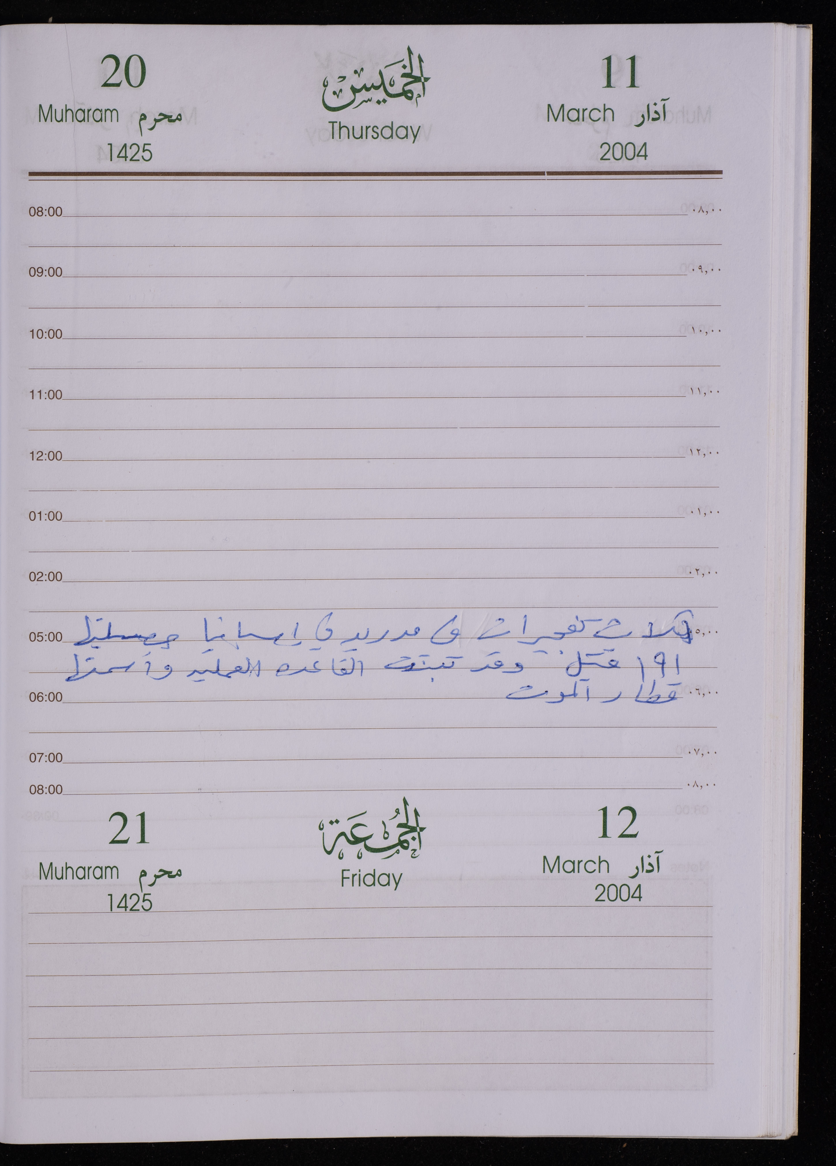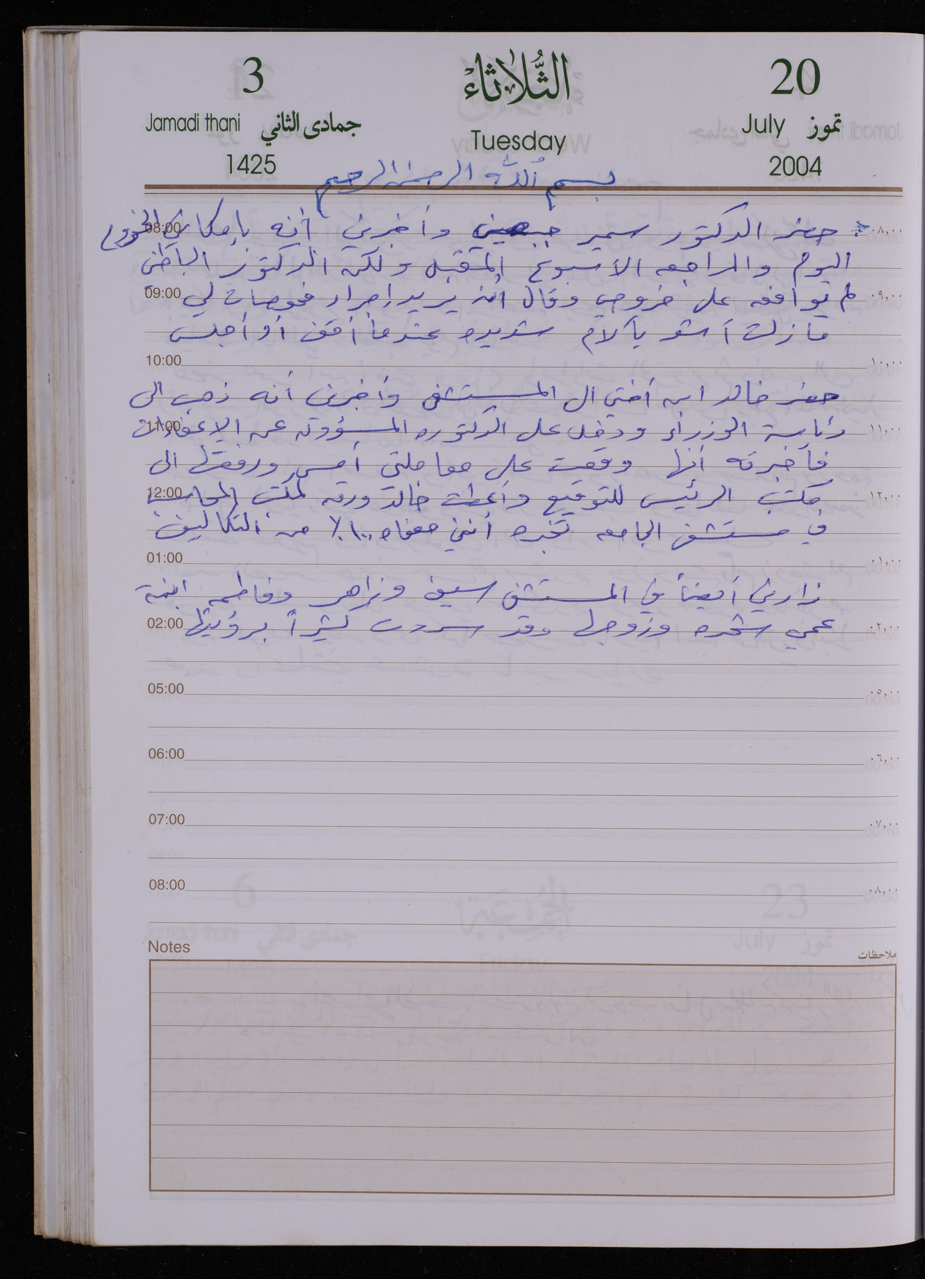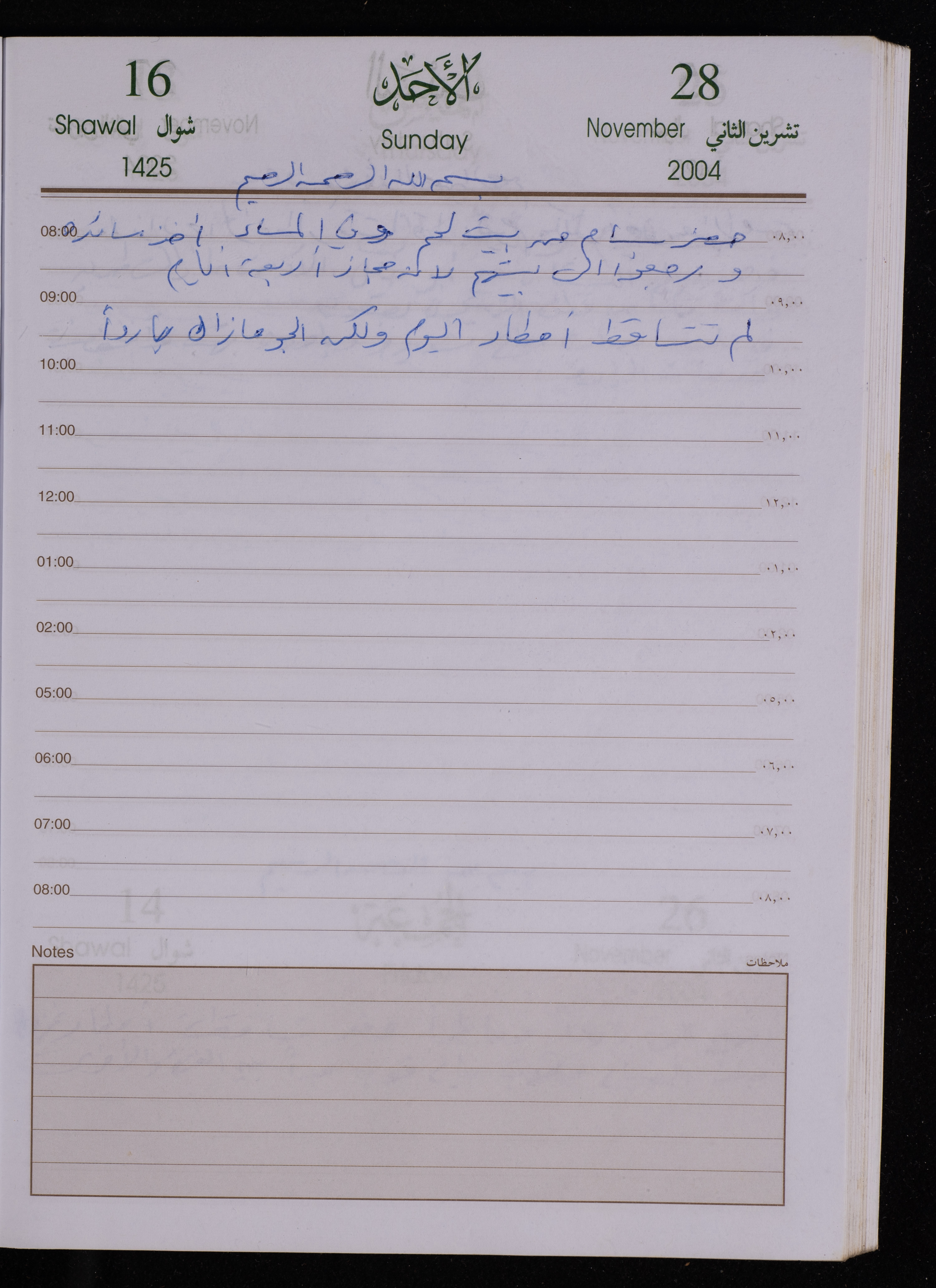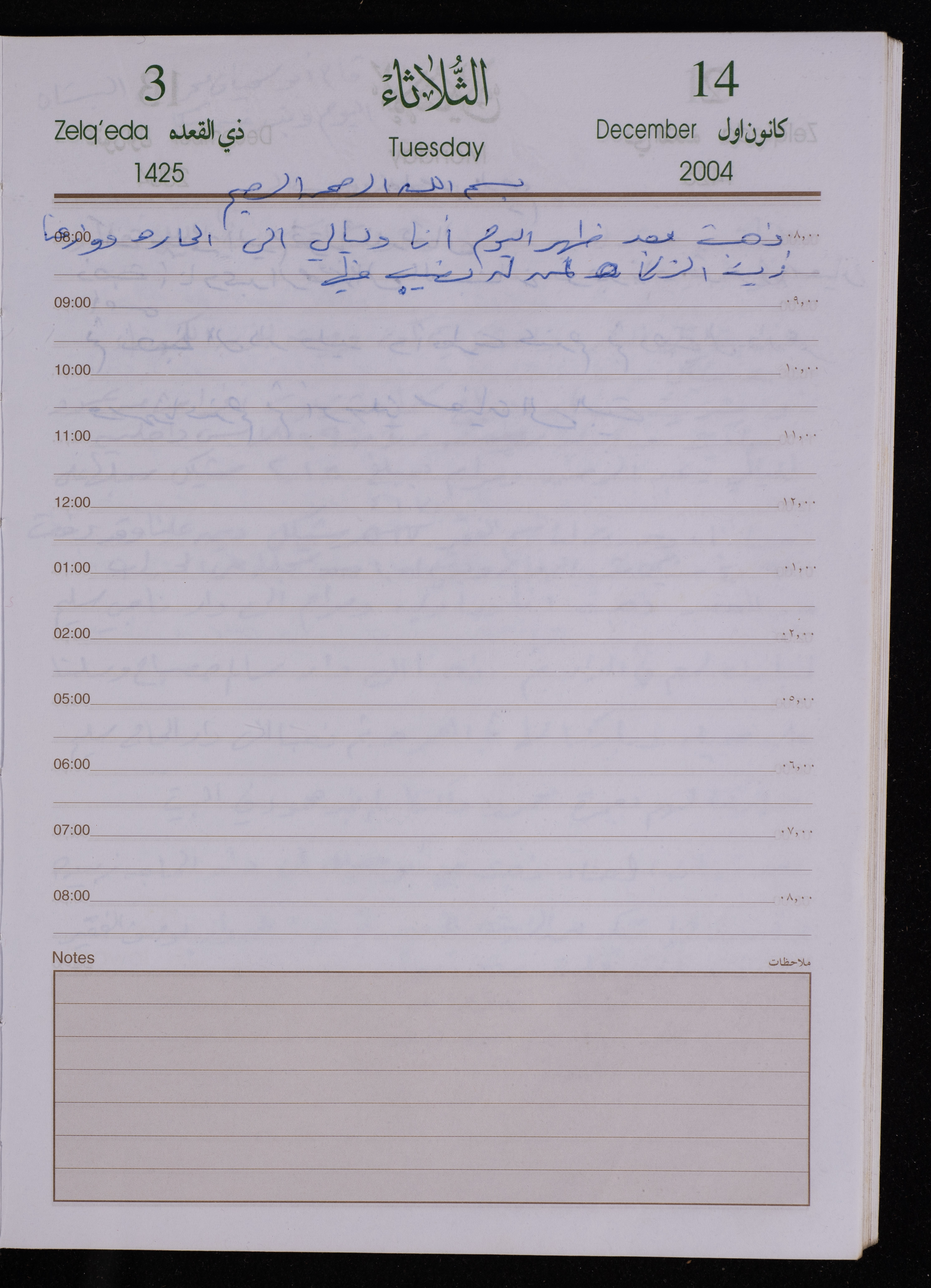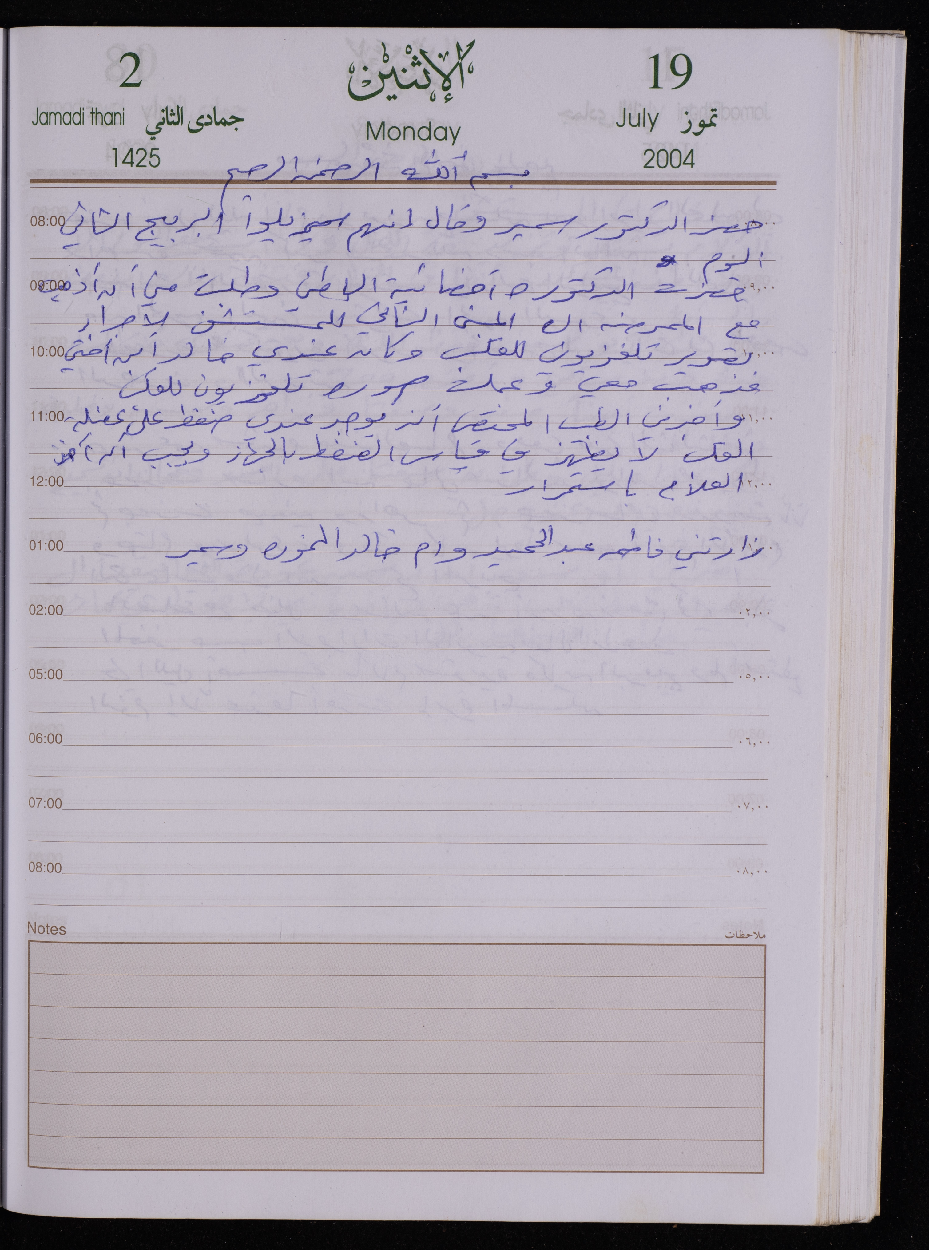 Written in 2004, this 239-page document shows the diaries of Fadeyyeh Darabe, where she described her and her family's life in Dura-Hebron including her son Khalil opening his clinic, registering financial accounts, her social relations, travelling to Jordan, striving to find health insurance for herself, a familial dispute regarding the land of Lunqur and some political events in Palestine including the death of Yasser Arafat (Abu Ammar), the attacks of the Israeli Occupation Forces (IOF) against Palestinians and arresting her son Firas, the prisoners in the Occupation's prisons striking and providing curriculum literacy books for prisoners inside Israeli prisons.