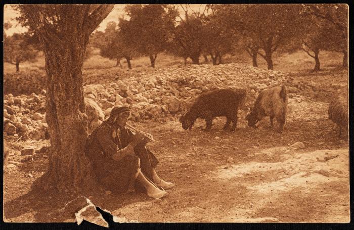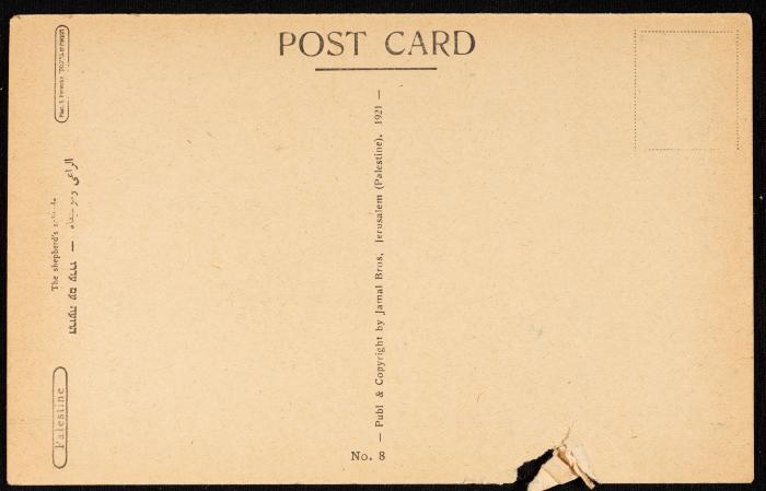 This document shows a postcard with a photograph titled "The Shephard's Solitude" of a shepherd playing the flute surrounded by his sheep.