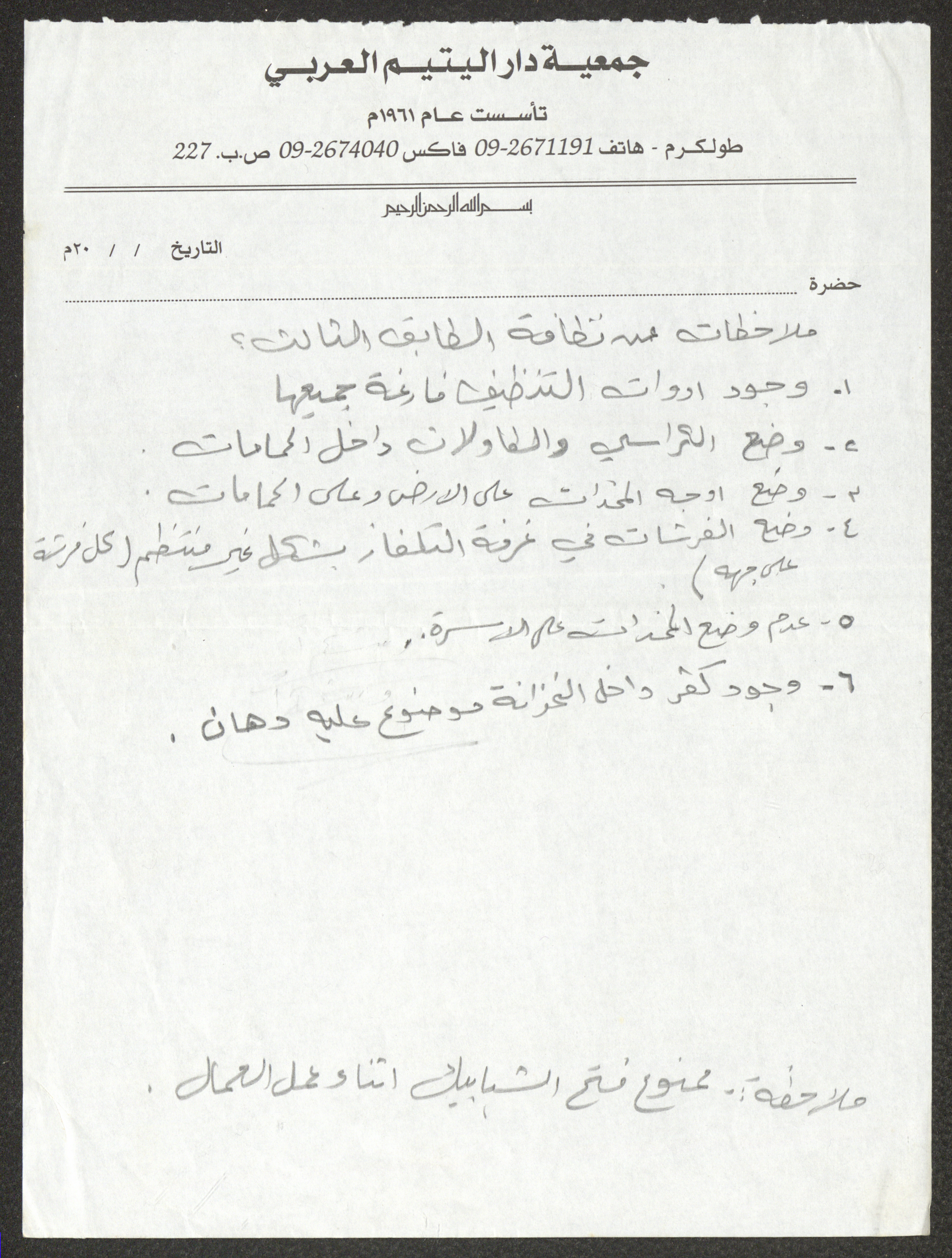 ورقة ملاحظات لجمعية دار اليتيم العربي، طولكرم