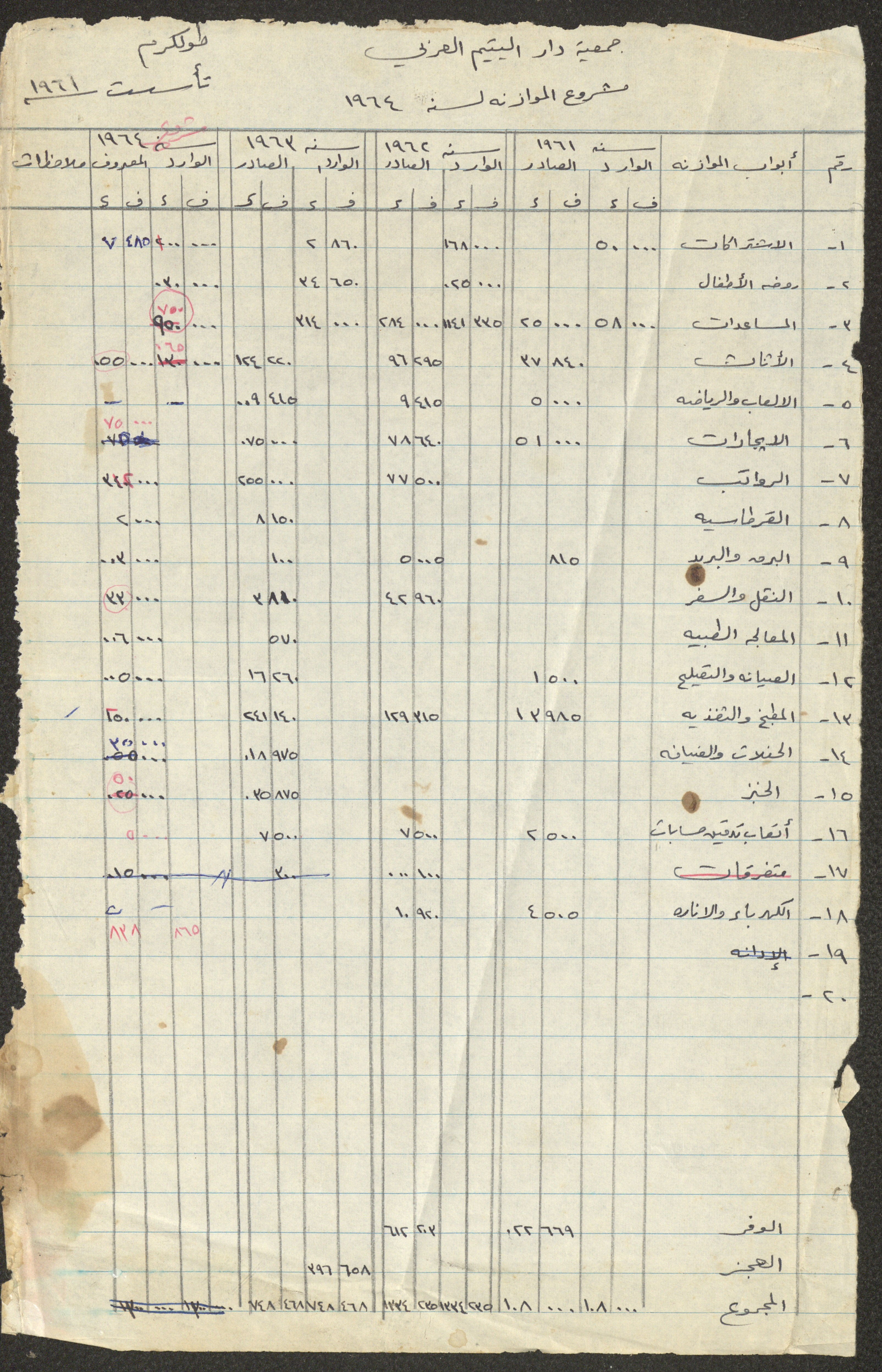 ورقة يظهر فيها مشروع موازنة جمعية دار اليتيم العربي في طولكرم من سنة 1961 حتى 1964.