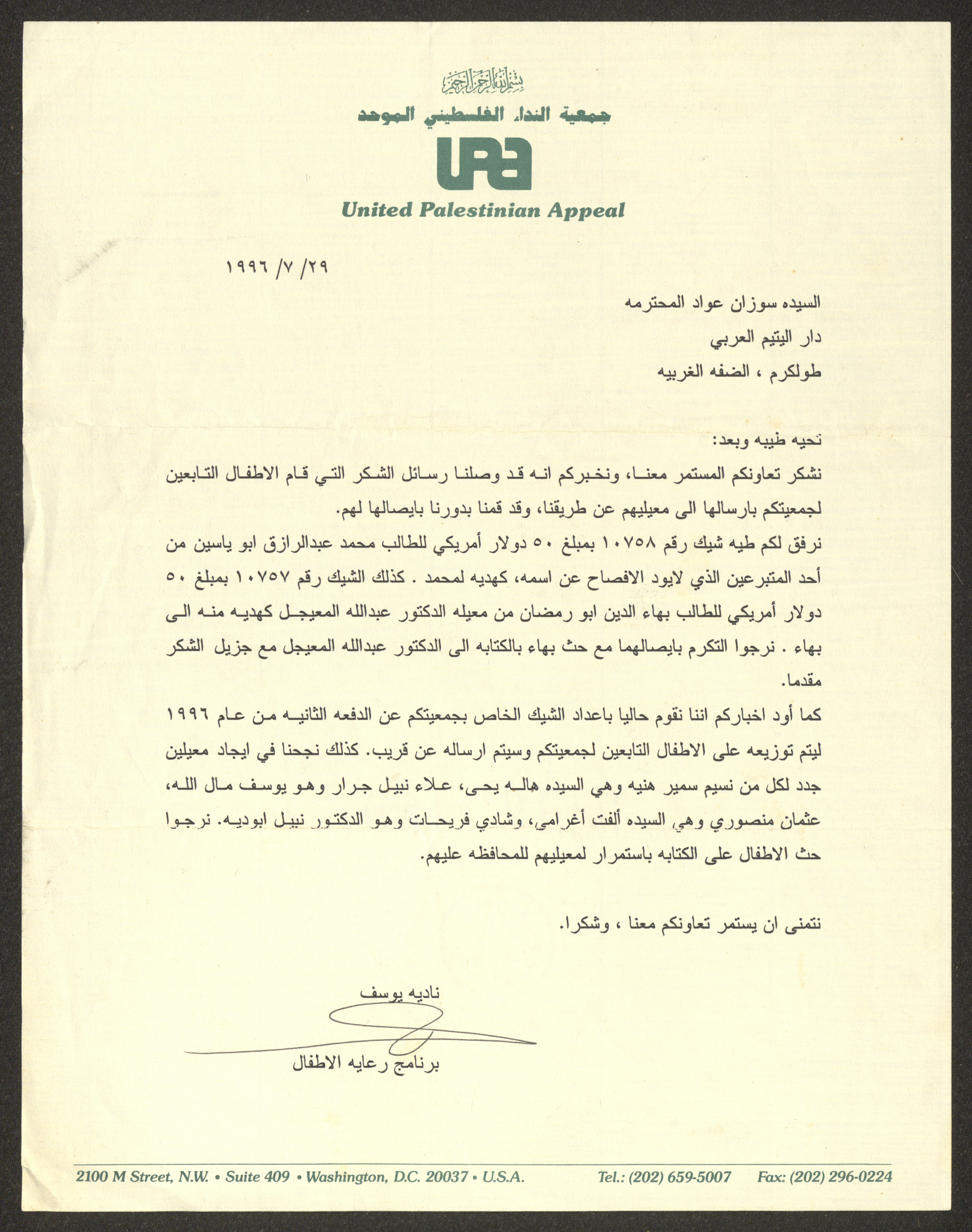 كتاب صادر عن جمعية النداء الفلسطيني الموحد لسوزان عواد في جمعية دار اليتيم العربي- طولكرم بتاريخ 29 تموز 1966، يتضمن شيكات مالية مرسلة لطلاب الجمعية.