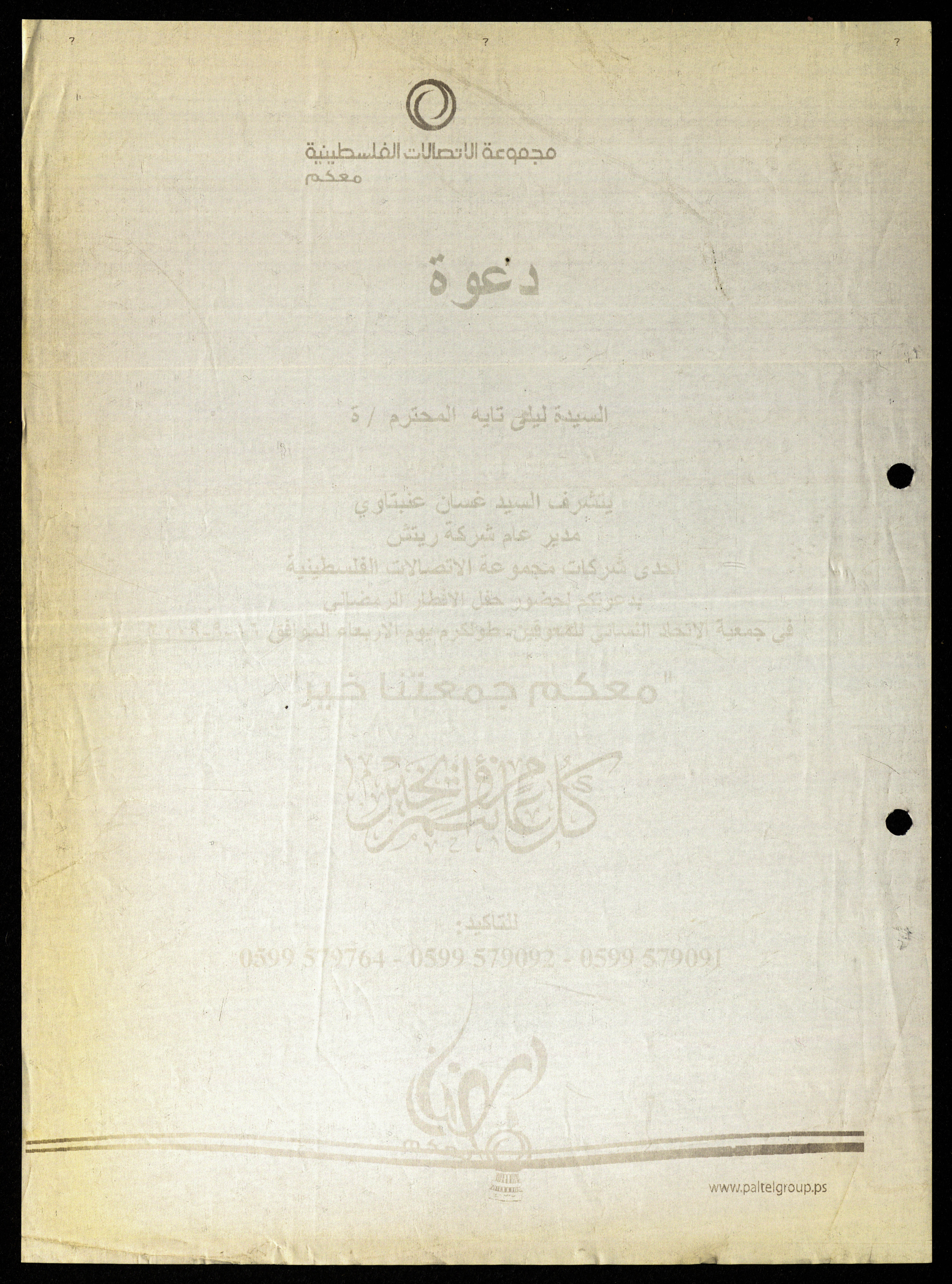 دعوة صادرة من غسان عنبتاوي مدير عام شركة ريتش التابعة لشركات مجموعة الاتصالات الفلسطينية، موجهة إلى ليلى تايه رئيسة جمعية دار اليتيم العربي، وذلك من أجل حضور حفل الإفطار الرمضاني الذي سيقام في جمعية الاتحاد النسائي للمعوقين في طولكرم بتاريخ 16 أيلول 2009.