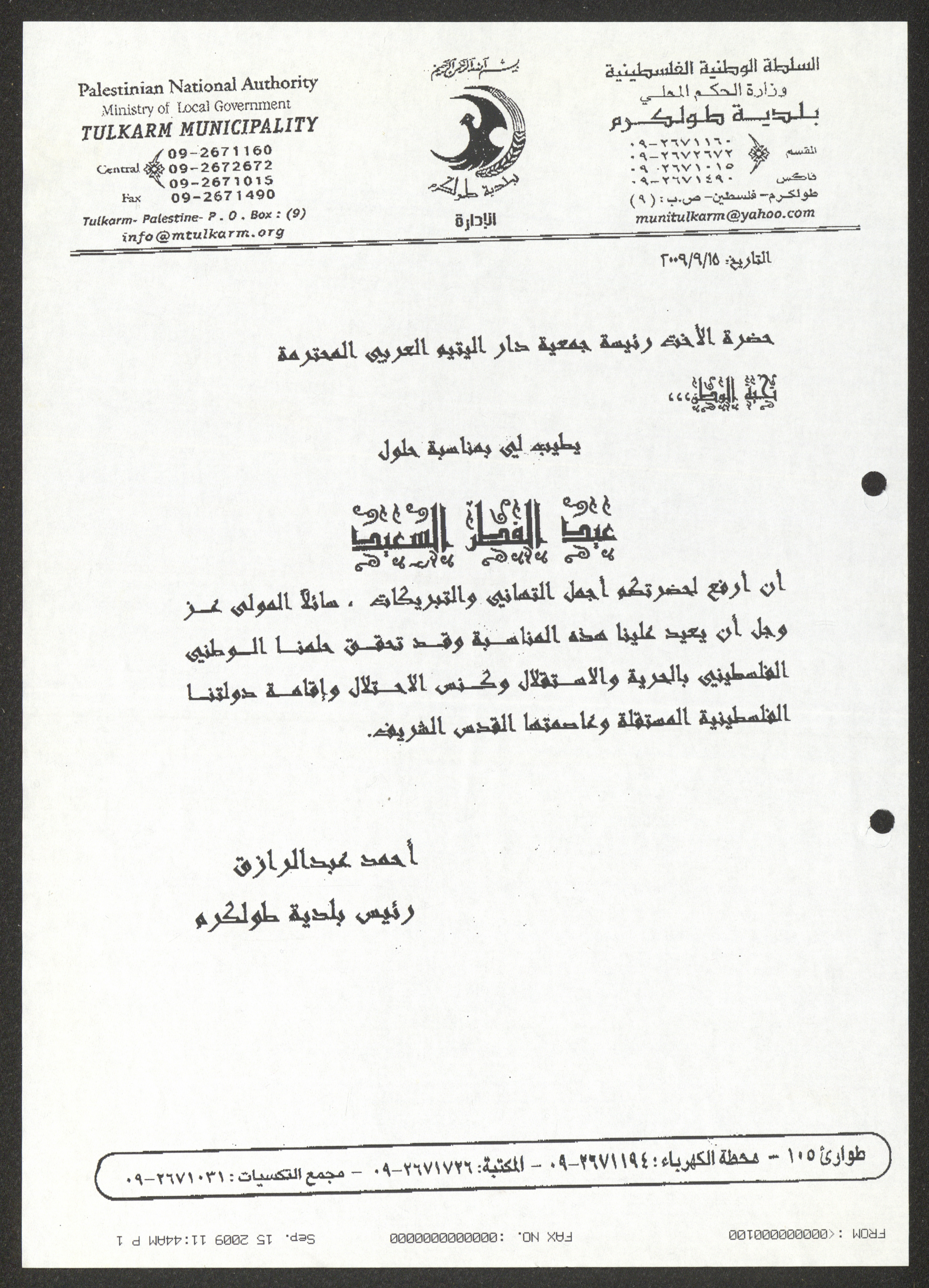 تهنئة بعيد الفطر مقدمة من أحمد عبد الرازق رئيس بلدية طولكرم إلى رئيسة جمعية دار اليتيم العربي في طولكرم، وذلك بتاريخ 15 أيلول 2009.