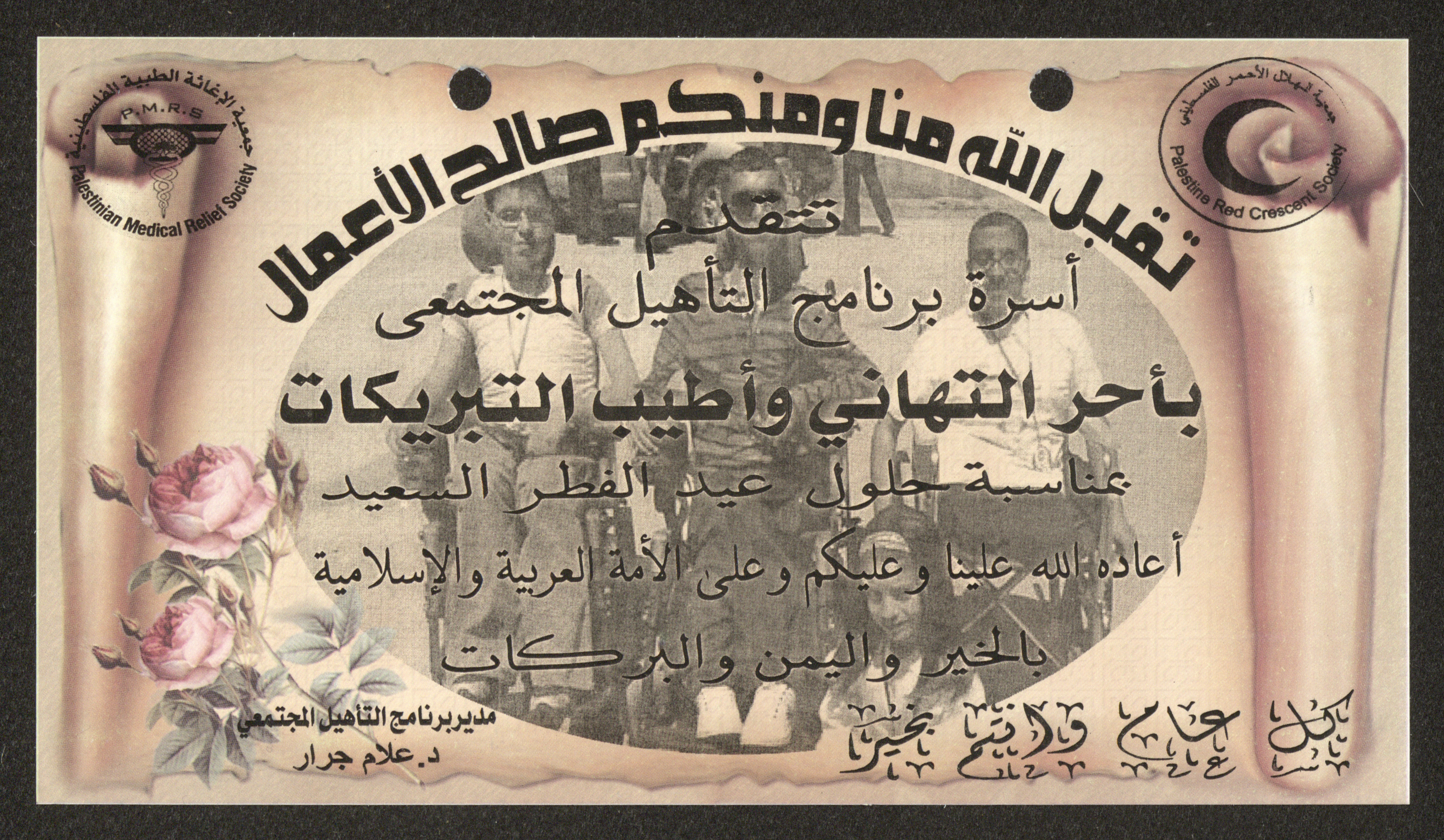 تهنئة بعيد الفطر مقدمة من علام جرار، مدير برنامج التأهيل المجتمعي في جمعية الهلال الأحمر الفلسطيني إلى جمعية دار اليتيم العربي في طولكرم، وذلك بتاريخ 15 أيلول 2009.