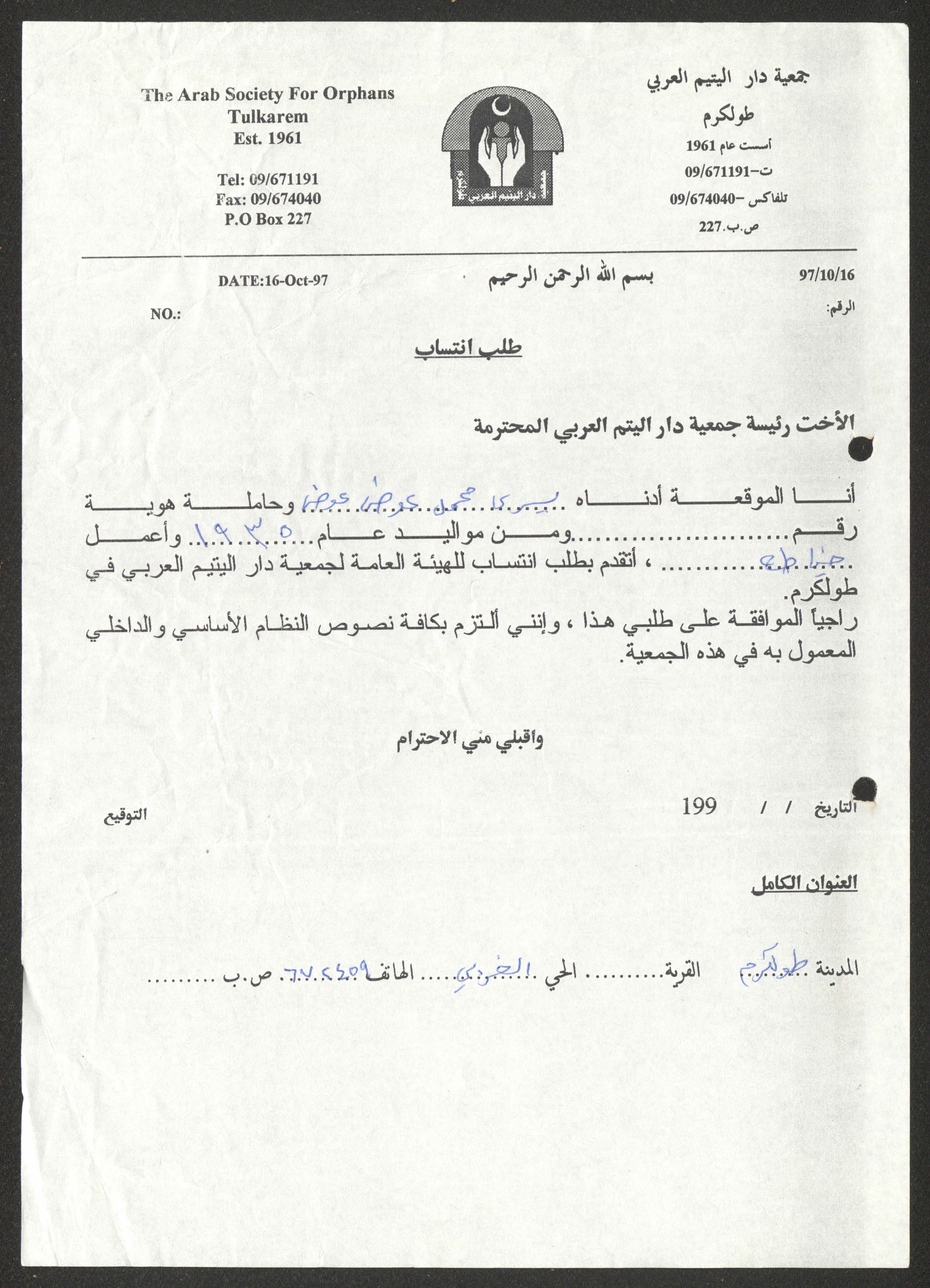 طلب انتساب للهيئة العامة لجمعية دار اليتيم العربي، طولكرم، 16 تشرين الأول 1997
