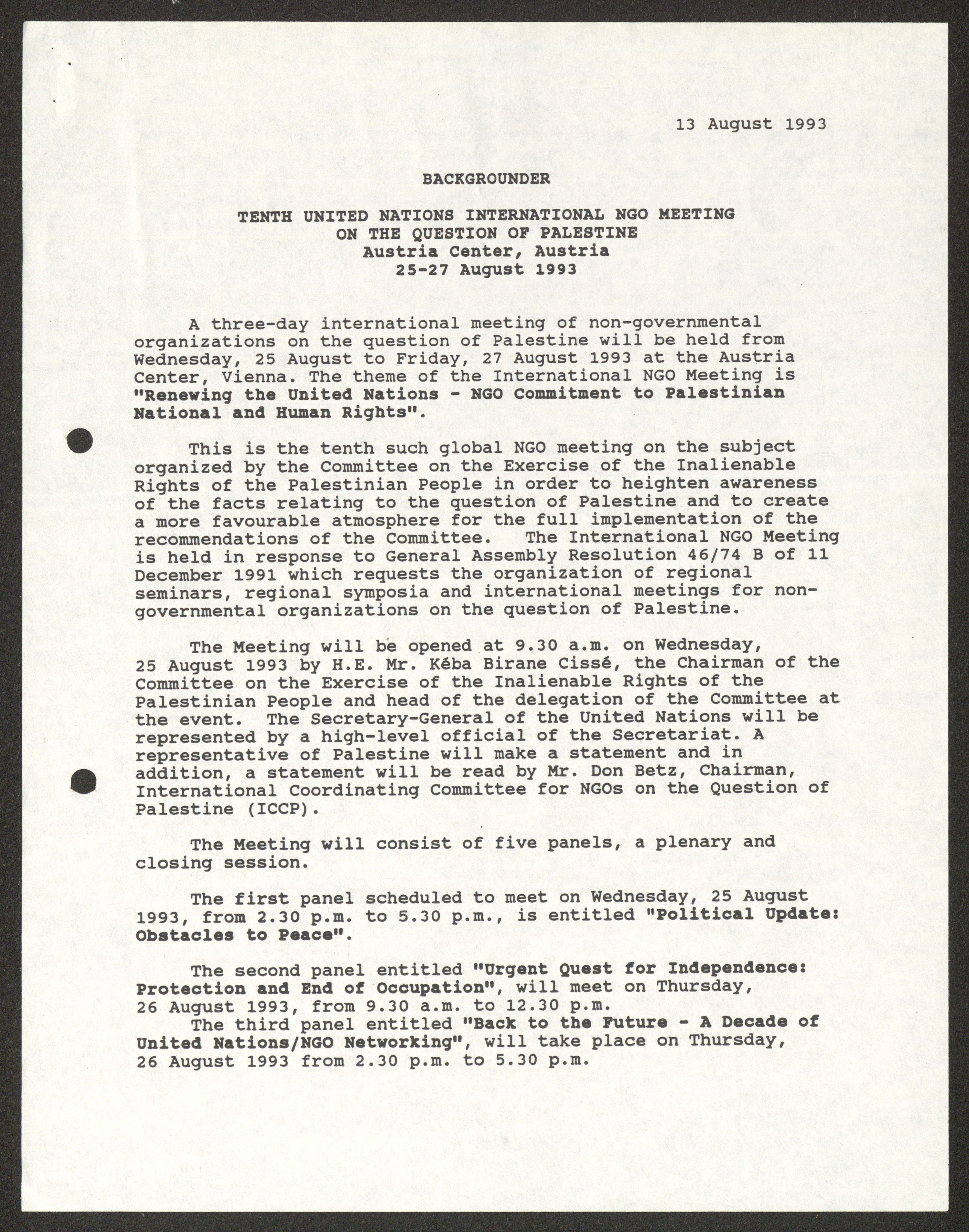 وثيقة تحمل معلومات تخص اللقاء العاشر لمنظمات المجتمع المدني في مسألة فلسطين التابعة لجمعية الأمم المتحدة، والمنعقد في مركز النمسا في فيينا، ما بين 25 و27 آب 1993.
