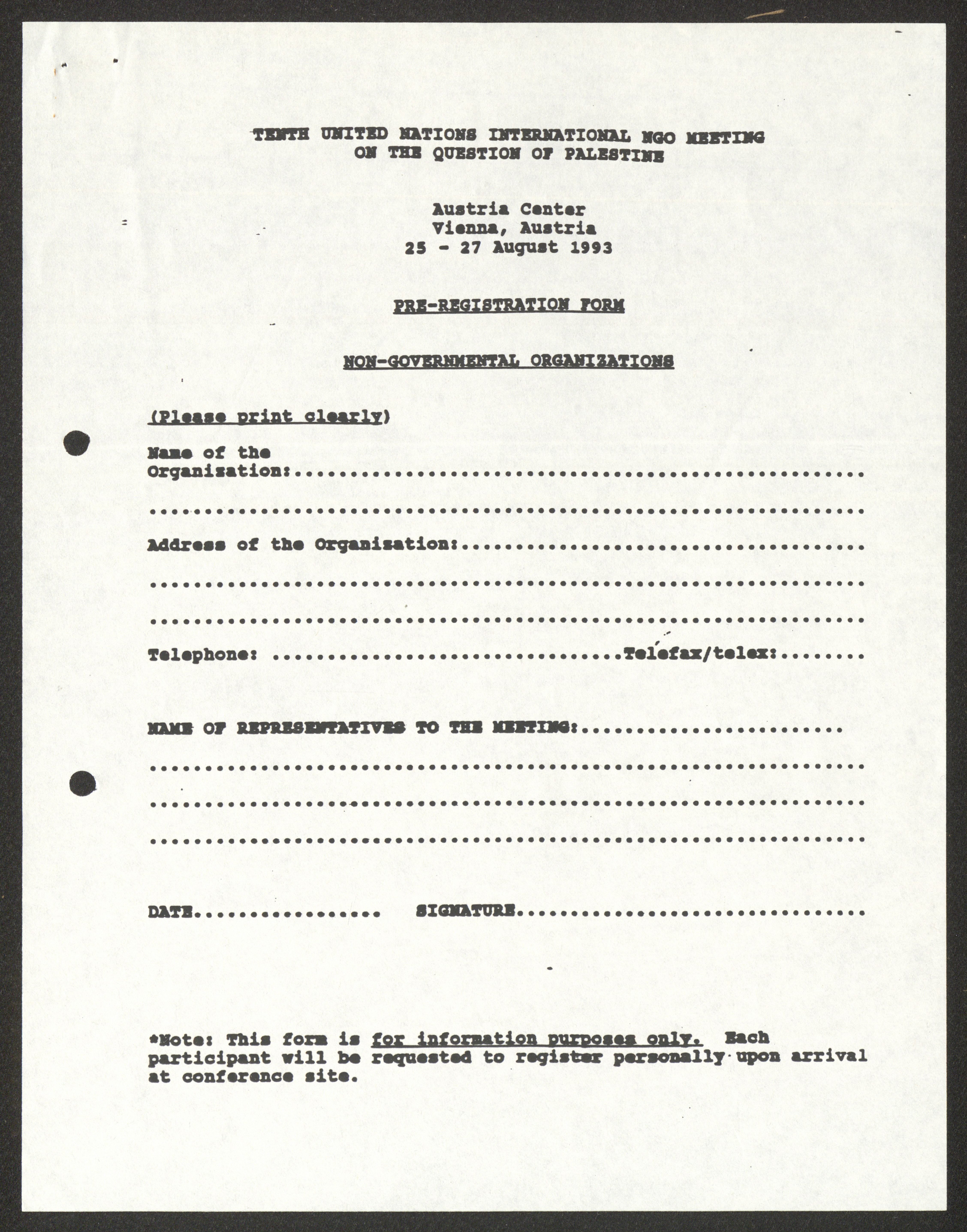 نموذج تسجيل حضور يخص اللقاء العاشر لمنظمات المجتمع المدني في مسألة فلسطين التابعة لهيئة الأمم المتحدة، والمنعقد في فيينا- النمسا، ما بين 25 و27 آب 1993، خُصِّصَت مساحات فارغة في النموذج لتعبئة معلومات الجمعيات المشاركة مع ممثليها وعناوينها وأرقام الاتصال الخاصة بها.