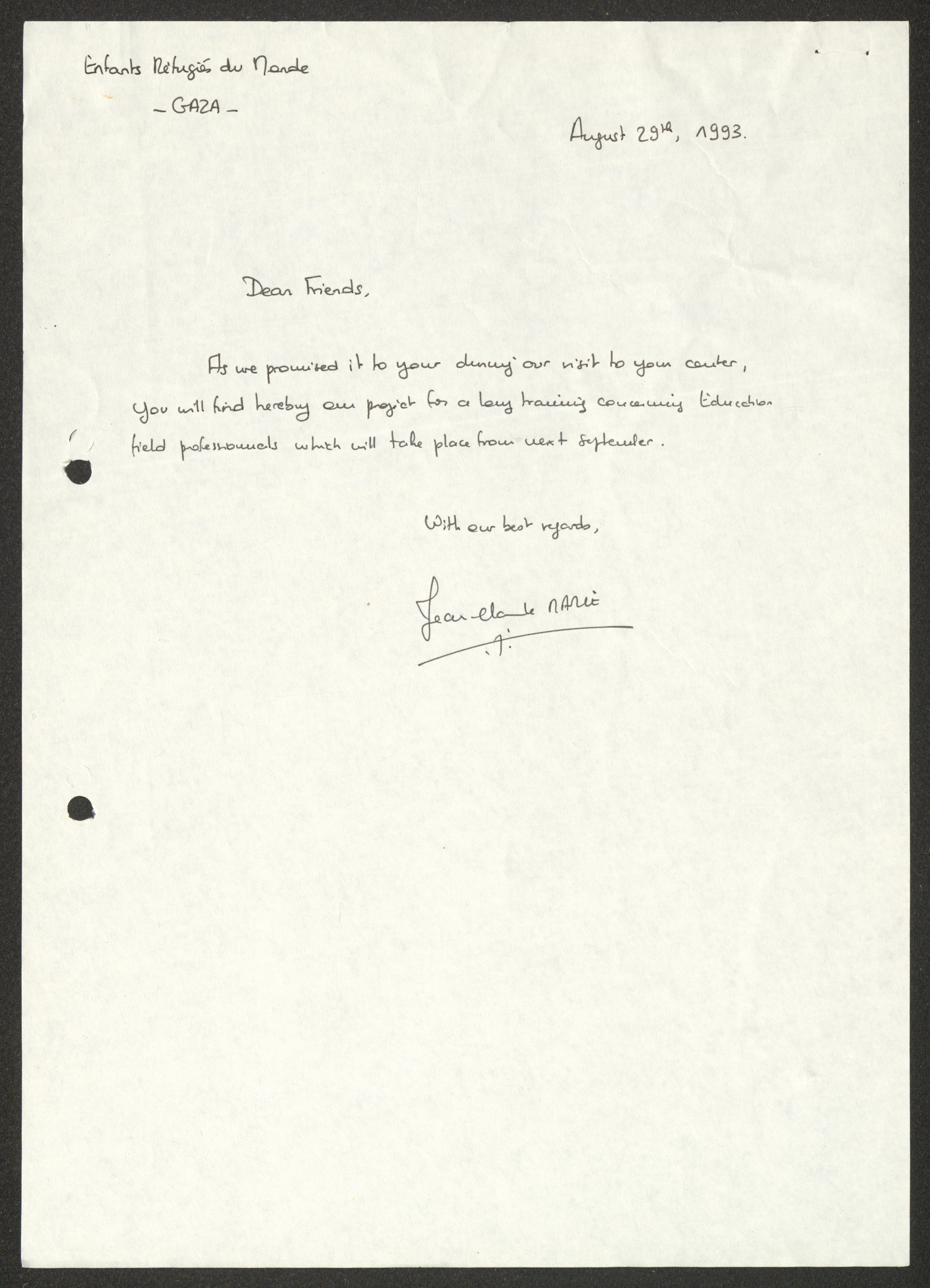 رسالة من مركز للأطفال في غزة إلى جمعية دار اليتيم العربي في طولكرم بتاريخ 29 آب 1993، لإبلاغهم بنيتهم القدوم لزيارة الجمعية، هذا وتحمل الرسالة معلومات تتعلق بتدريب سيقام في أيلول.
