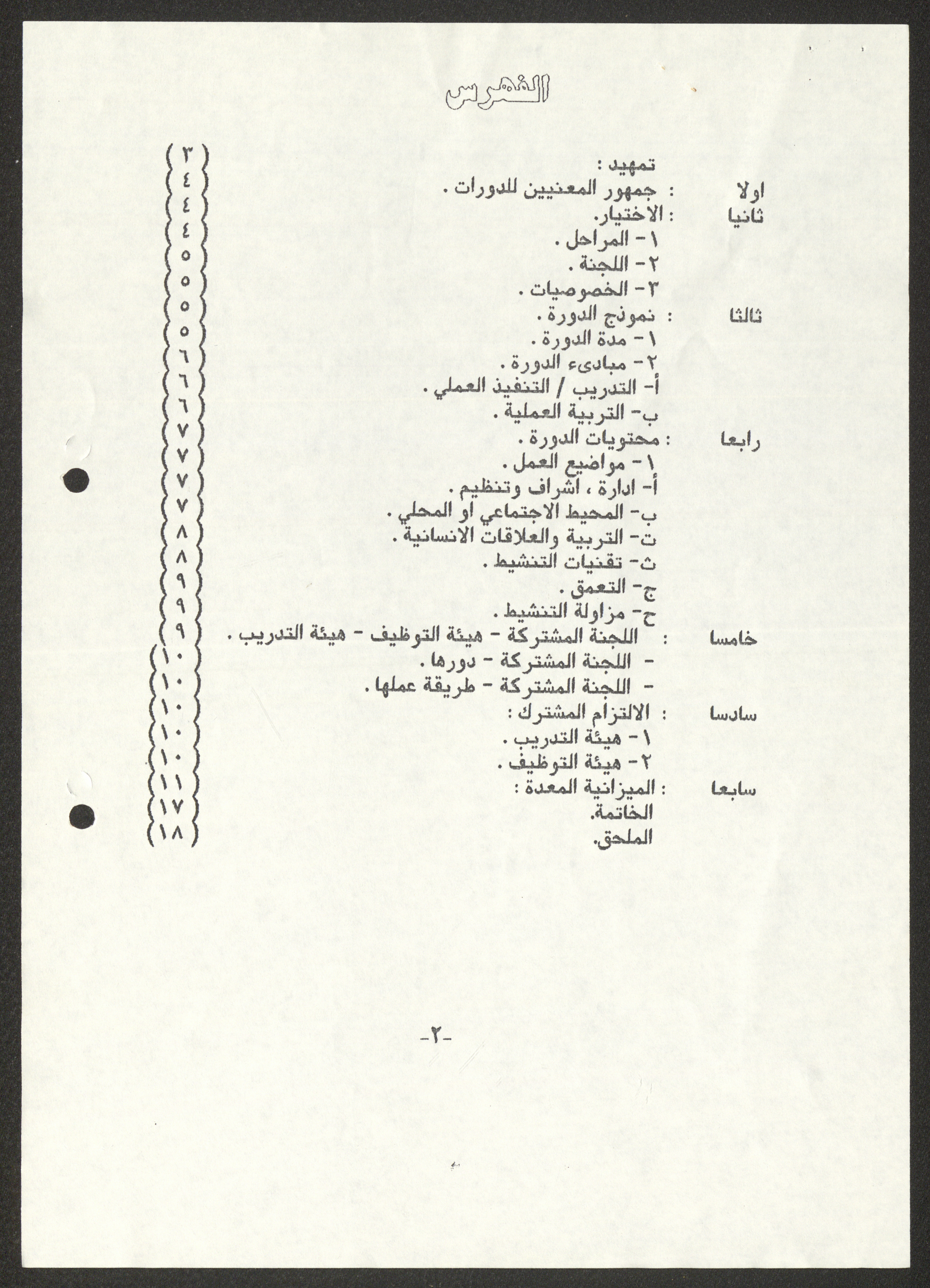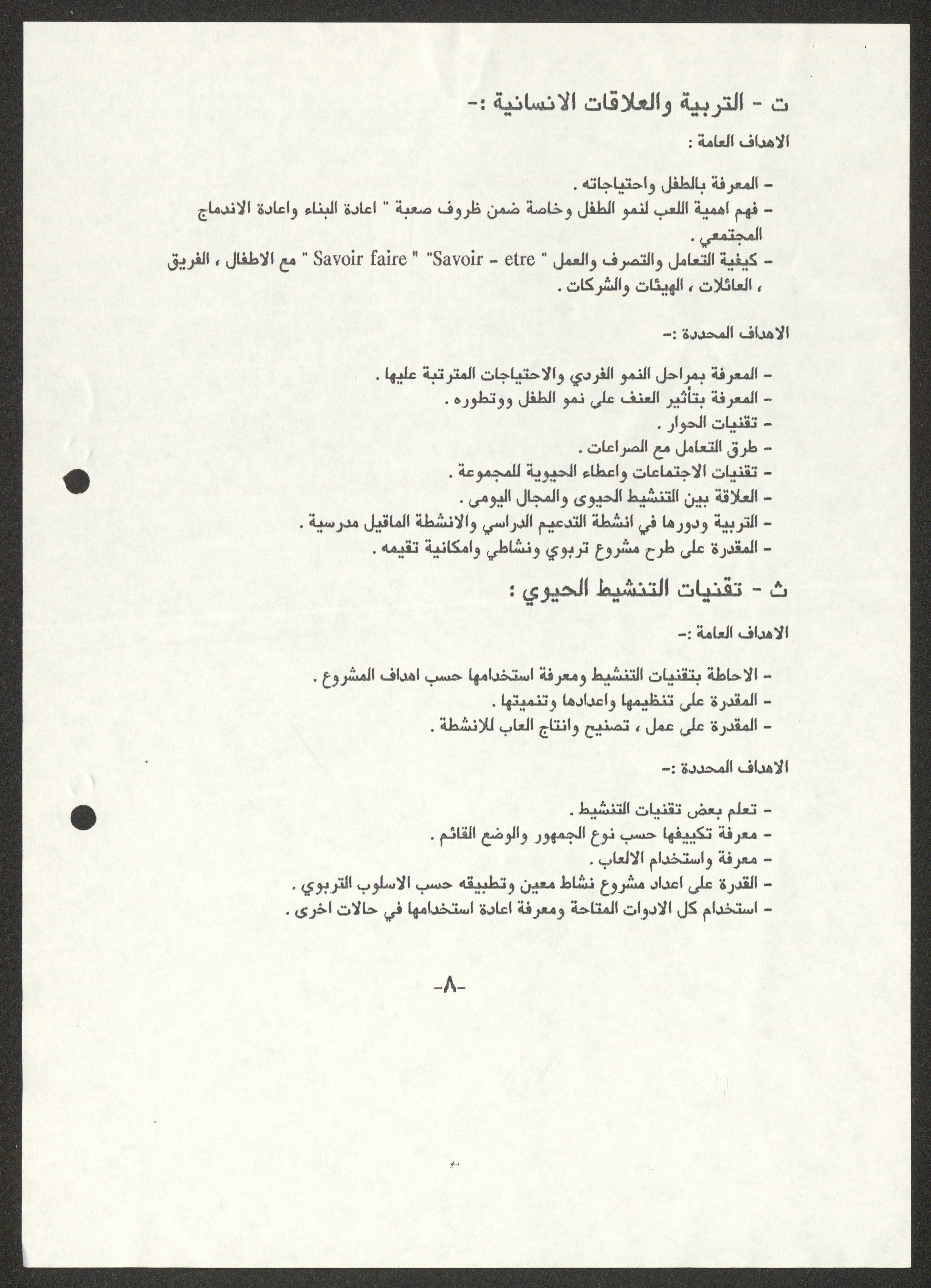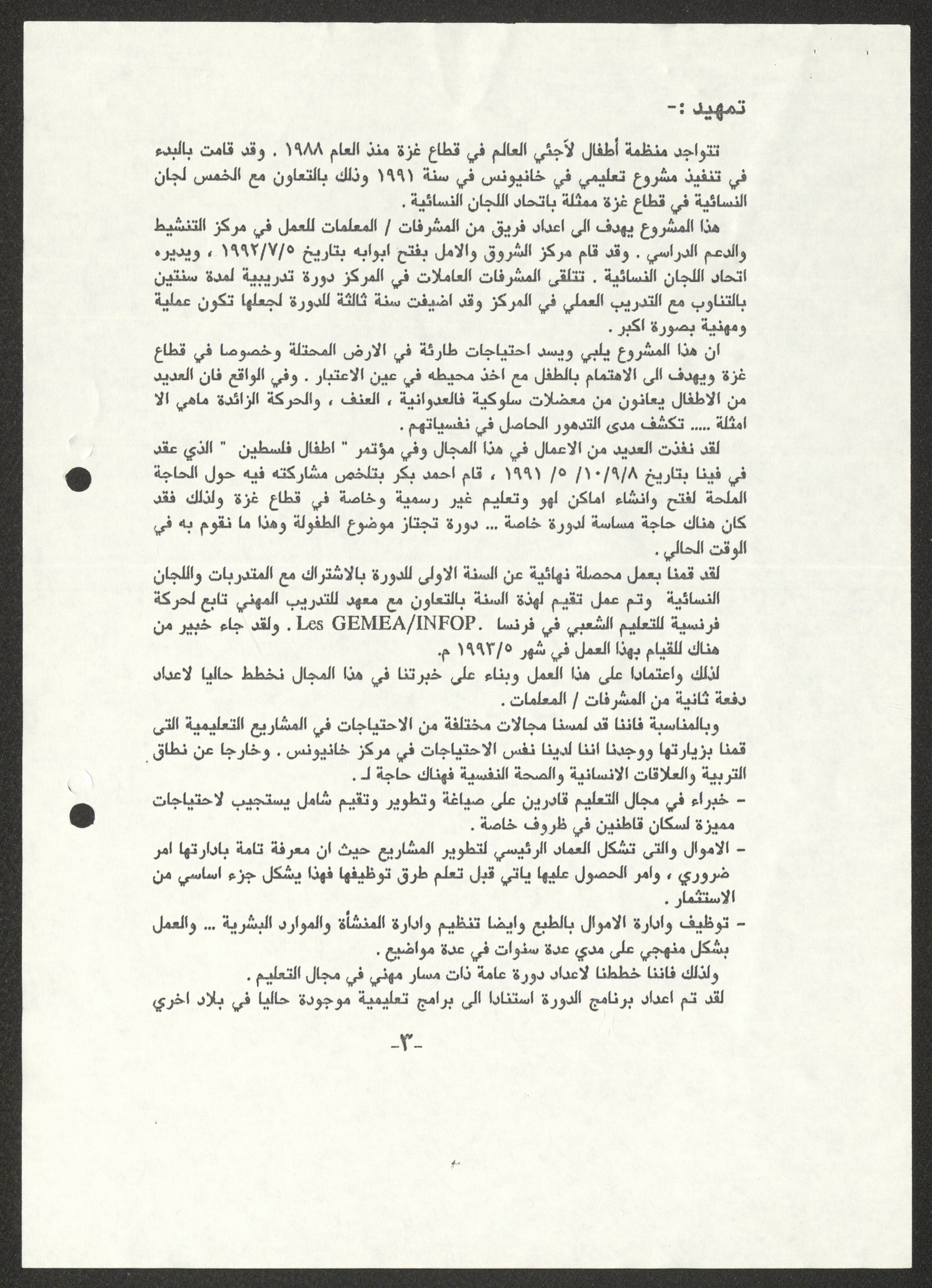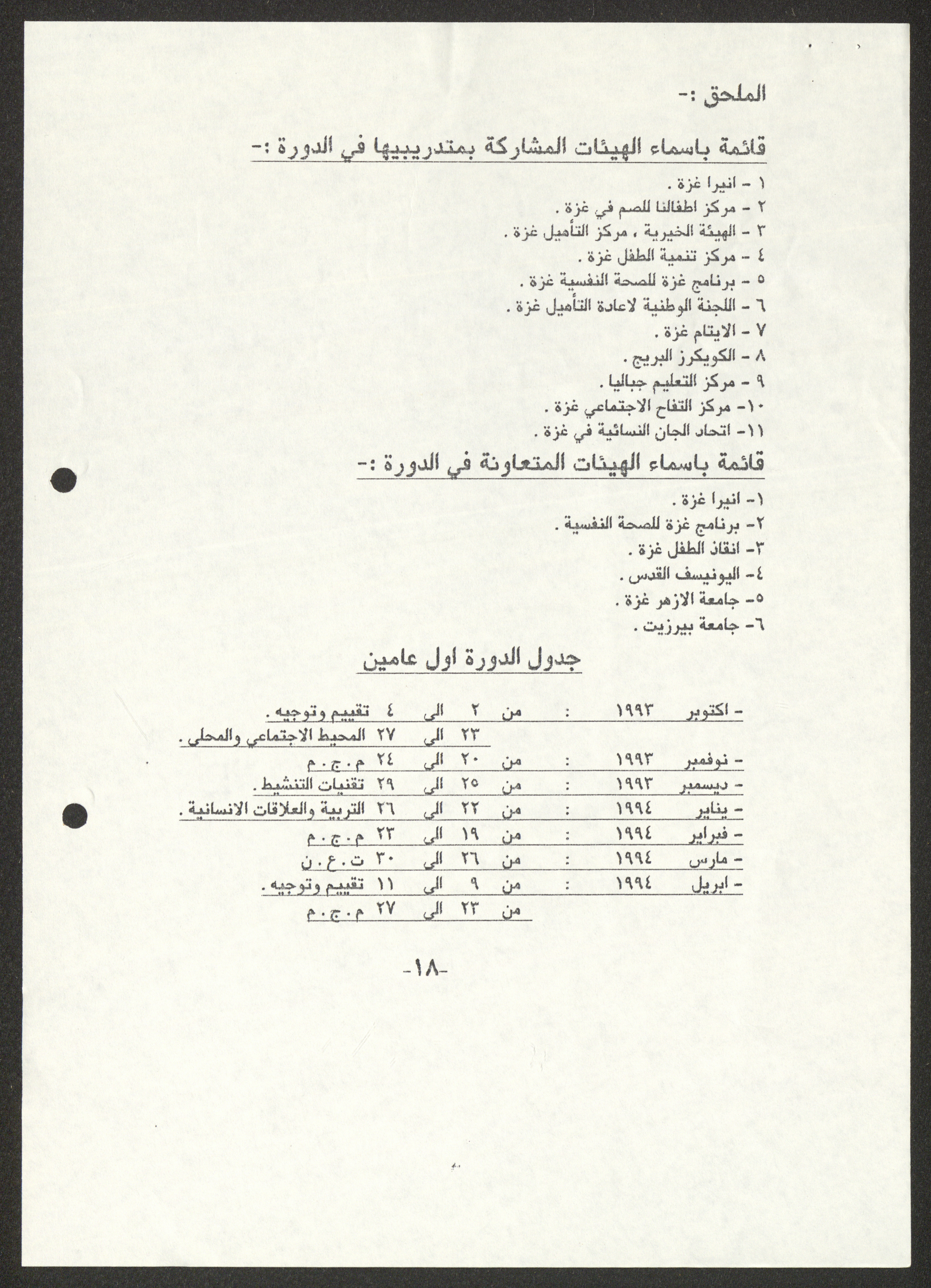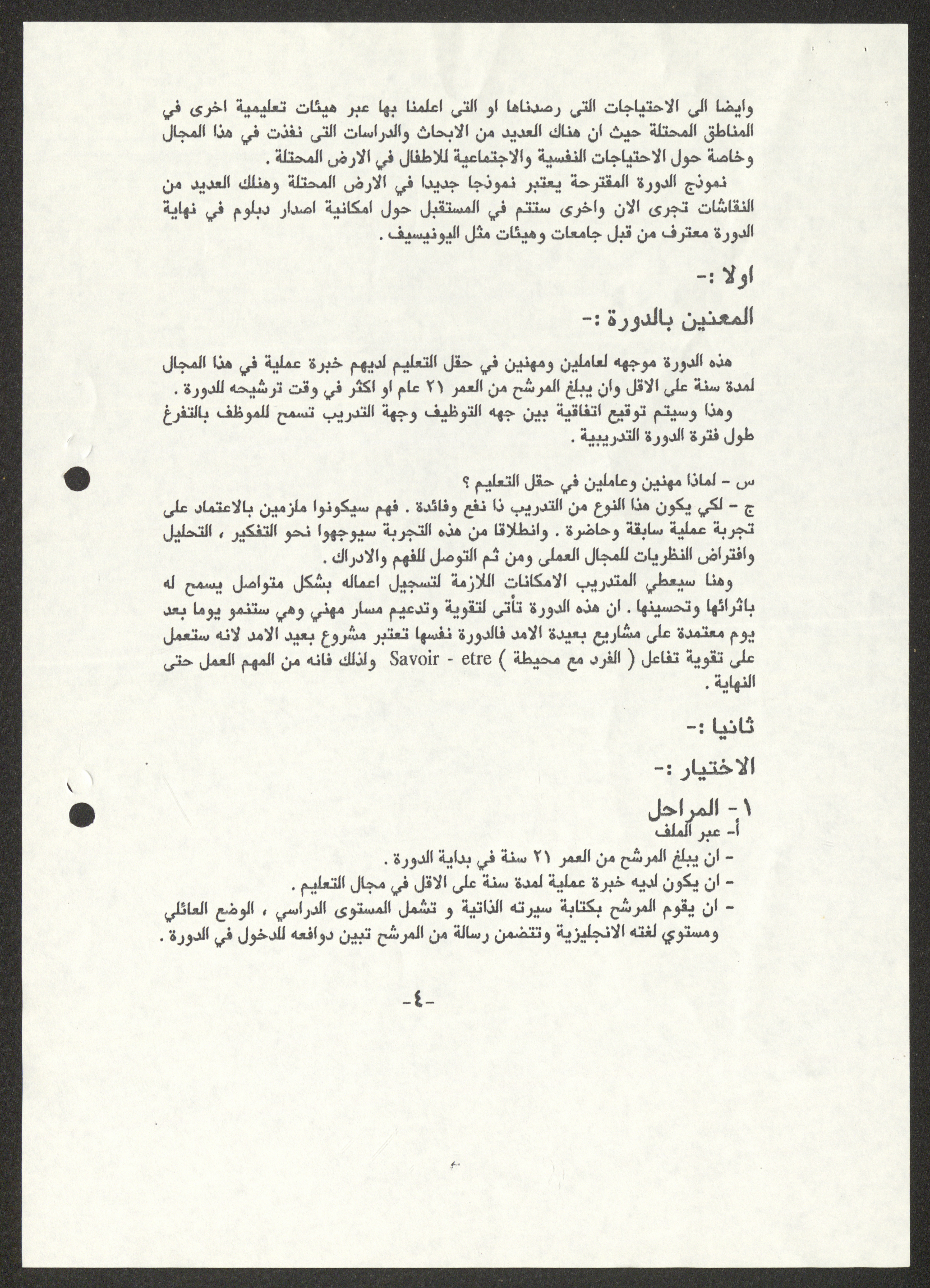جزء من كتاب يحتوي على 18 صفحة، يتضمن ورشات تدريبية موجهة للعاملين والمهنيين في حقل التعليم ضمن شروط معينة، إضافة لمعلومات حول التدريب، والفترة التي سيعقد فيها، أي في تشرين الأول 1993.