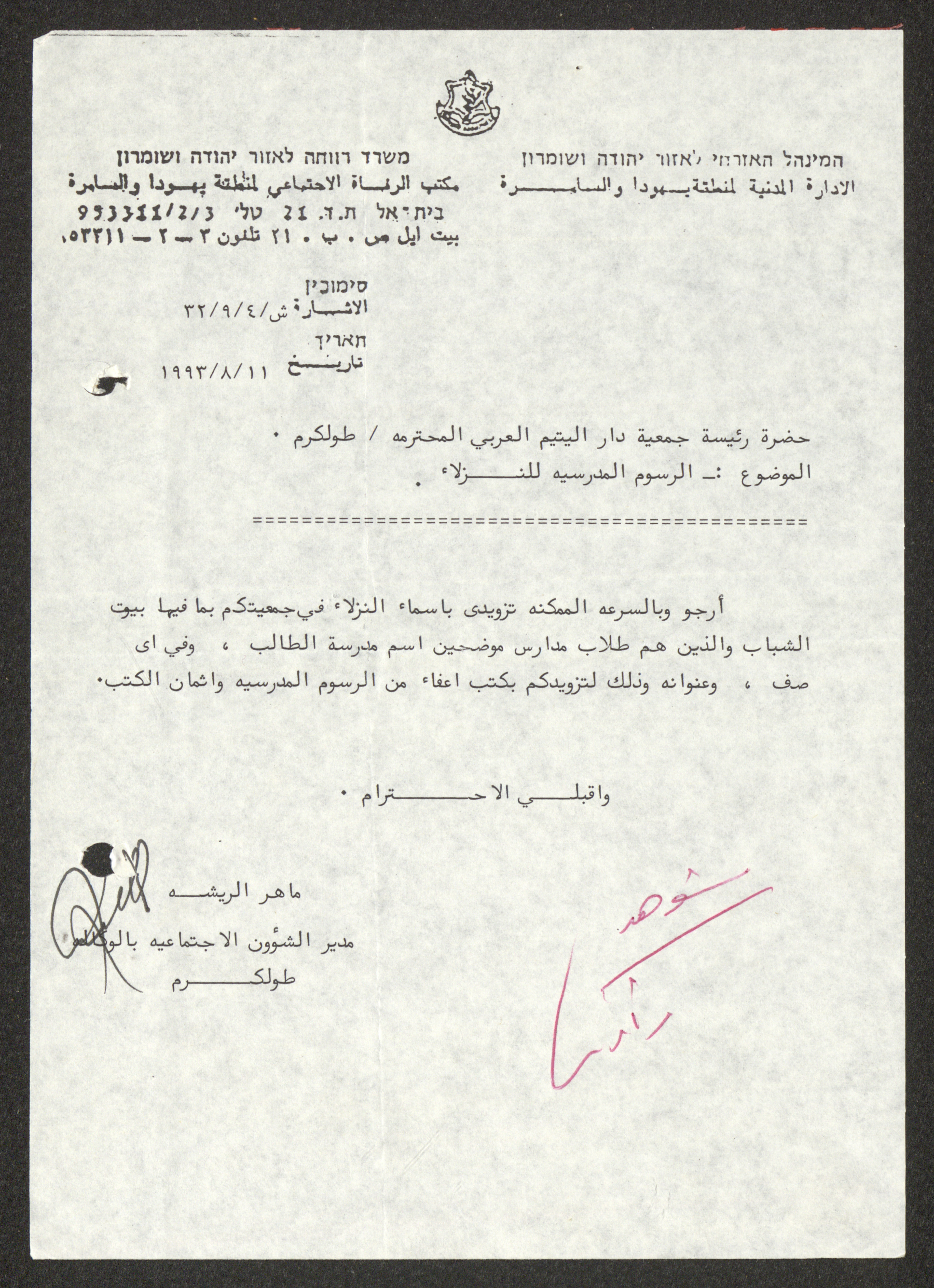 كتاب أرسله ماهر الريشة مدير الشؤون الاجتماعية في طولكرم التابعة للإدارة المدنية، إلى رئيسة جمعية دار اليتيم العربي في طولكرم، بتاريخ 11 آب 1993، يتحدث فيه حول إعفاء نزلاء الجمعية من الرسوم المدرسية وثمن الكتب.