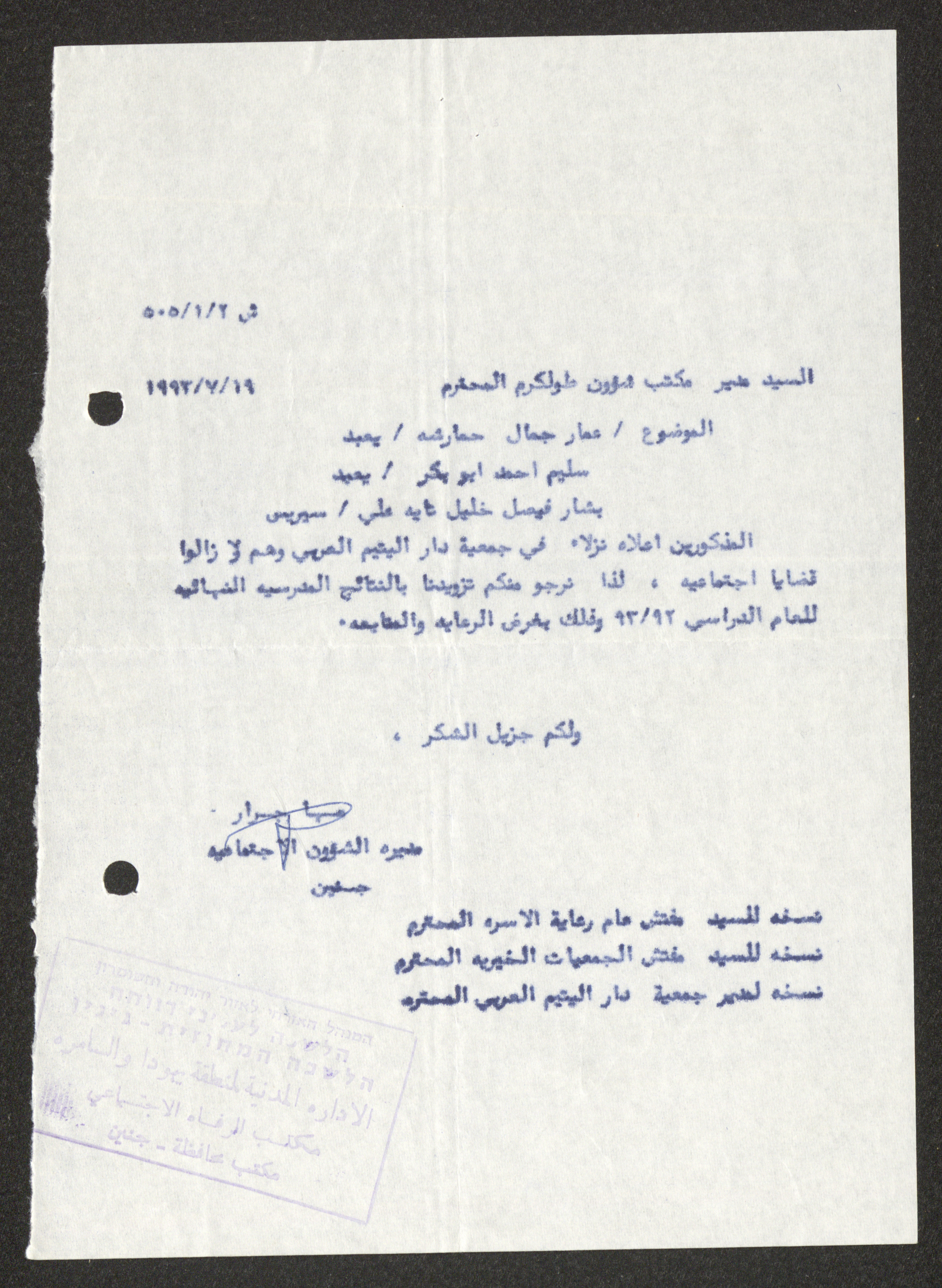 كتاب أرسلته مها جرار مديرة الشؤون الاجتماعية في جنين، إلى مدير مكتب شؤون طولكرم بتاريخ 19 تموز 1993، تطلب منه فيه تزويدهم بالنتائج المدرسية لعمار حمارشة، وسليم أبو بكر، وبشار تايه علي، النزلاء في جمعية دار اليتيم العربي في طولكرم.