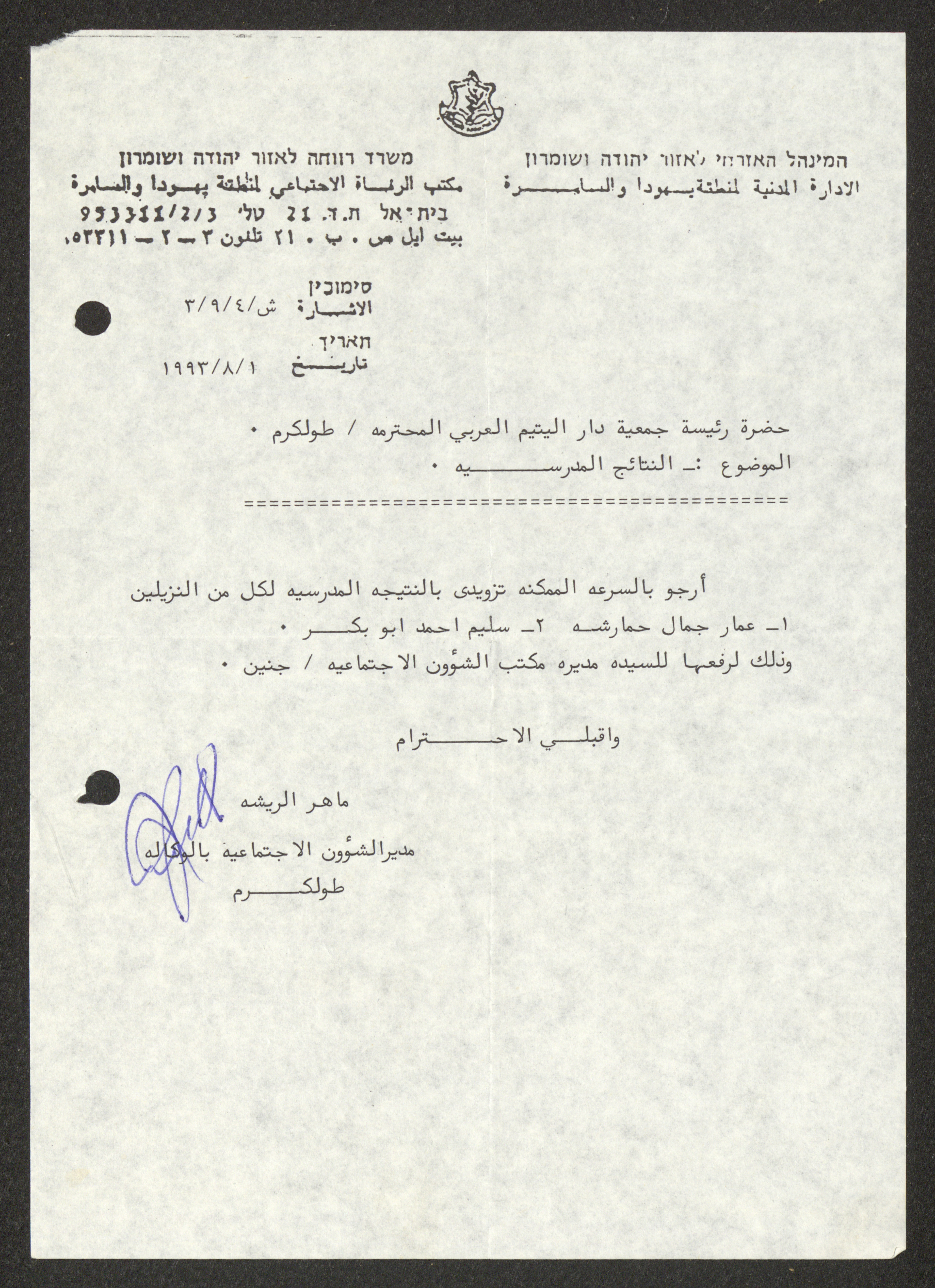 كتاب أرسله ماهر الريشة مدير الشؤون الاجتماعية بالوكالة التابعة للإدارة المدنية، بتاريخ 1 آب 1993، إلى رئيسة جمعية دار اليتيم العربي في طولكرم، يطلب منها فيه تزويده بالنتائج المدرسية لكل من عمار حمارشة وسليم أبو بكر.