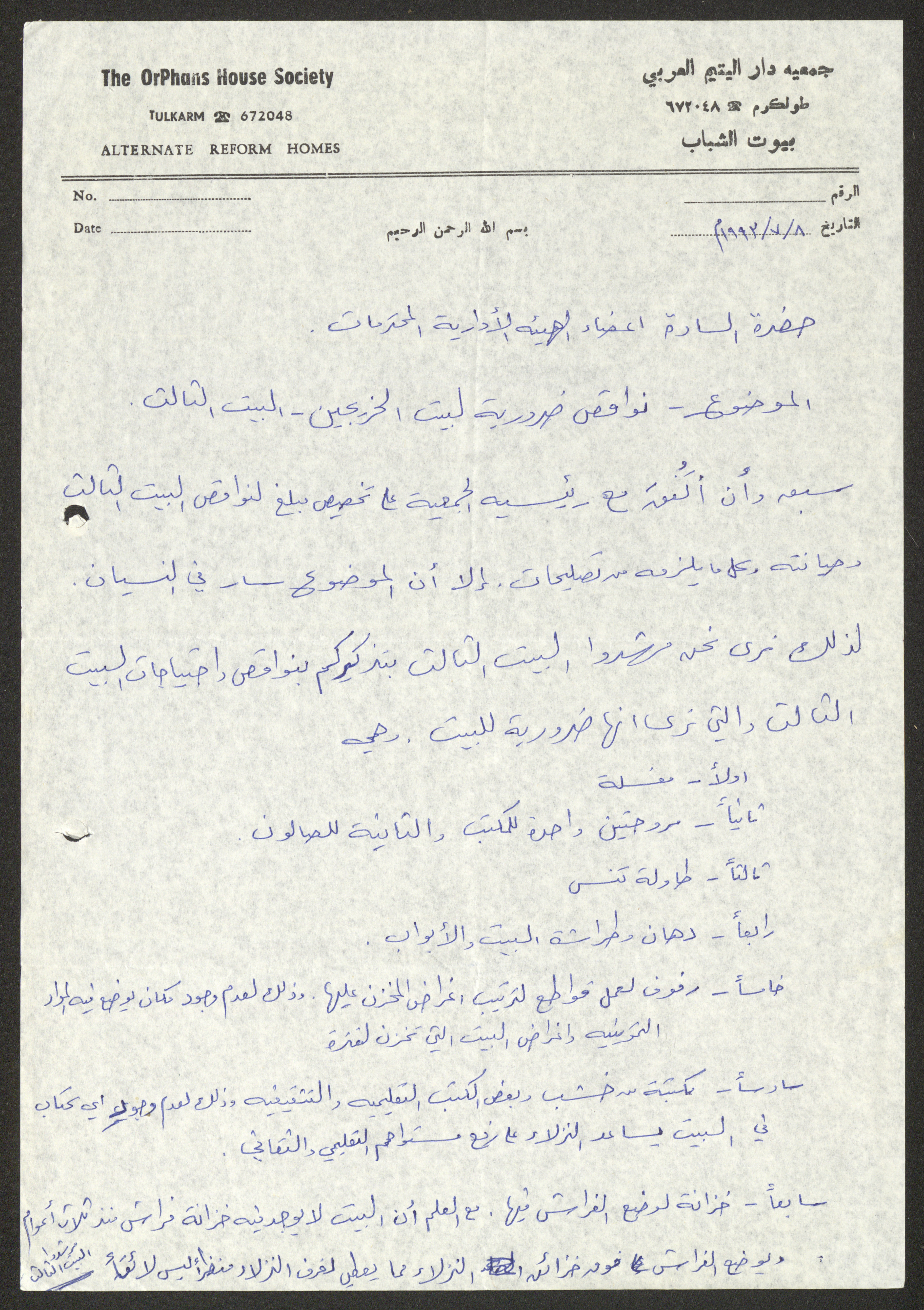 رسالة من مرشدي بيت الخريجين "البيت الثالث" التابع لجمعية دار اليتيم العربي في طولكرم إلى أعضاء الجمعية بتاريخ 8 تموز 1993، يطلبون فيها توفير بعض الاحتياجات.