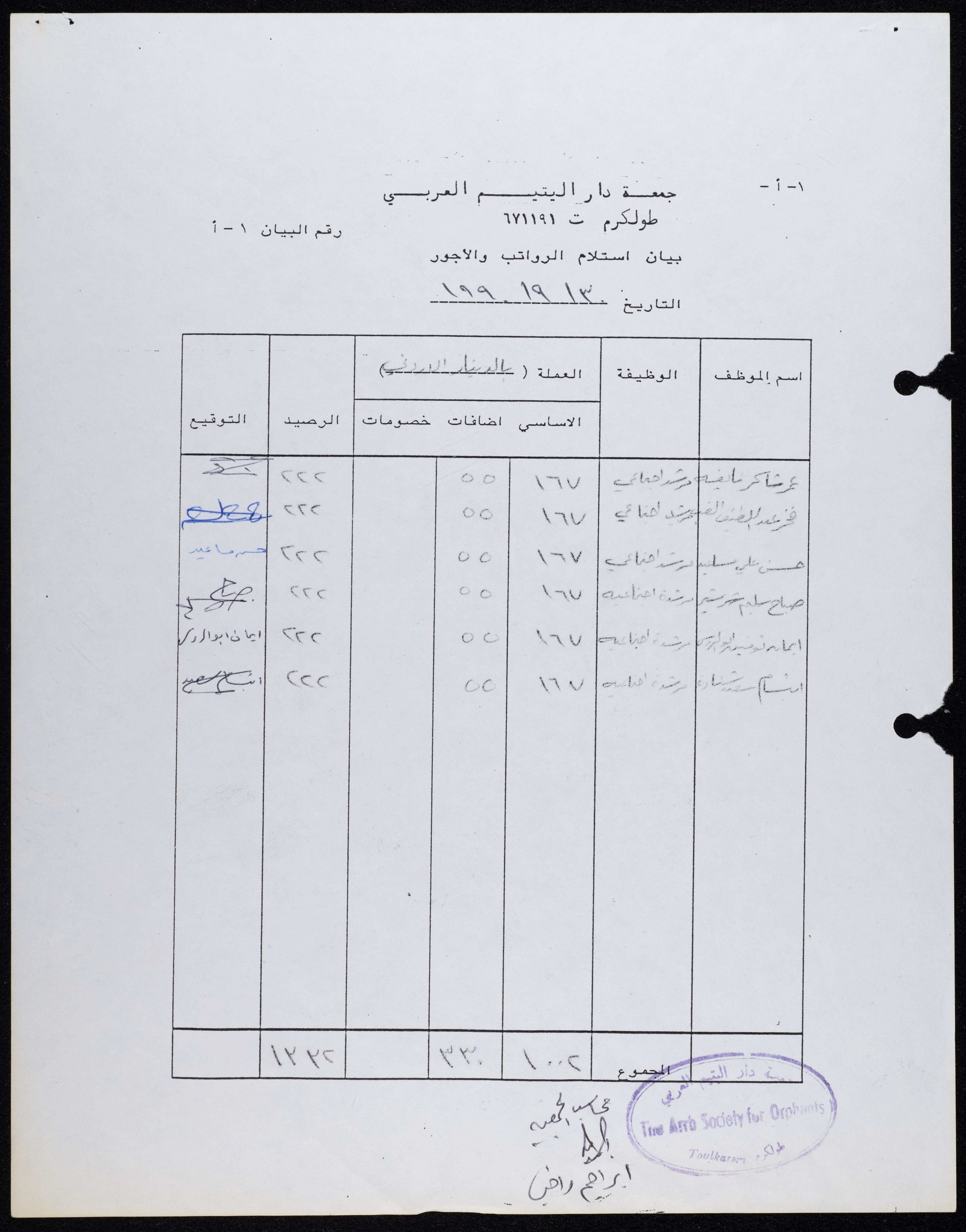 بيان استلام صادر عن محاسب جمعية دار اليتيم العربي في طولكرم بتاريخ 30 أيلول 1990، يظهر فيه رواتب وأجور الأخصائيين الاجتماعيين والنفسيين للجمعية.